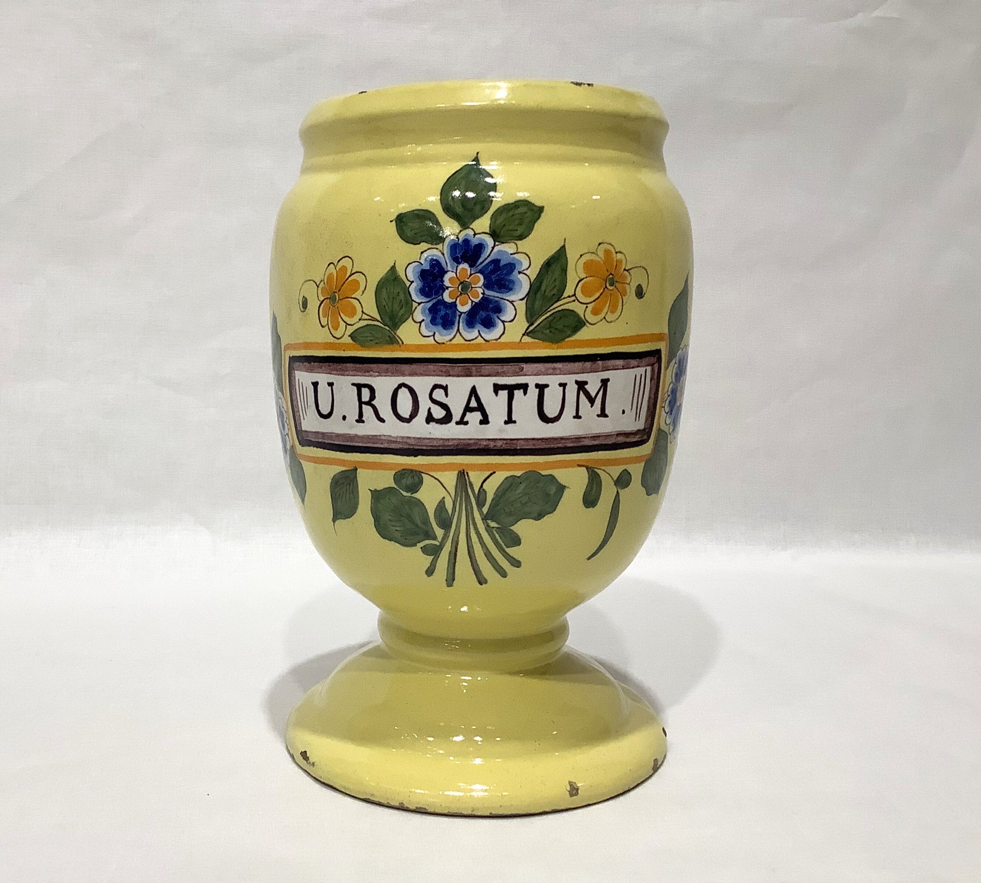 Antique, 17th century, Italian apothecary jar. Made of faience, otherwise known as a fine tin glaze pottery. Jar is in rare yellow color and condition is consistent with age. Jar originally held Rosatum, a powder used in traditional medicine, made from red roses, liquorice, aloeswood, yellowheart, cinnamon, cloves, mace, gum tragacanth, nutmegs, cardamoms, galangals, spikenard, ambergris, and musk. Jar still carries a trace scent.