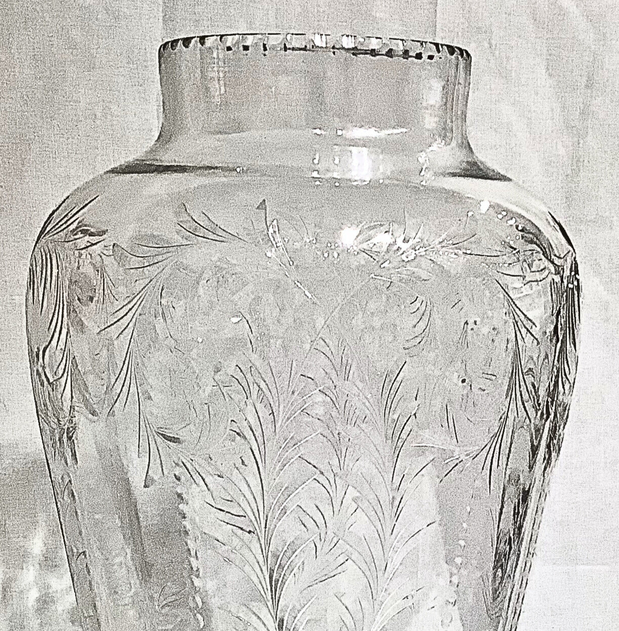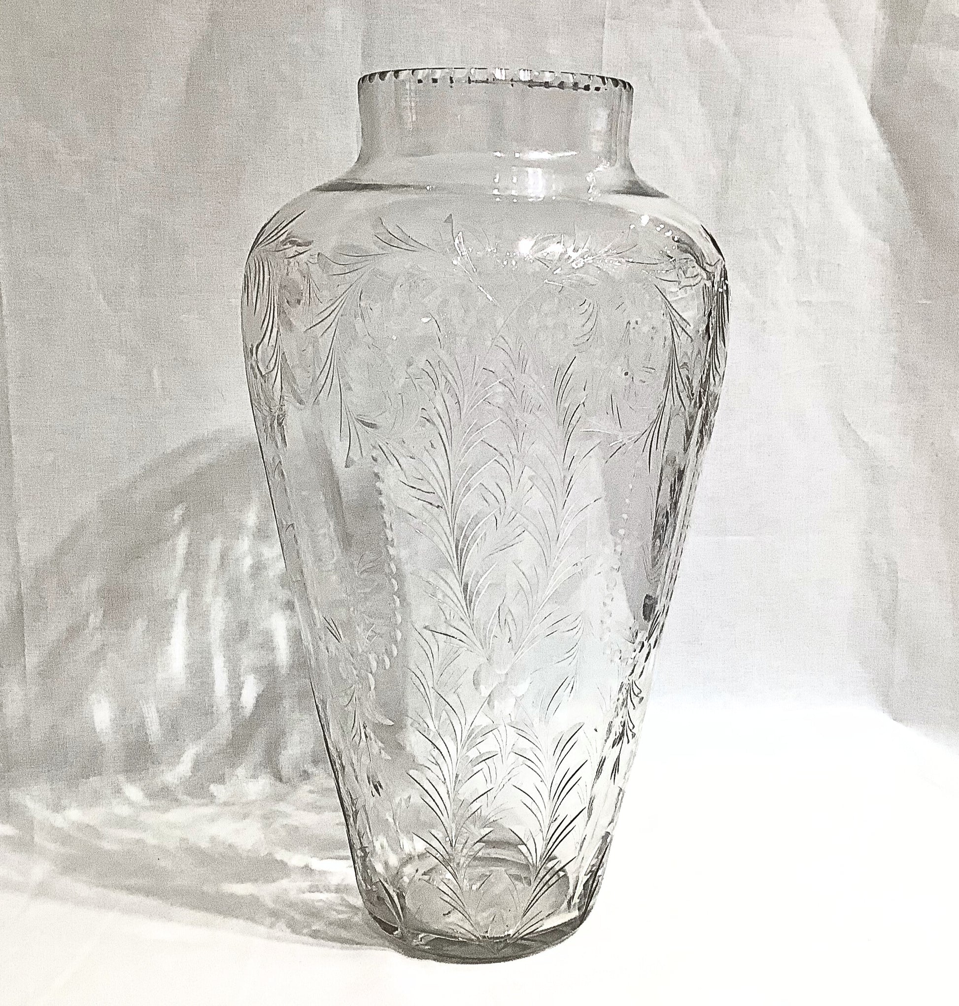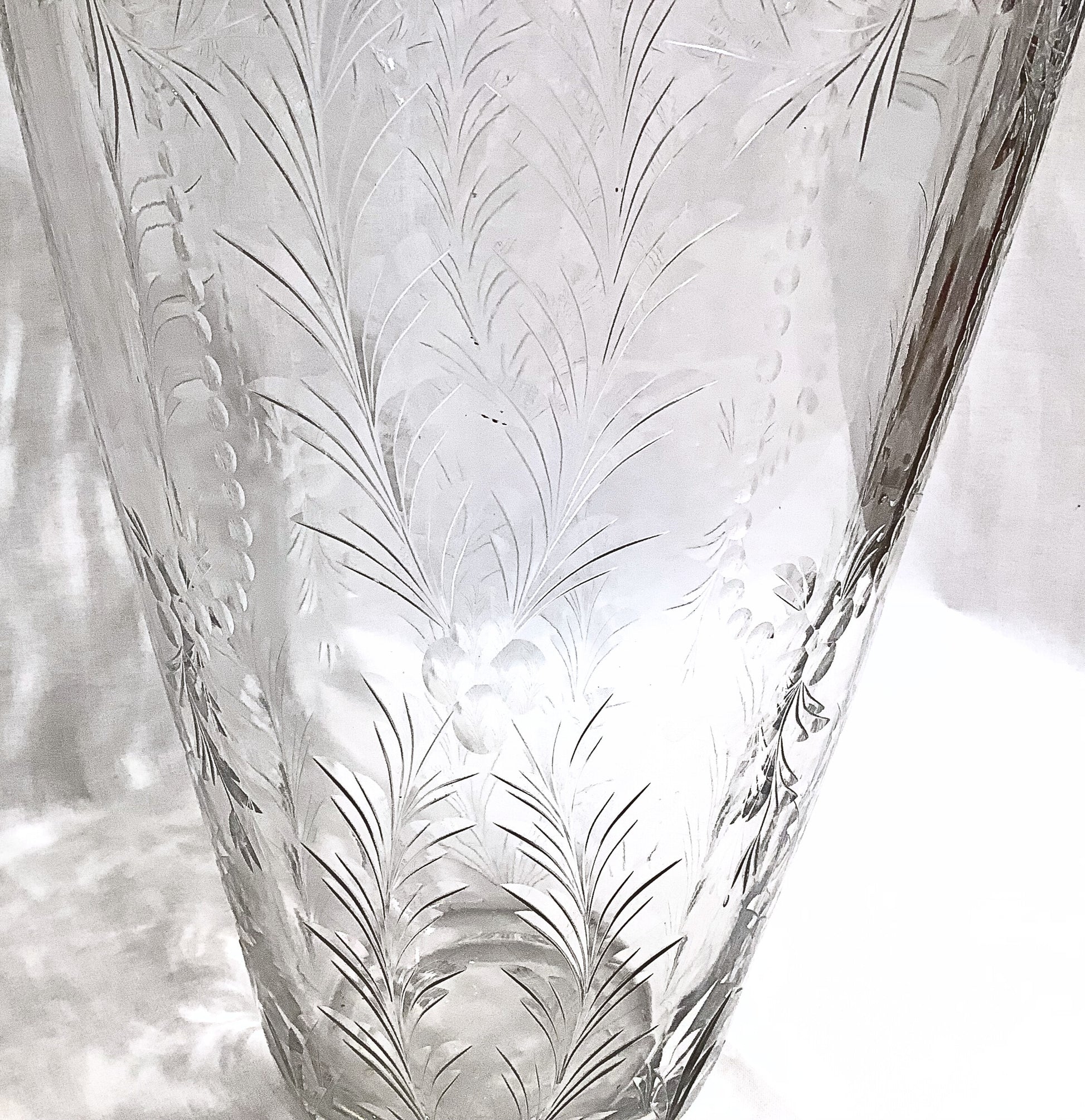 This Victorian cut crystal vase is of exquisite quality and craftsmanship, with deep and precise handmade cuts in a leaf and floral pattern.. It is also in excellent condition, with not a flaw to be found. This vase would make statement with or without flowers.