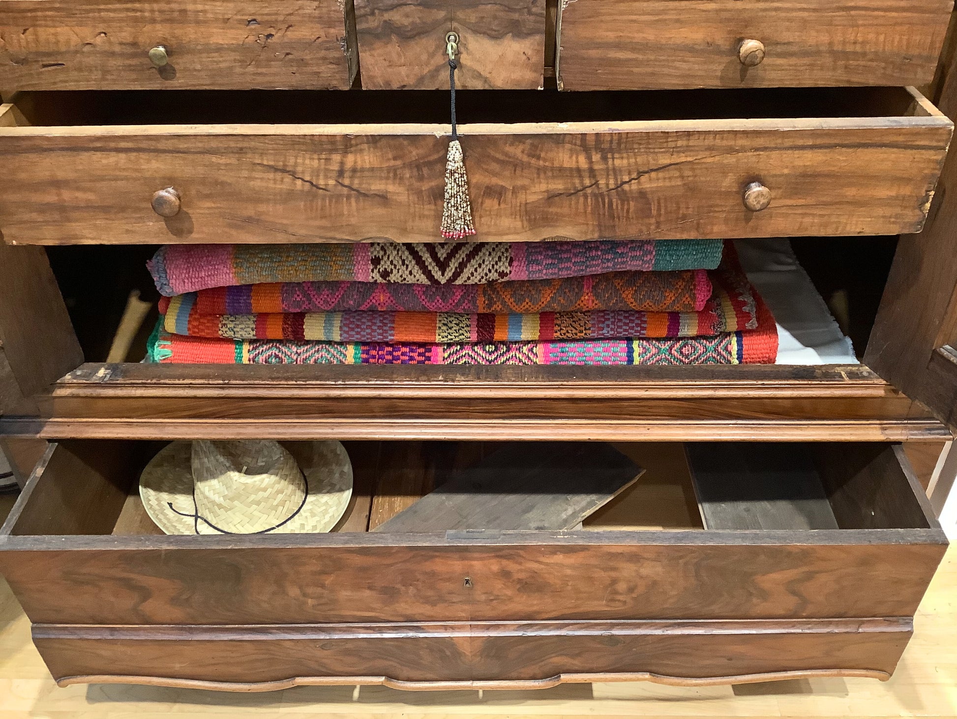 18th C. armoire from Beaune, France, Wood covered with gorgeous matching veneer panels. Armoire contains four large shelves, and five pull out drawers. It comes with a working lock, and its original key. Due to its size, this armoire is designed to be broken down into three sections, allowing for easy transport and maneuverability. This is a versatile piece; it will hold your clothing, your dishes, or books and artwork. How ever it's used, it will look elegant doing so.