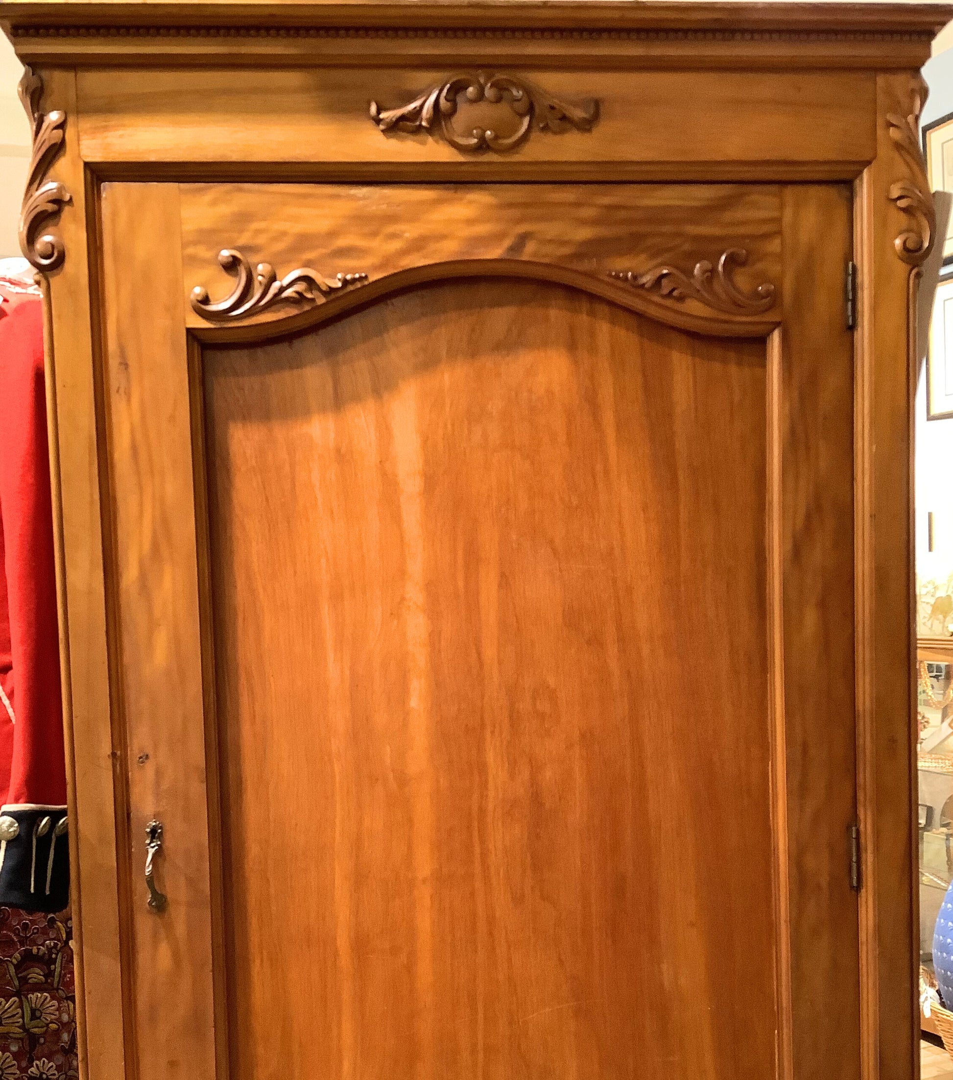 Solid oak, Victorian armoire, with beautiful carved details, containing two shelves, one pull out drawer, and spacious hanging space. This lovely armoire holds a lot and works wonderfully in small spaces. Originally designed to have a mirrored front, which has sadly disappeared, this armoire maintains its appeal and is in otherwise excellent condition.