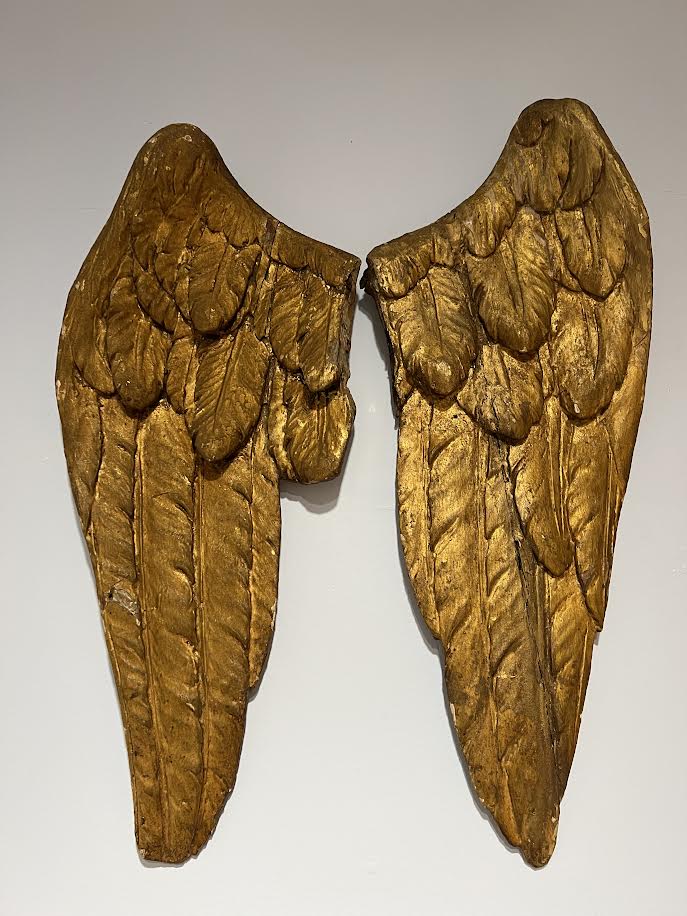Antique hand carved wooden wings with lovely gilt patina. French - purchased in Paris. Carving is beautifully detailed ... Probably from a church. 18th Century. Each wing is approximately 10" wide x 27" high. Sold as a pair.