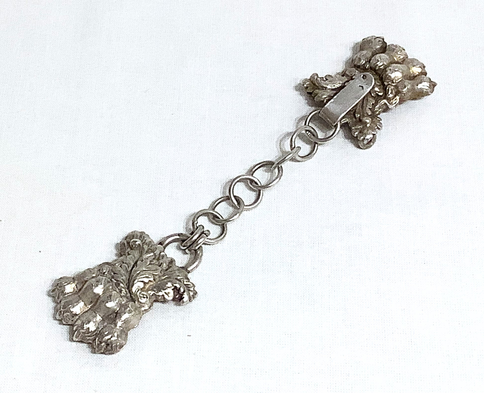French 19th C. silver cloak clasps, beautifully carved in the shape of lions paws.