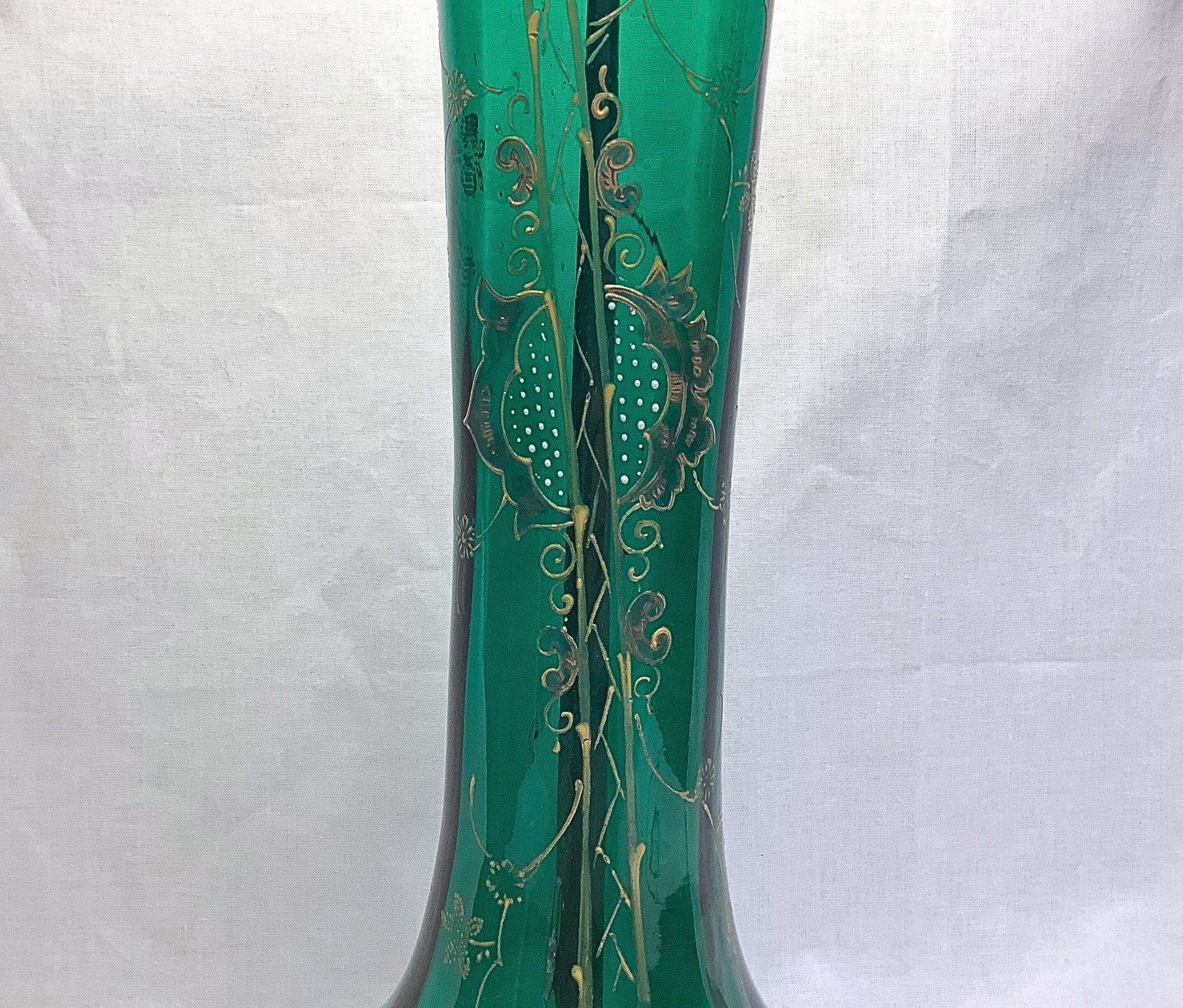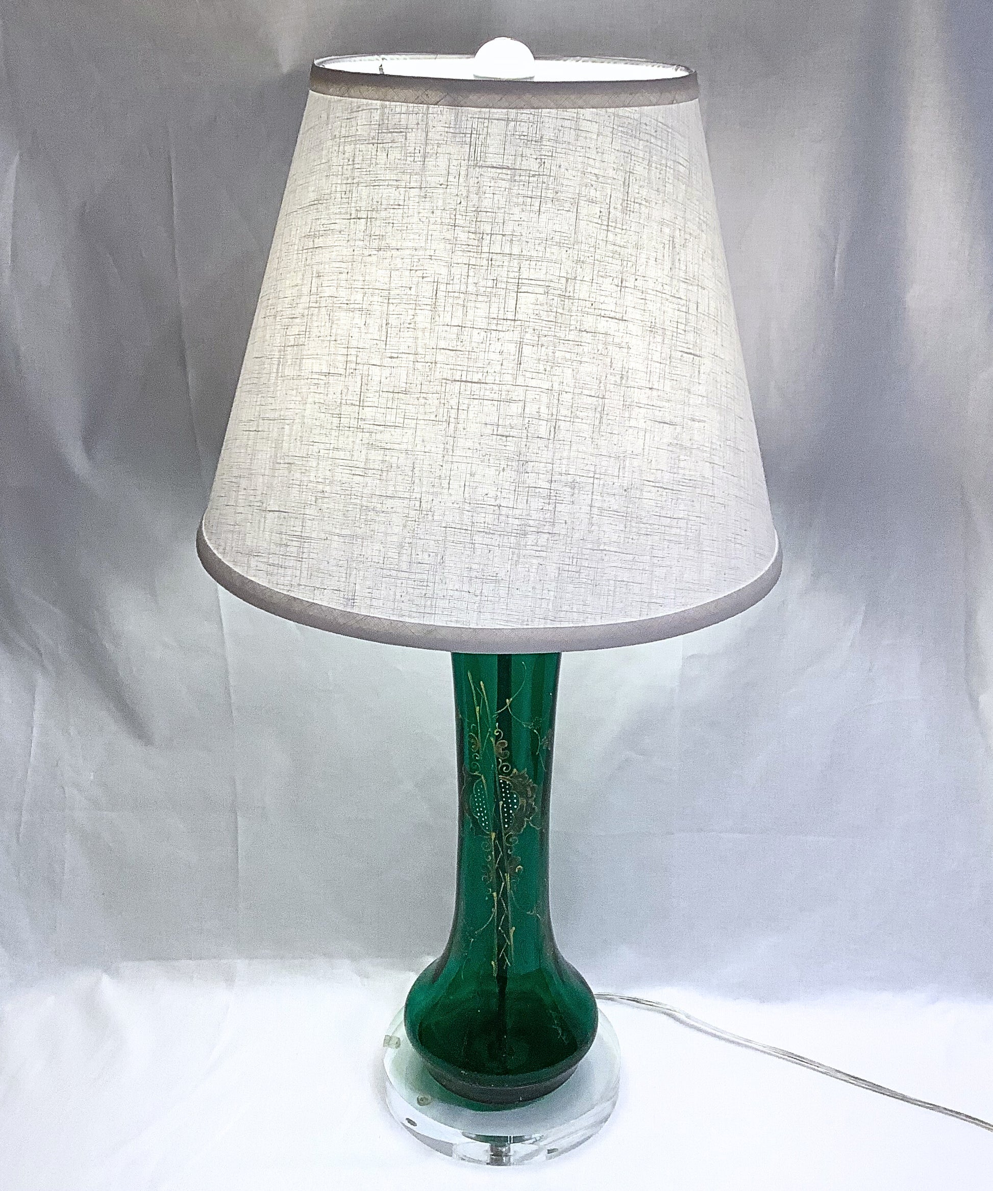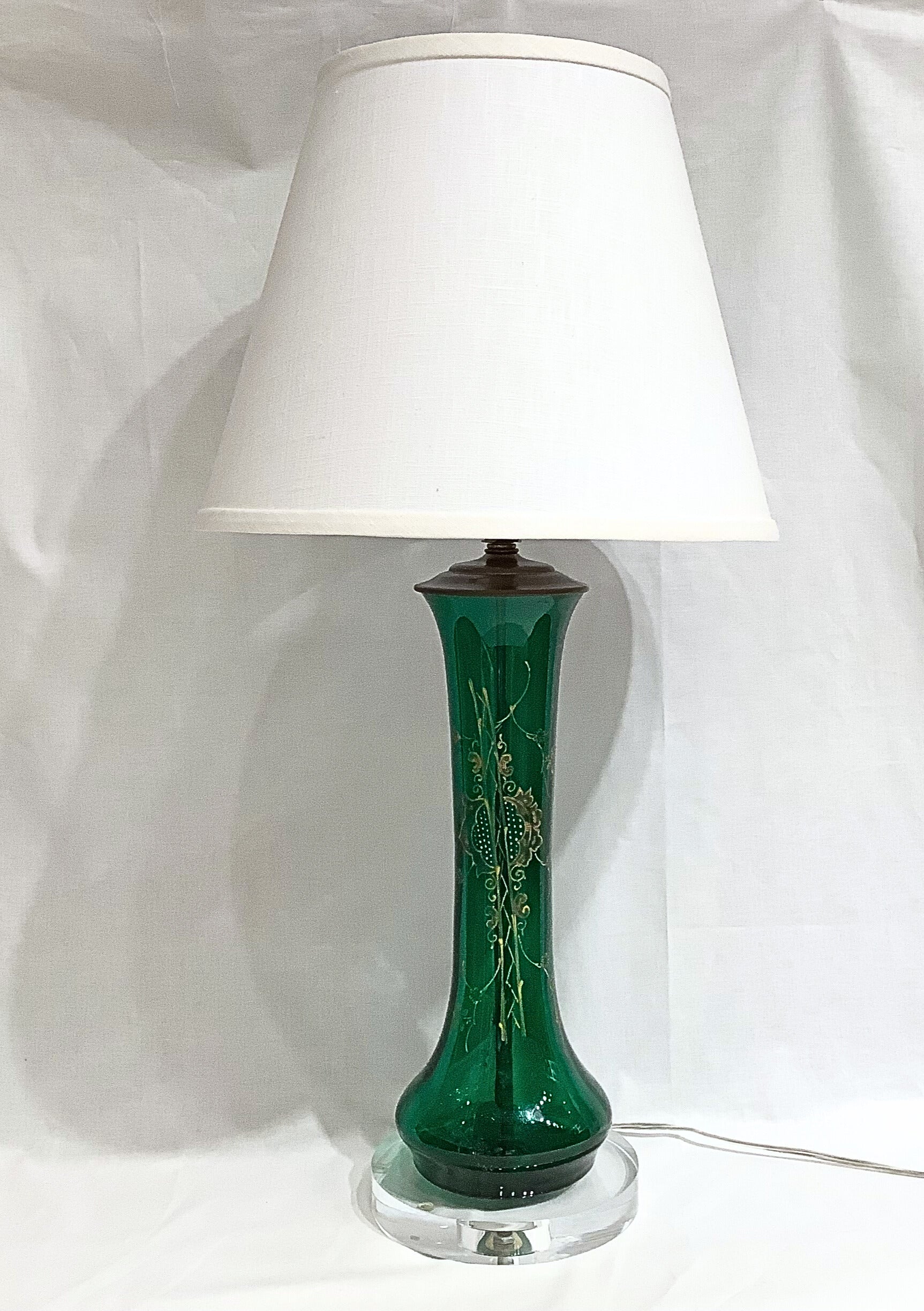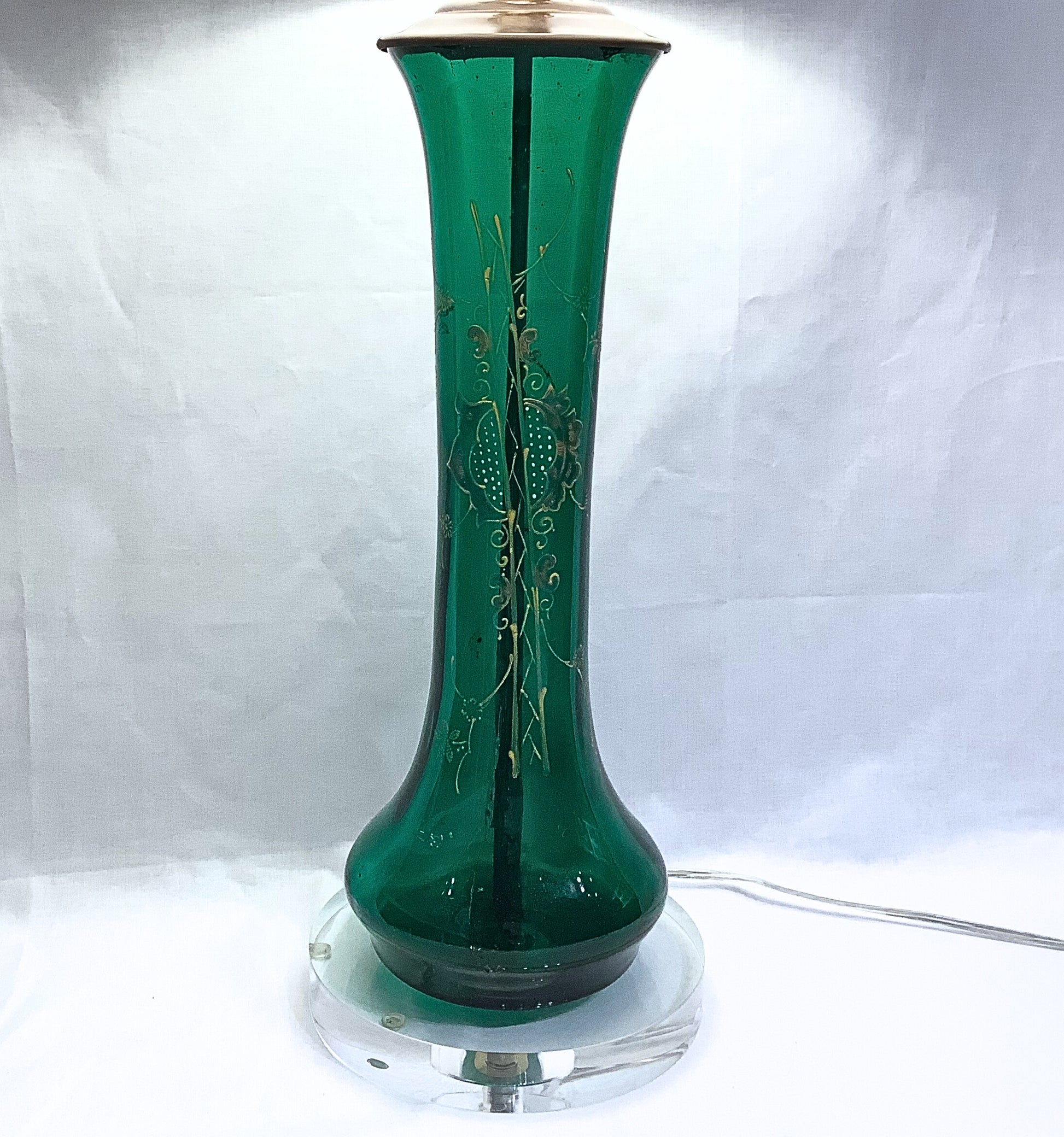This gorgeous green glass lamp is a stylish mix of old and new. The base is made from an old Bohemian emerald glass vase, that was turned into a lamp in the early part of the 20th C., and more recently updated by the addition of an acrylic base. The gold painted design to the glass is original to the piece.