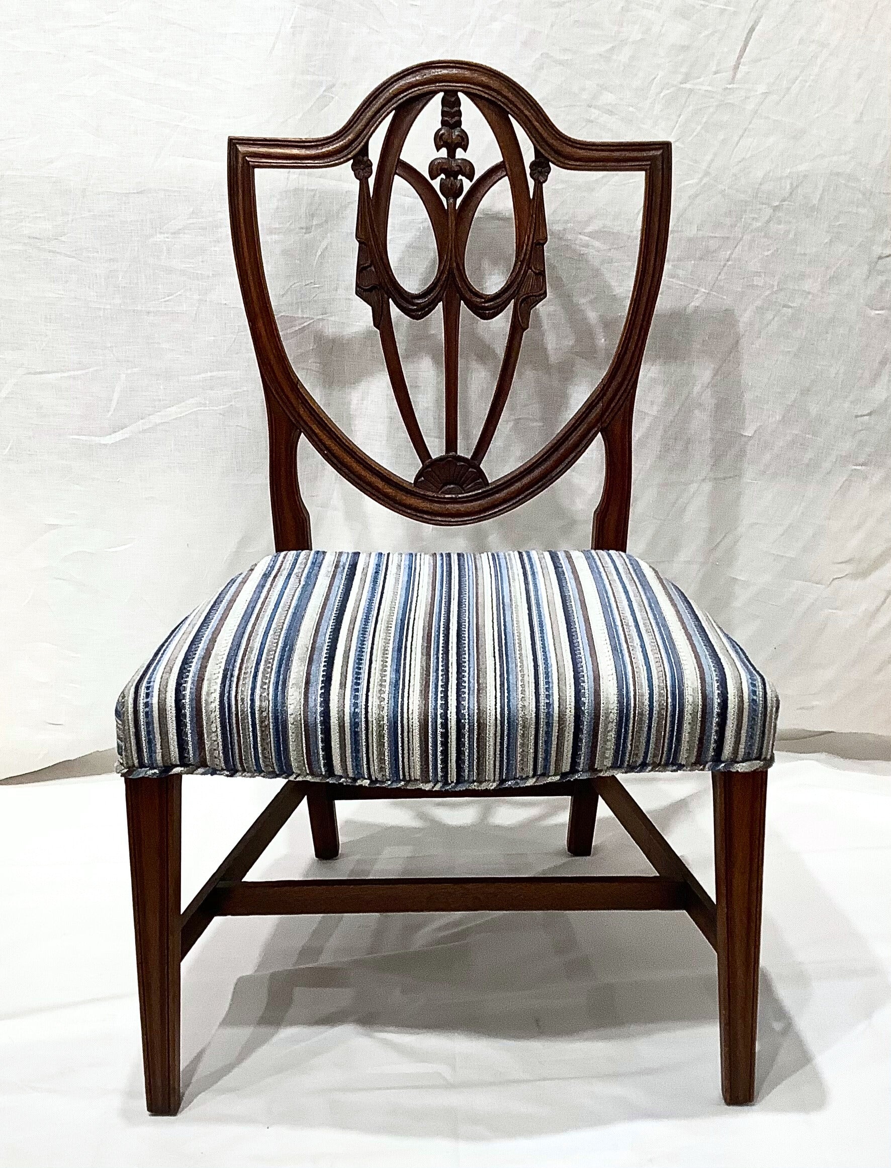 Beautiful mahogany antique chair in a Hepplewhite design, with a shield back and serpentine chair. Weatherly Design has the seat reupholstered in a soft velvet stripe.