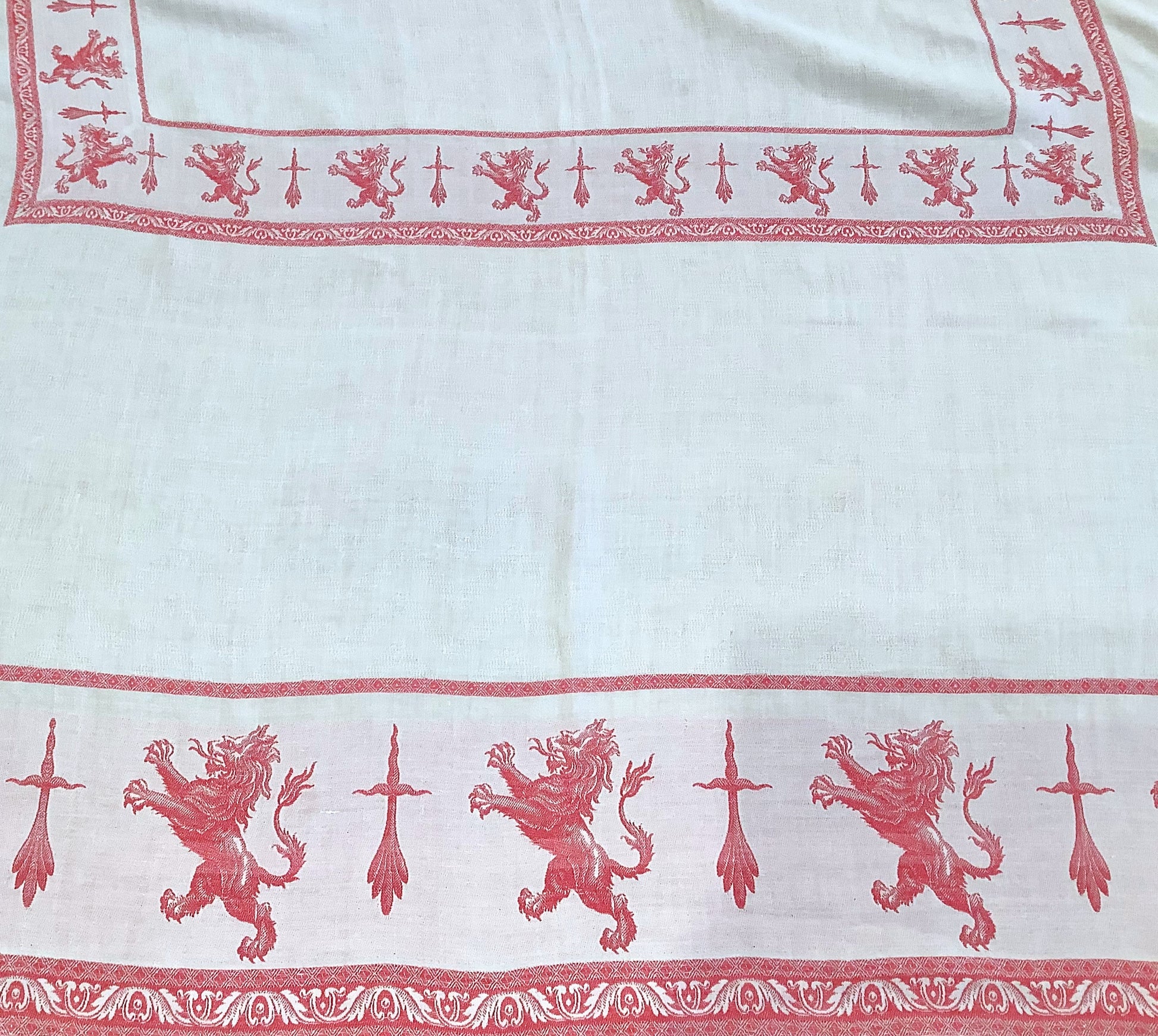 French Damask linen tablecloth, woven in white, with red rampart lions in parade. Design lends itself to formal and informal use. Good condition.