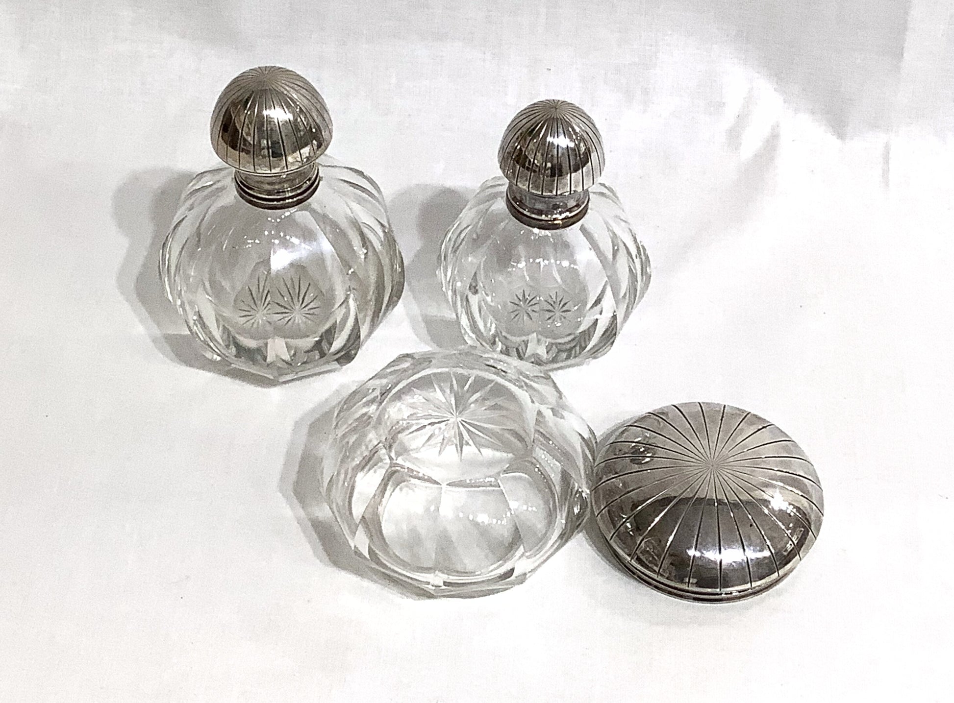 Set of three antique vanity jars, made from cut glass, with sterling silver tops. Each jar has a beautiful star burst pattern etched on their glass base, while their sterling silver caps echo the pattern. Jars have classic Art Deco styling and are in excellent condition. Sold as a set. Small bottle is 4" x 2.5", larger bottle is 4.5" x 3.5", and the round jar is 4" x 3".