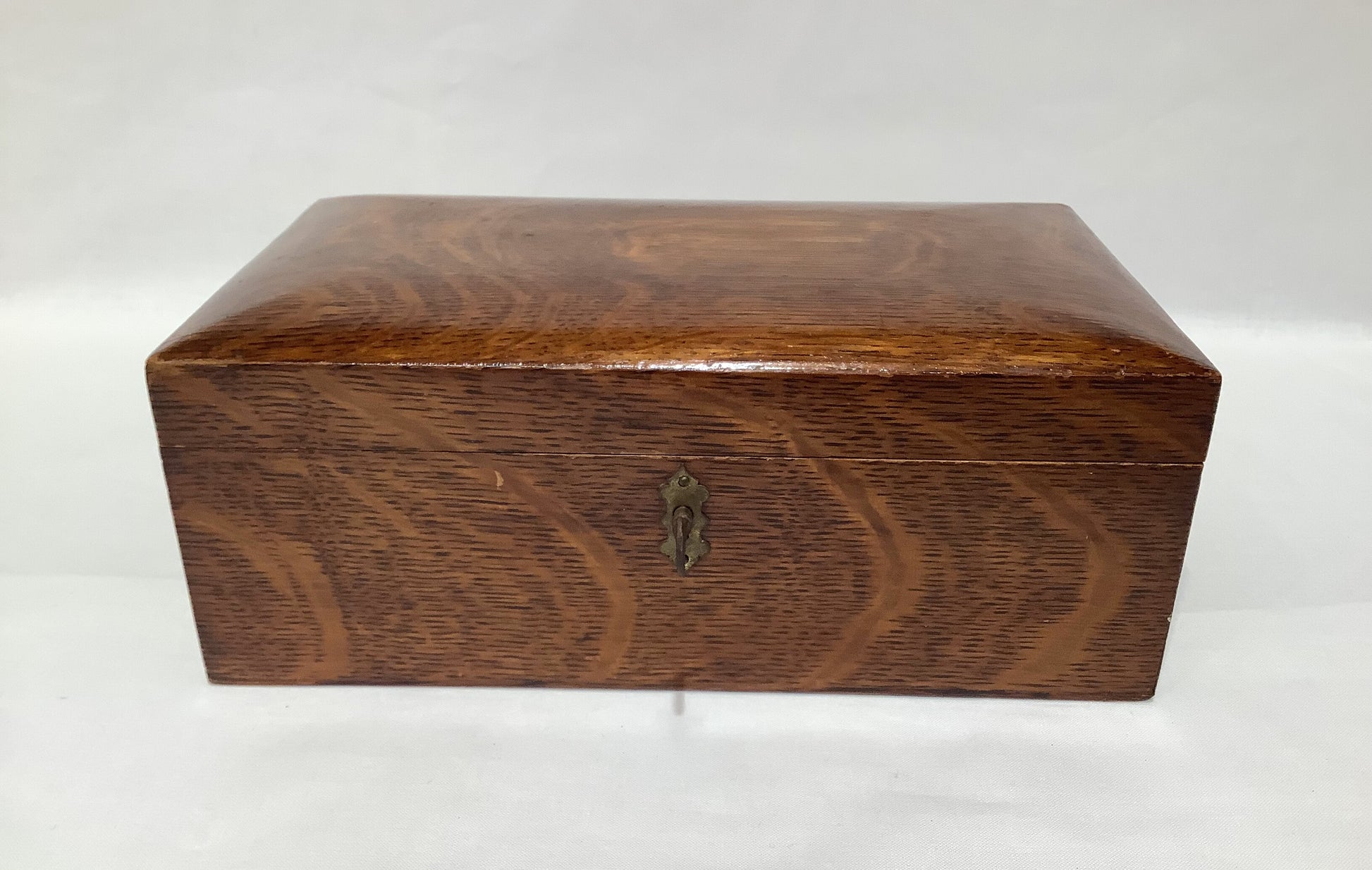 Antique wooden jewelry box, with working lock & key. Interior and removeable shelf both lined in purple velvet. Good condition. 4" x 10" x 6",