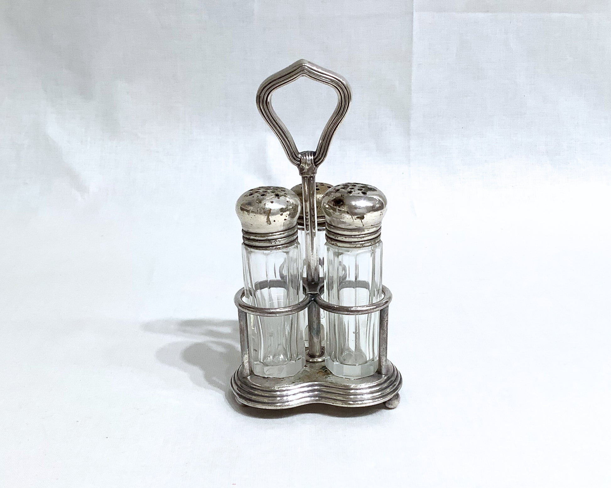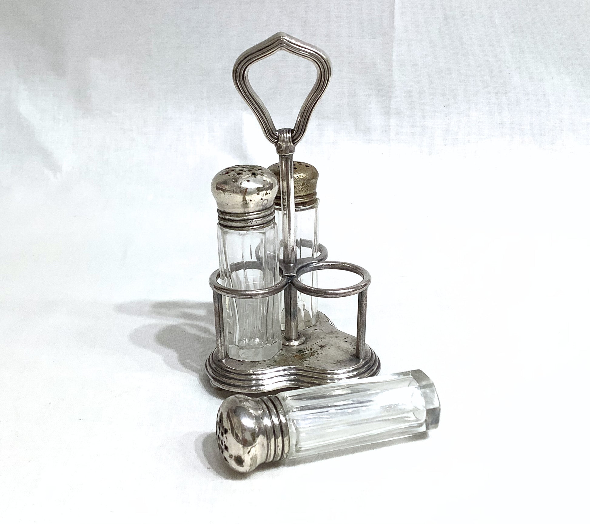 Antique silver and cut glass salt and pepper service. This charming set came from the iconic Crystal Tea Room, in the Wanamaker's Department Store, Philadelphia, PA.