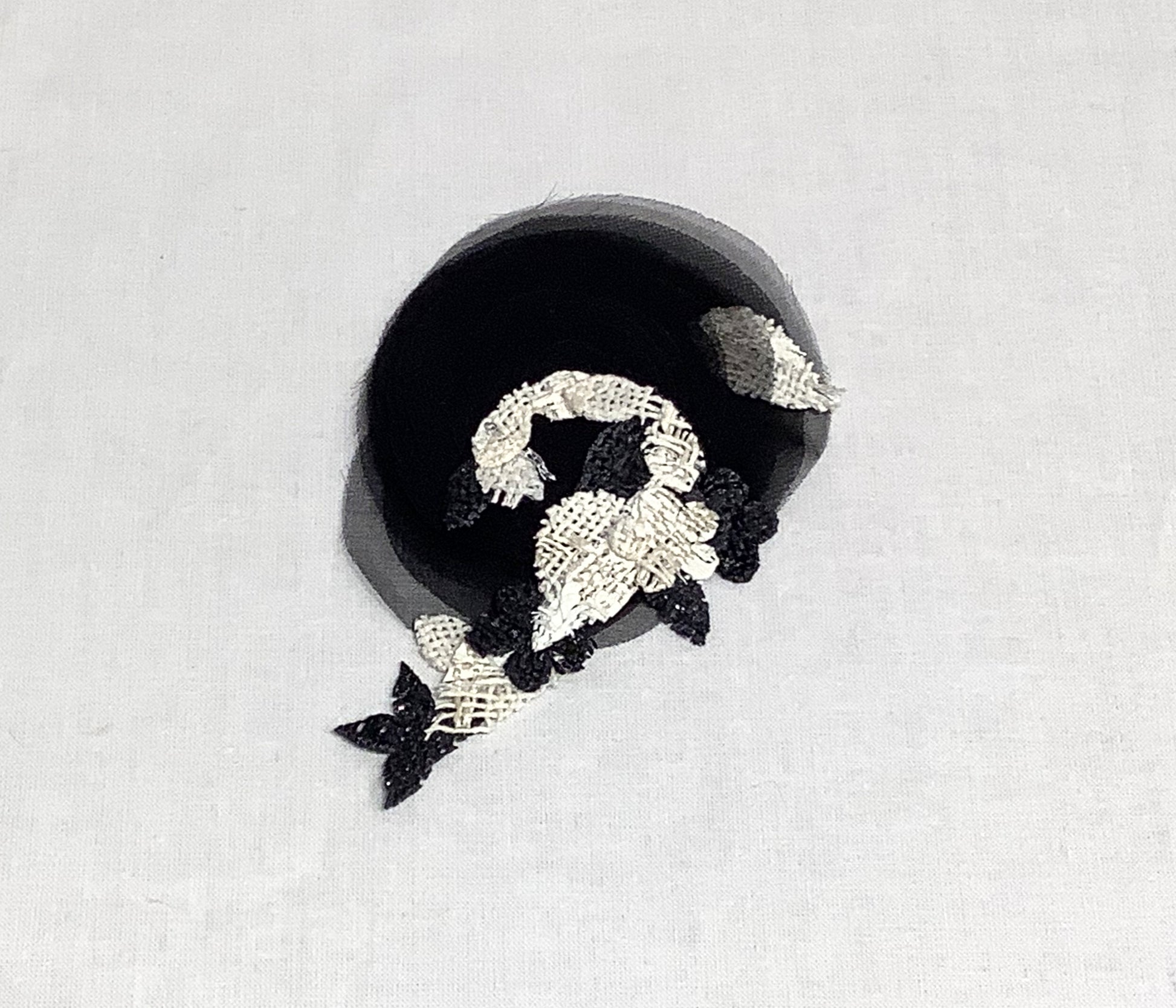 Chanel camellia brooch made from black netting and lace. This is a runway sample, secured on the back with a standard pin clasp.