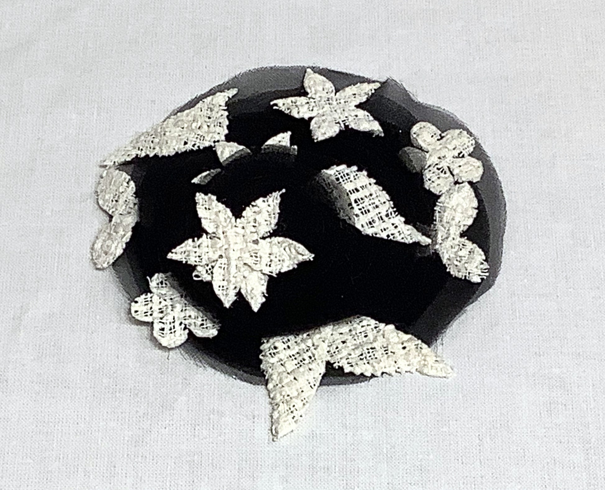Chanel camellia brooch made from black netting and lace. This is a runway sample, secured on the back with a standard pin clasp.