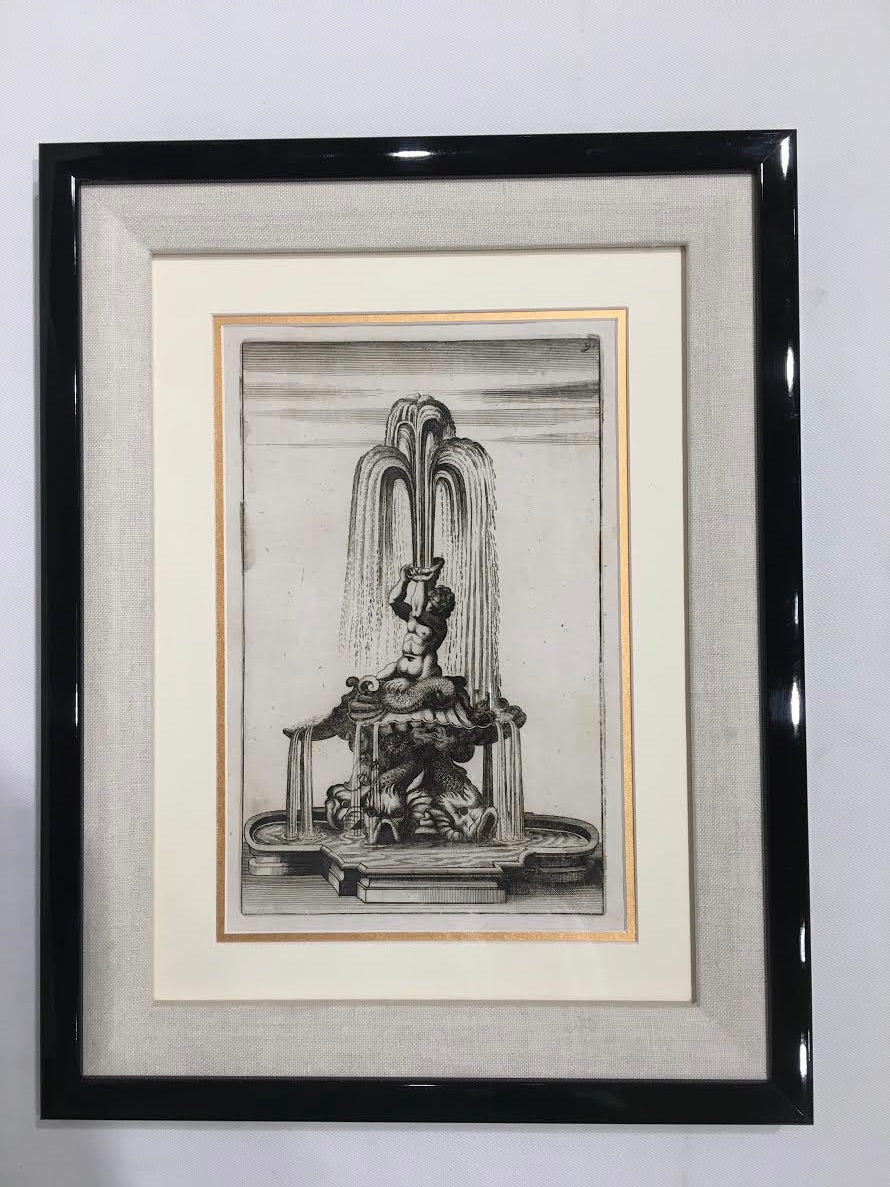 Antique copper plate engraving, circa 1690. Boschler Fountain, German. New archival matting & framing. When purchased it had a lovely quote from Baudelaire attached, "The sheer luminous gown The fountain wears ... Falls like a summer rain Or a shawl of tears." Size 17" x 12.5".