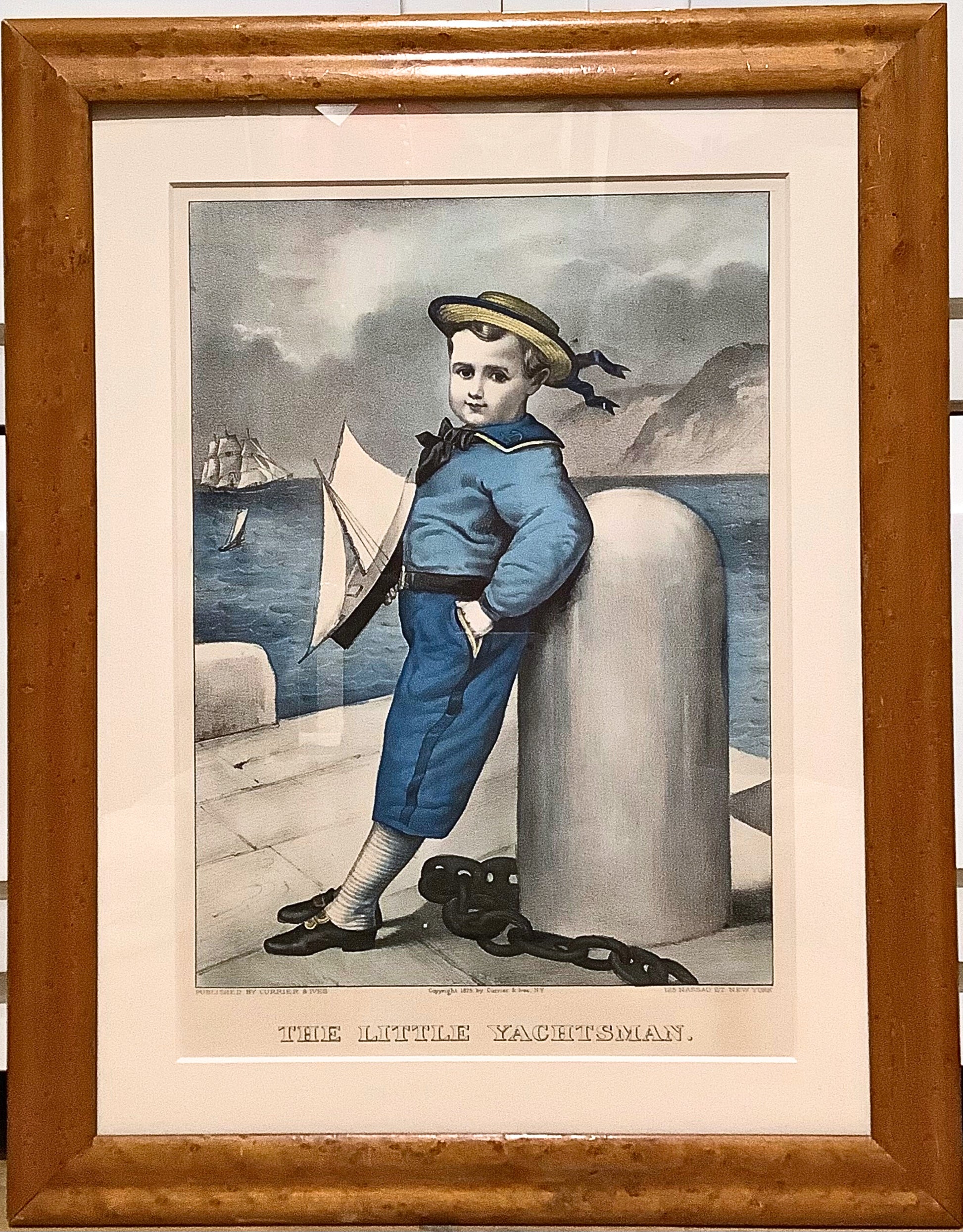 Original, hand-colored lithograph, in period frame, of The Young Yachtsman, published by Currier & Ives in 1875.