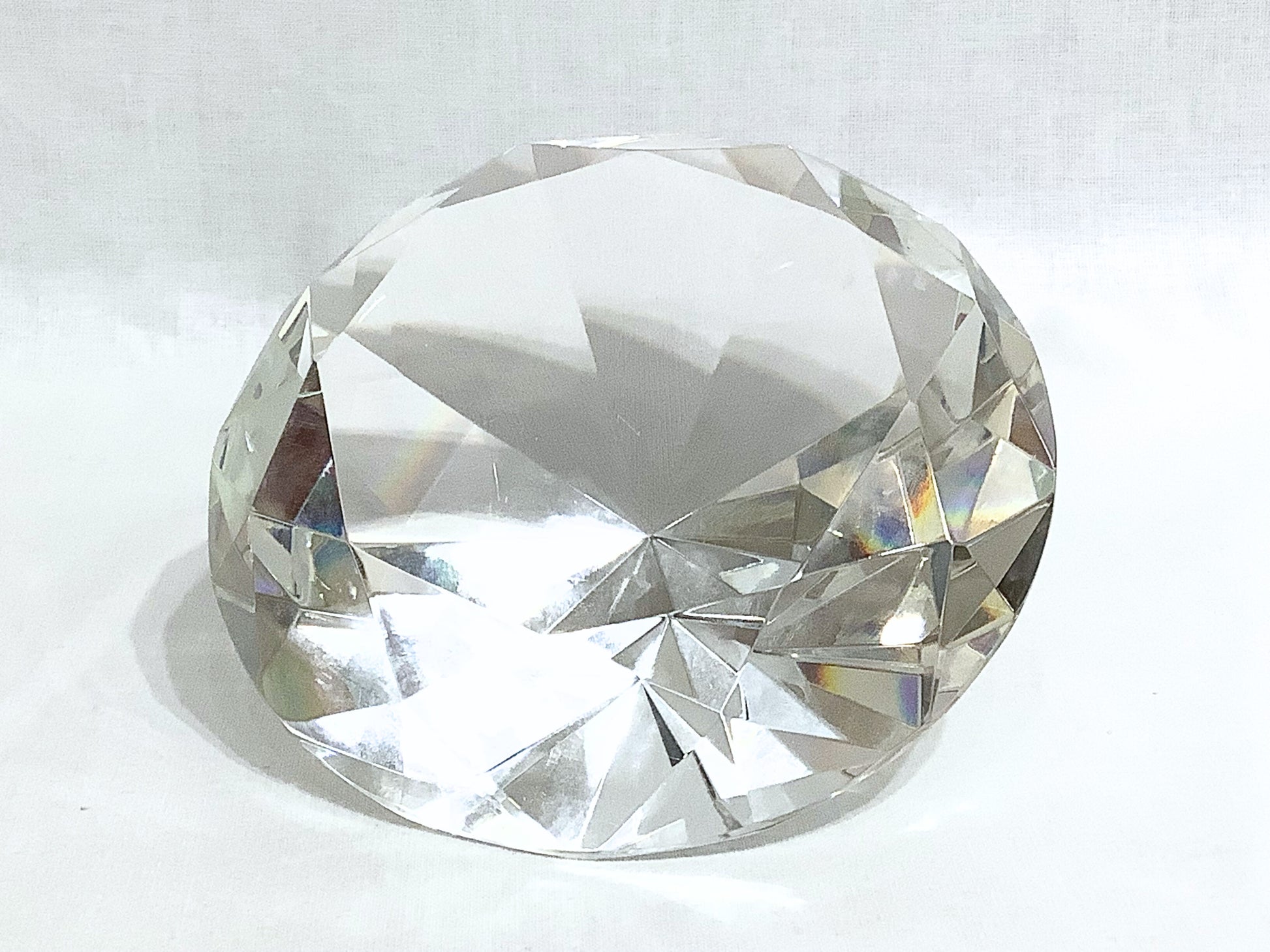 Cut glass paperweight fashioned in the shape of a brilliant cut, solitaire diamond. This paperweight is a perfect marriage between form and function, not only will it keep paperwork in place but it will add a ray of light to any home office or décor.
