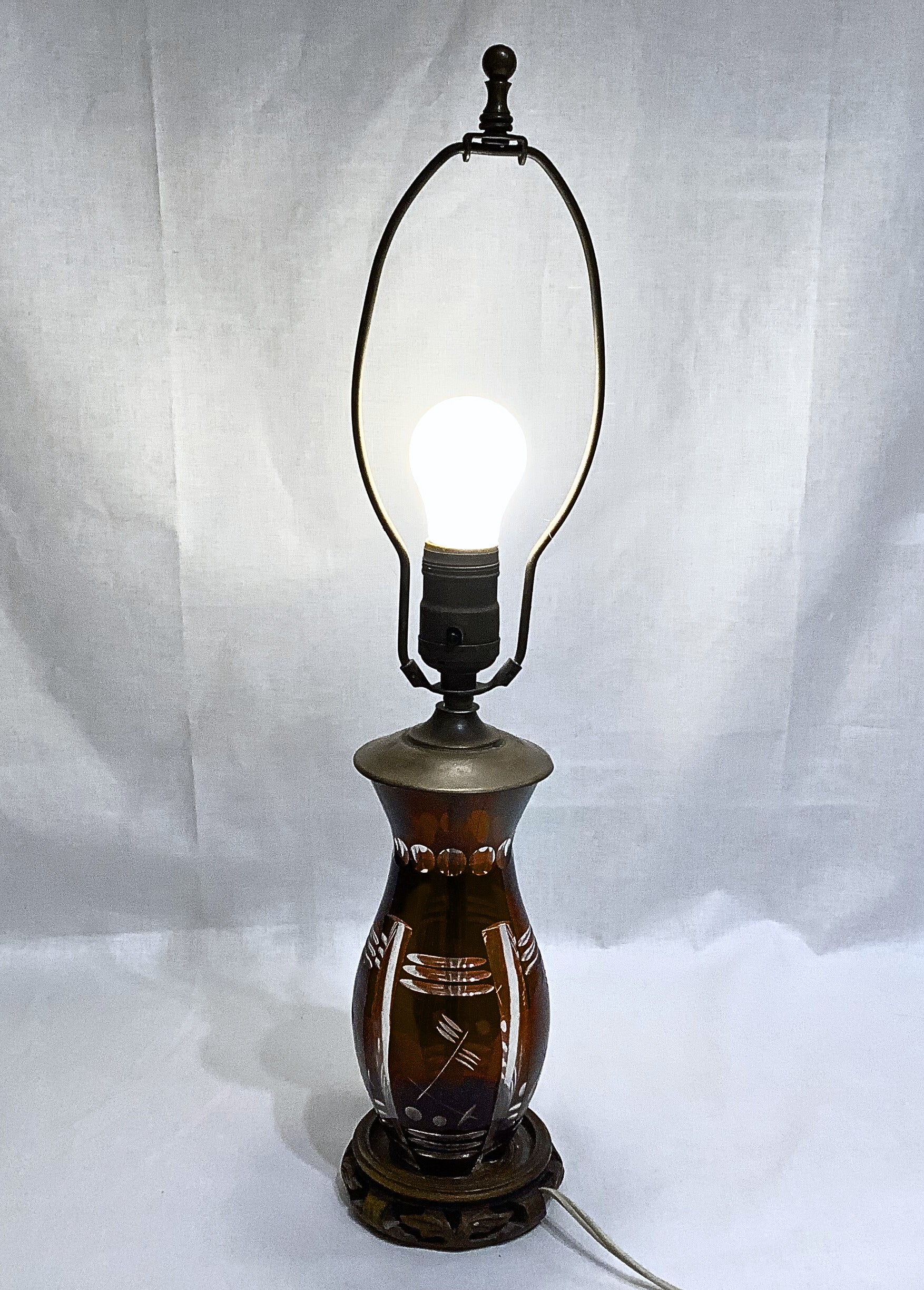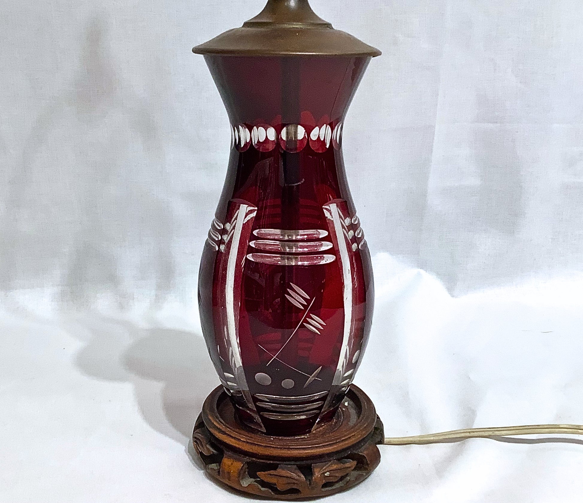 This striking lamp, from the 1920's or 1930's, is formed from beautifully etched cranberry glass revealing a modern abstract design. Glass body is mounted on a carved wooden pedestal. The lamp works but wiring should be replaced.