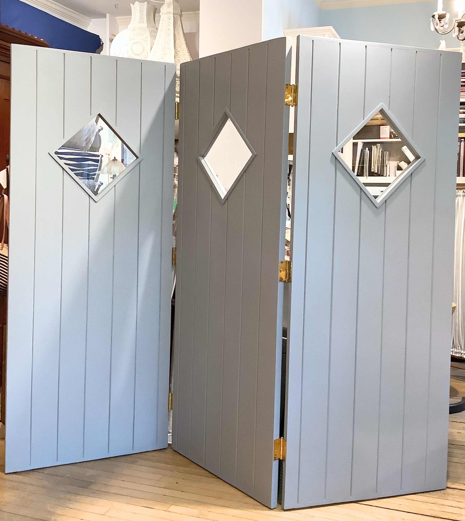Weatherly Design loves folding screens, they are a handy and stylish way to create separate spaces and cozy nooks within a room. We designed these screens off classic Nantucket doors, and they were crafted by our carpenters. To accent the screens, we used Benjamin Moore Timber Wolf paint, and brass hardware.