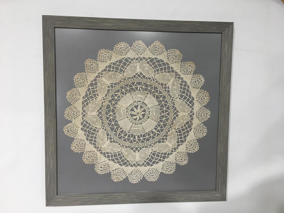 The doily's time has past as a ubiquitous tabletopper or arm rest protector (and thank goodness!)... But, the workmanship can still be appreciated and celebrated as in this large decorative table top doily. Circa 1910, made by M-A Gilmartin of Philadelphia. New archival framing.