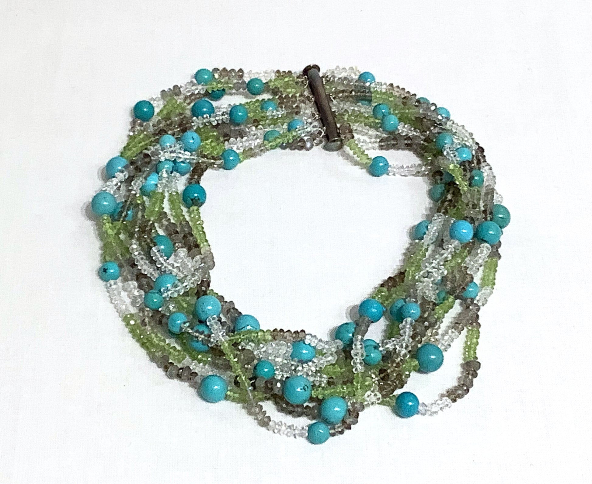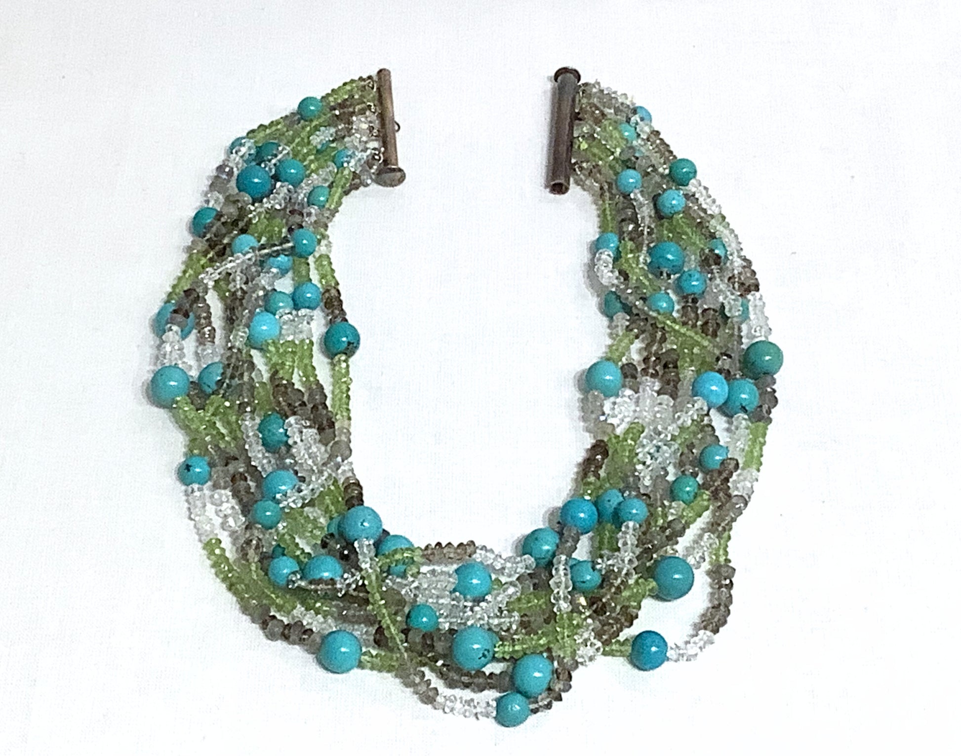 Necklace made from strands turquoise, peridot and aquamarine beads. Necklace has sterling silver barrel clasp, which allows you to wear it with security.