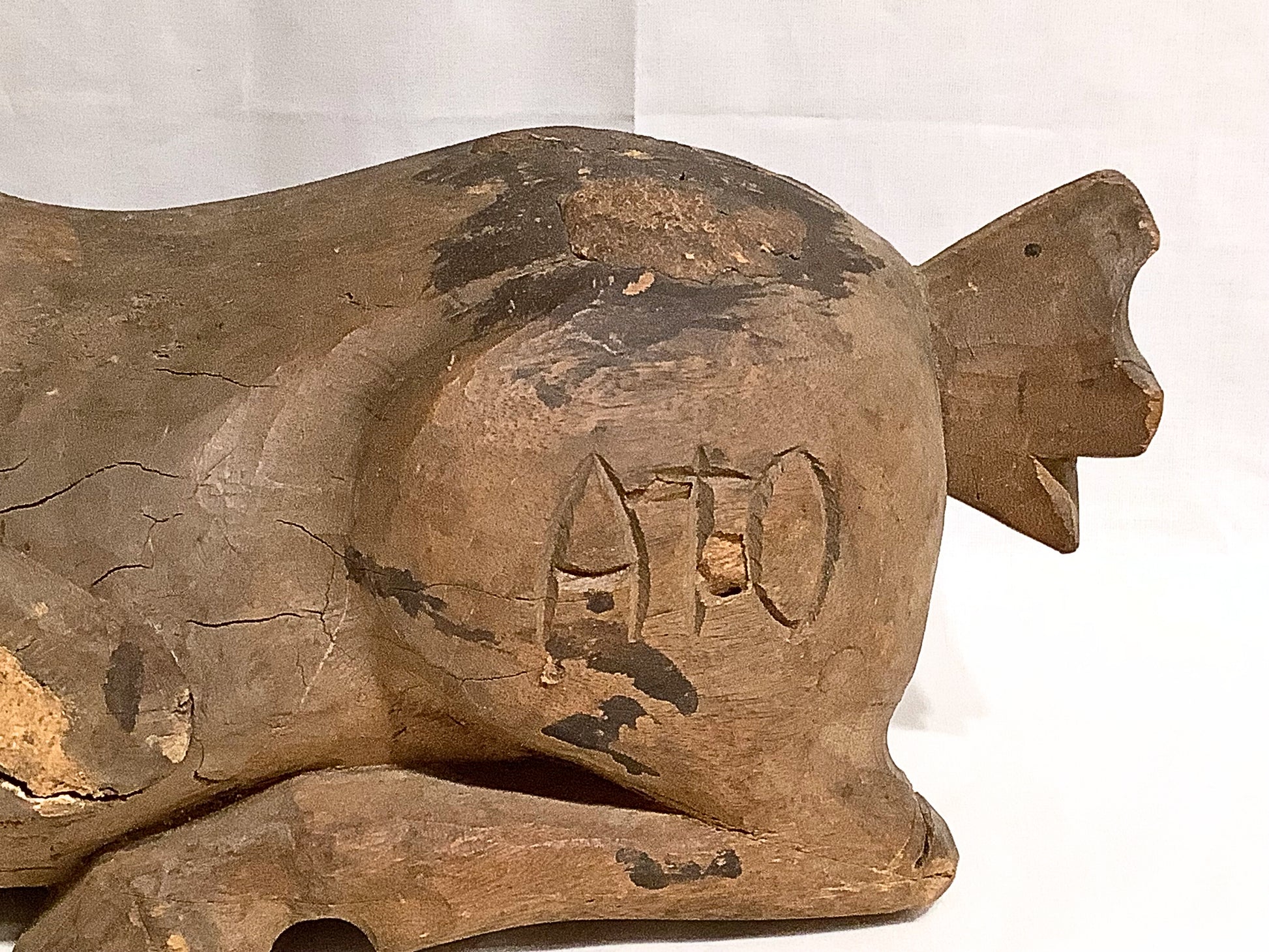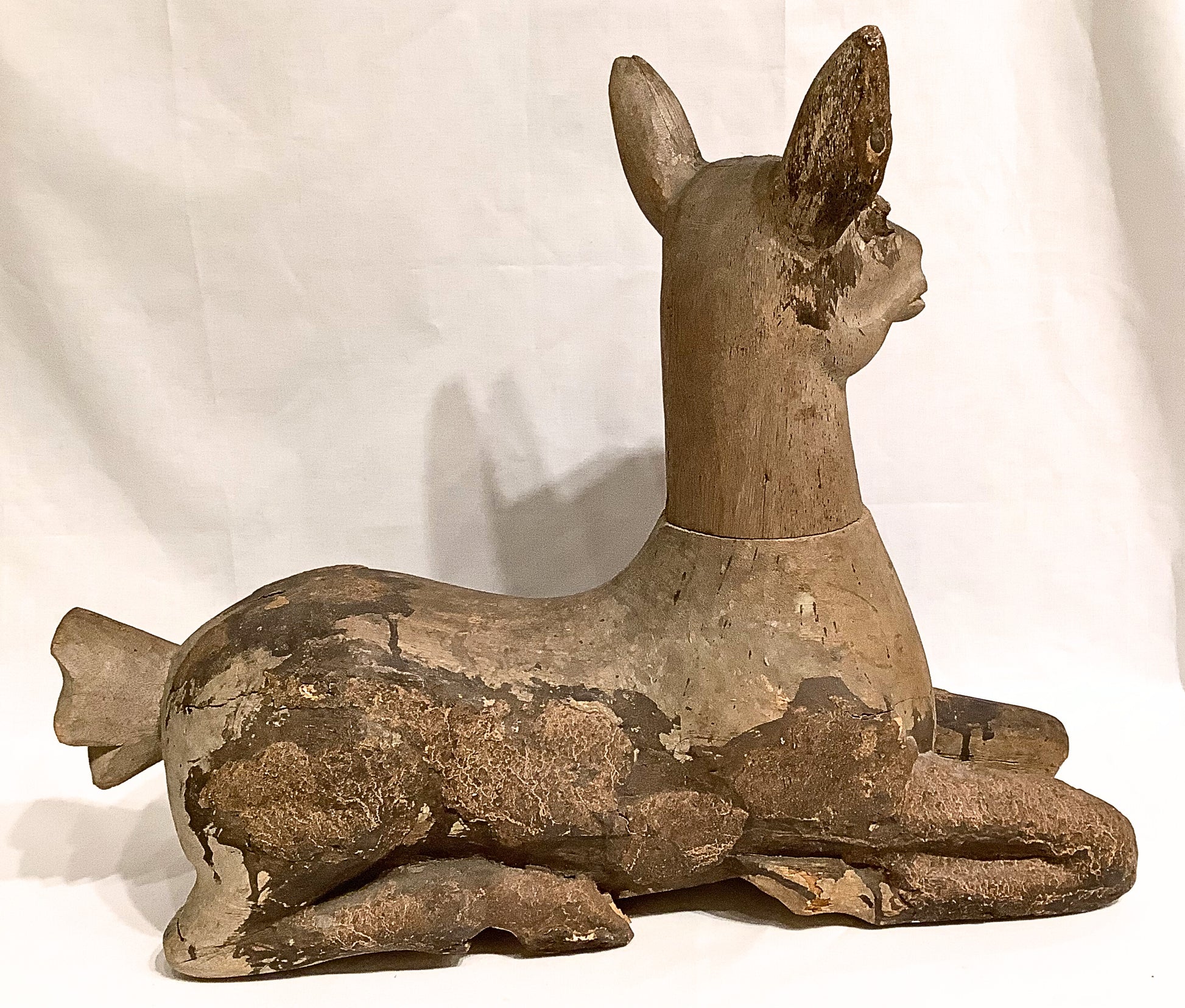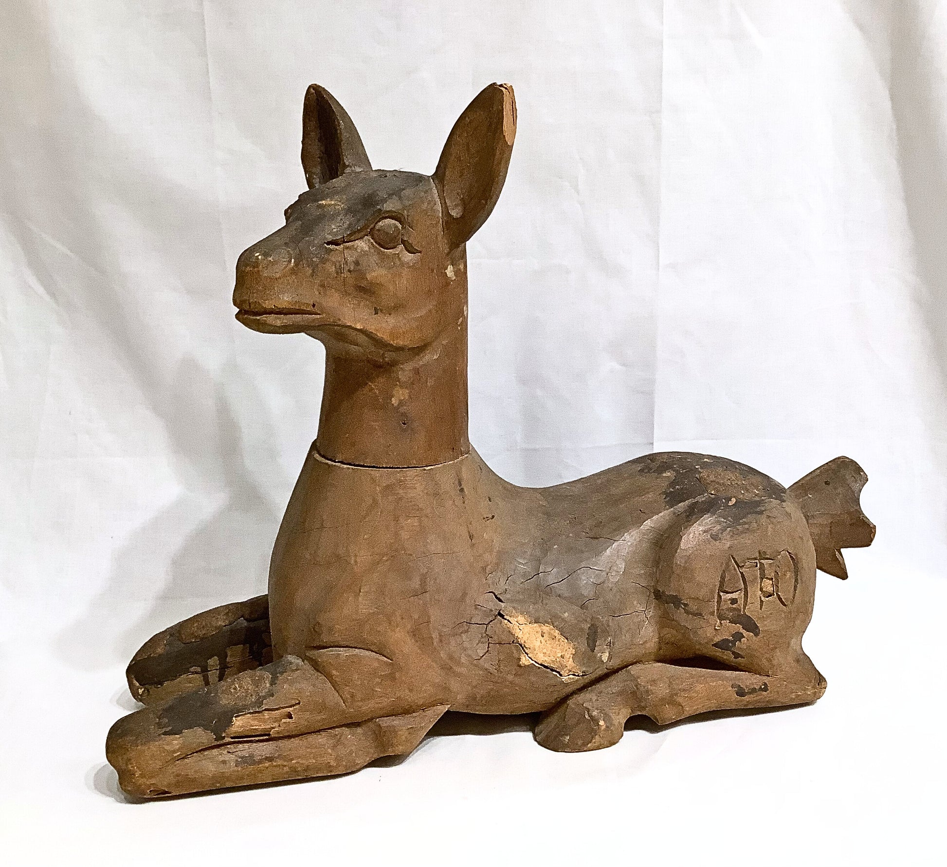 This sweet deer was hand carved from wood, by an unknown, talented artist. The deer's backstory may be lost to time, but its future as a decorative item is assured. Despite having a few cracks in the wood, and fading to its decorative paint, it is still in wonderful condition, and would add charm to any room.