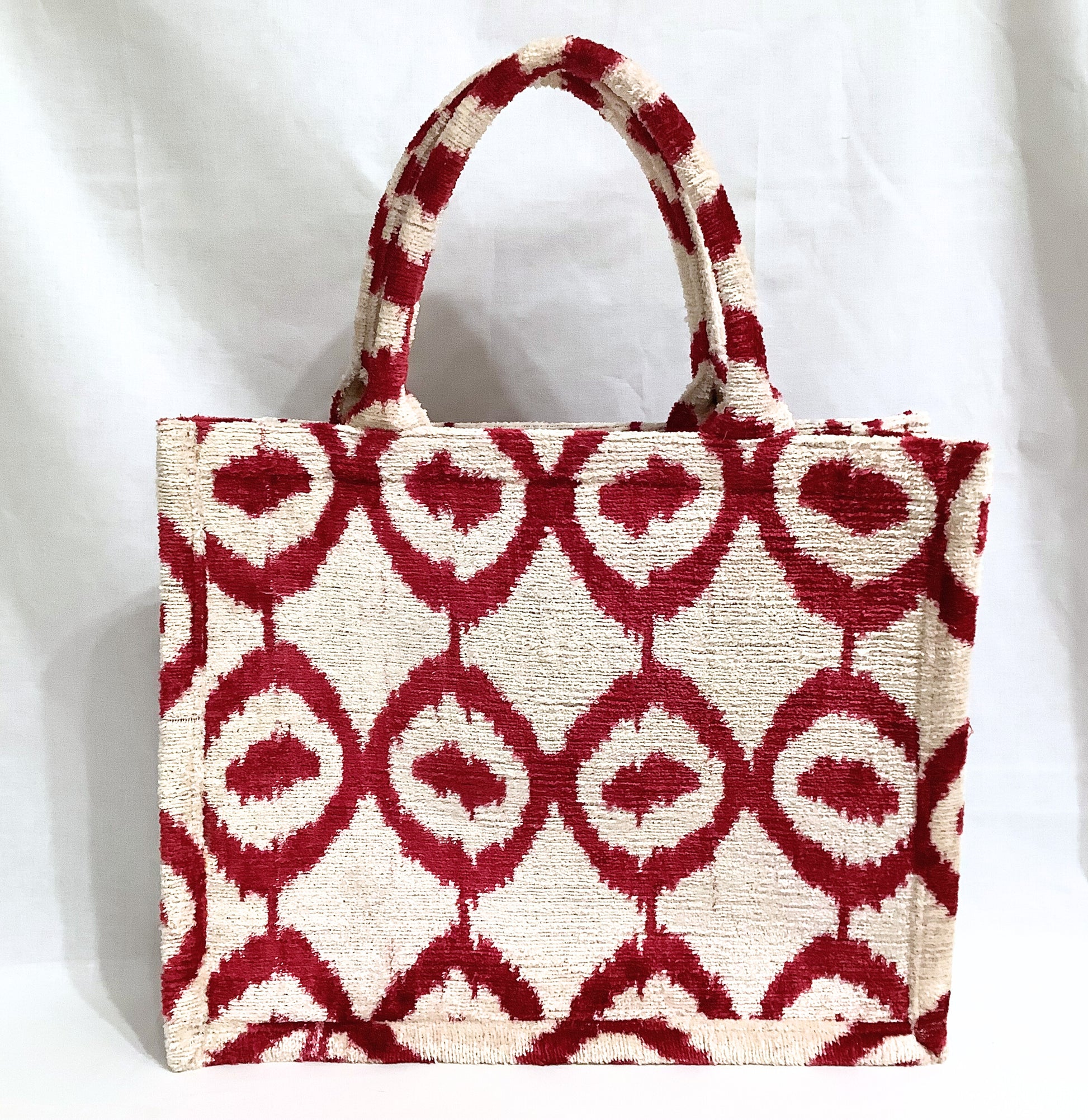This tote bag is made exclusively for Pringle of Scotland in Istanbul, Turkey. The are covered in vintage silk velvet ikat remnants, and sueded cotton interior. Each ikat tote we receive is unique, so you'll never see someone sporting an identical.