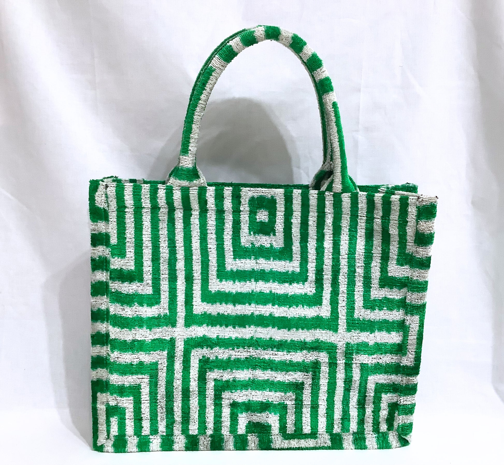 This tote bag is made exclusively for Pringle of Scotland in Istanbul, Turkey. The are covered in vintage silk velvet ikat remnants, and sueded cotton interior.  Each ikat tote we receive is unique, so you'll never see someone sporting an identical.