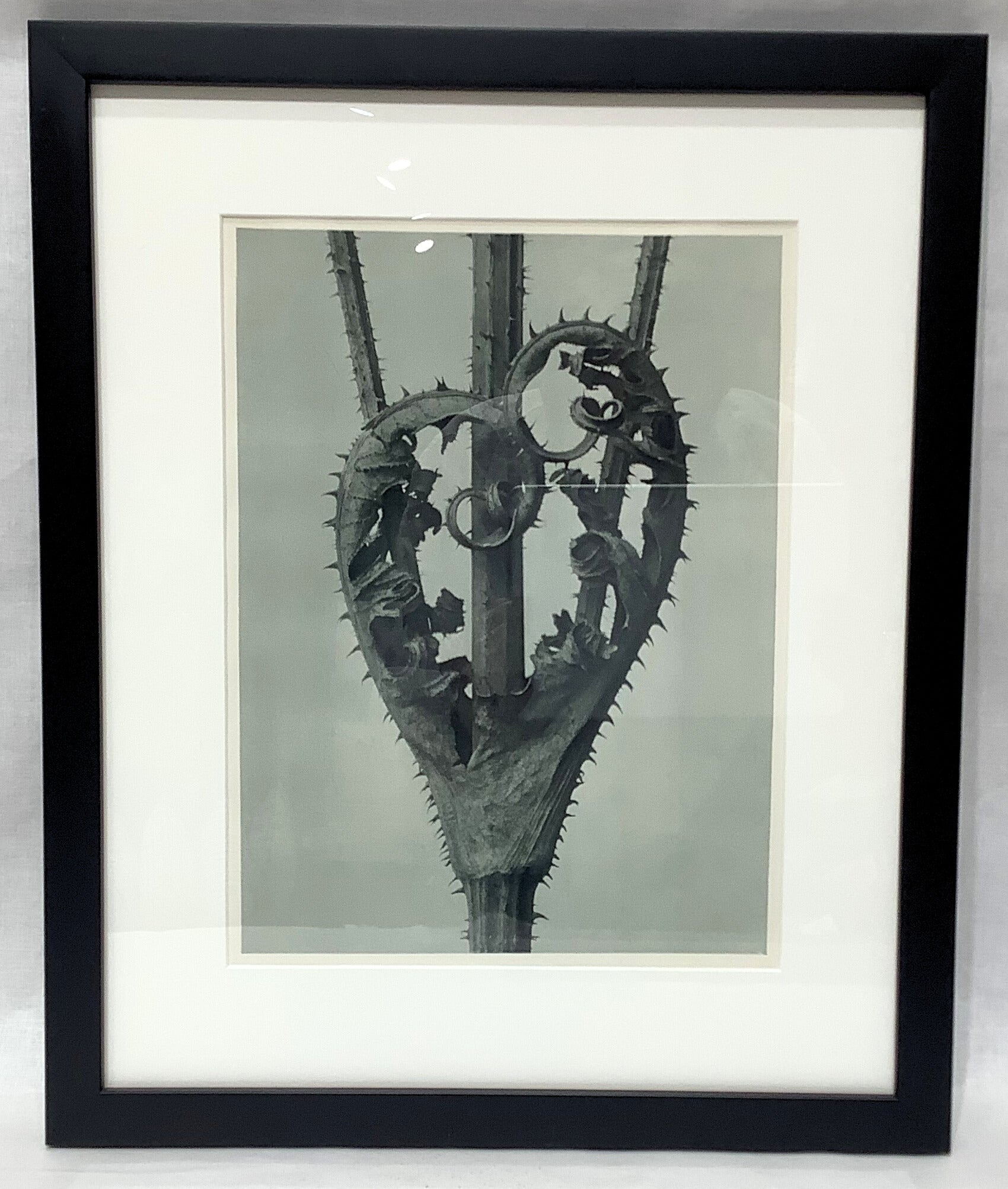 Photogravure print of a Karl Blosfeldt photo, from his 1929 series Urformen der Kundt (Art Forms in Plants). Blosfeldt was a pioneer in macro photography, magnifying his subjects up to 30x their normal size. In doing so, he was able to display the abstract and architectural shapes of plants. Print is museum quality mount and frame. 15 3/4" x 13".