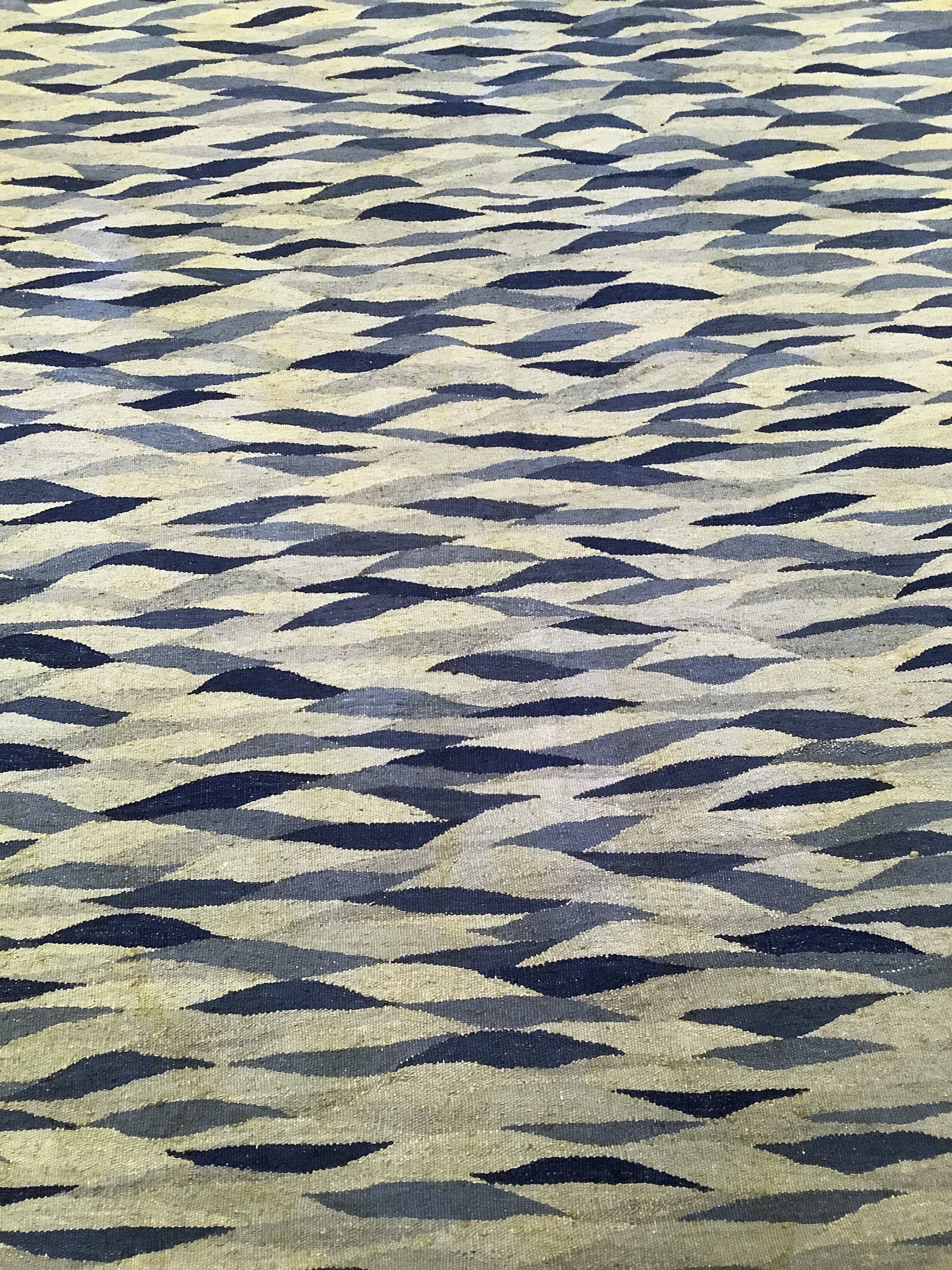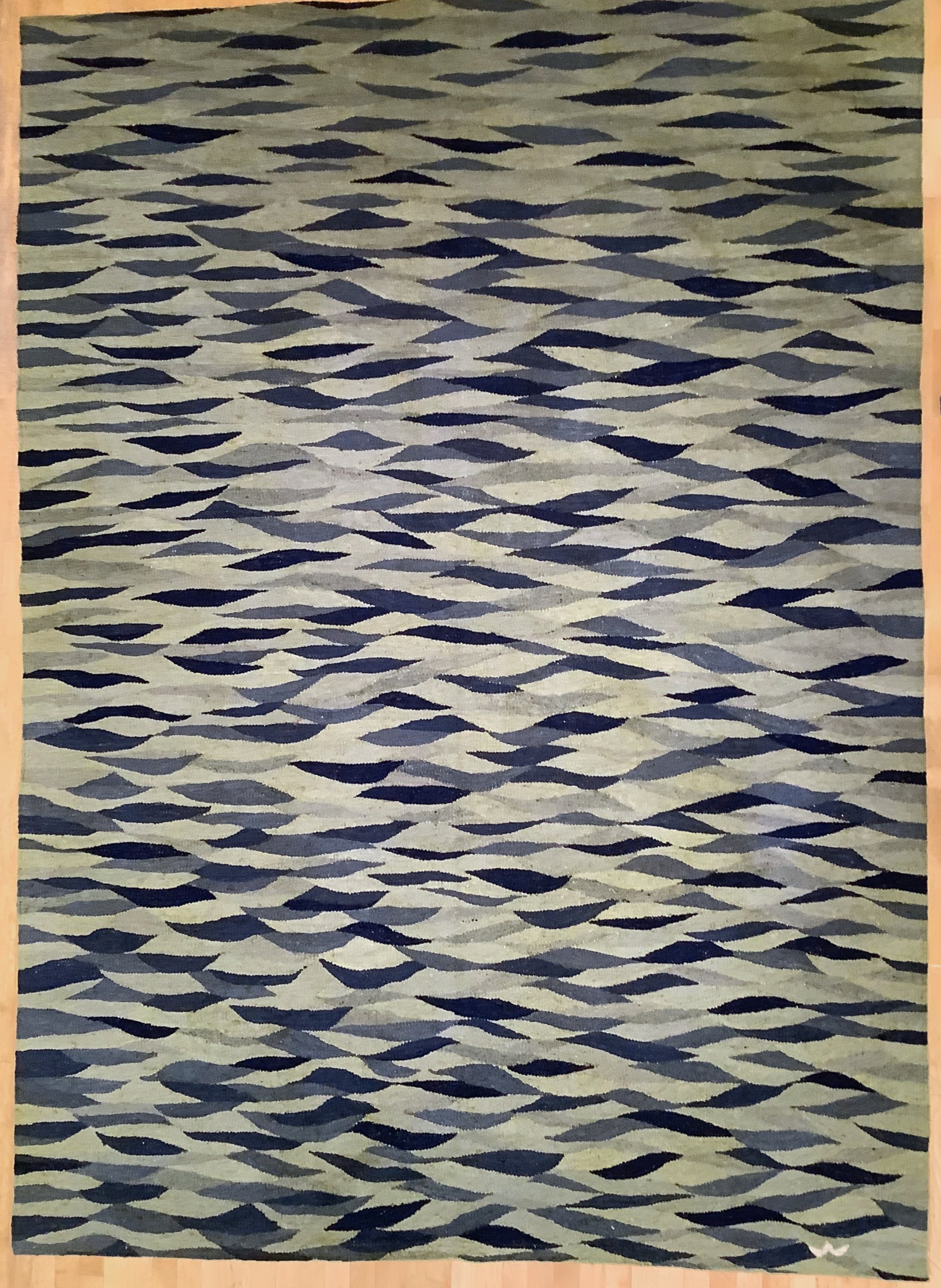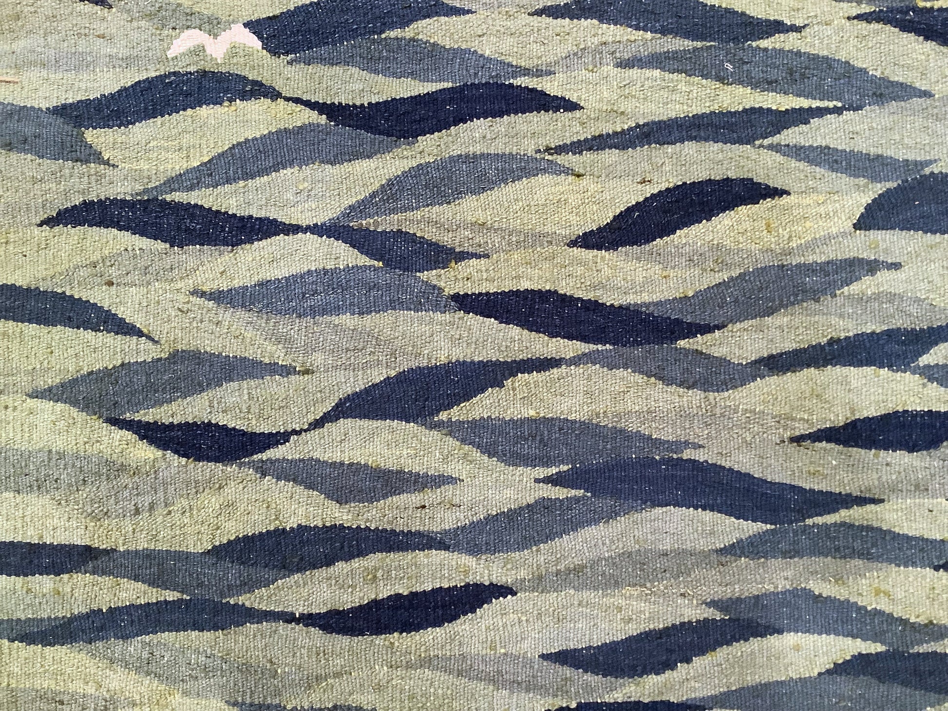 Contemporary Turkish kilim of exceptional quality. 100% wool, colored with organic, natural dyes, using centuries old processes and employing modern fair trade practices. This carpet, with its soothing colors and wave pattern, acts as relaxing anchor to a room, and can be incorporated into both traditional and modern décor.