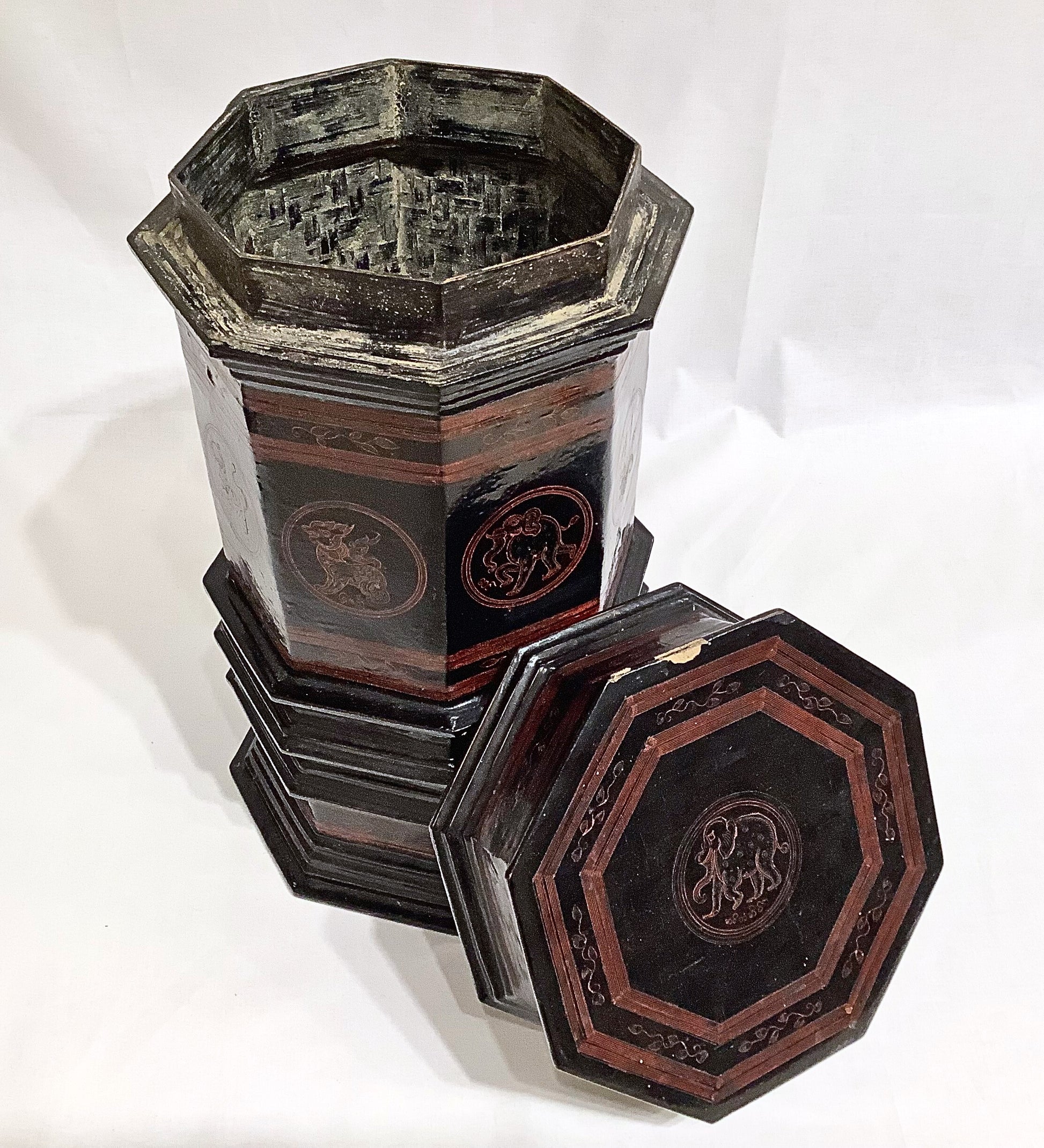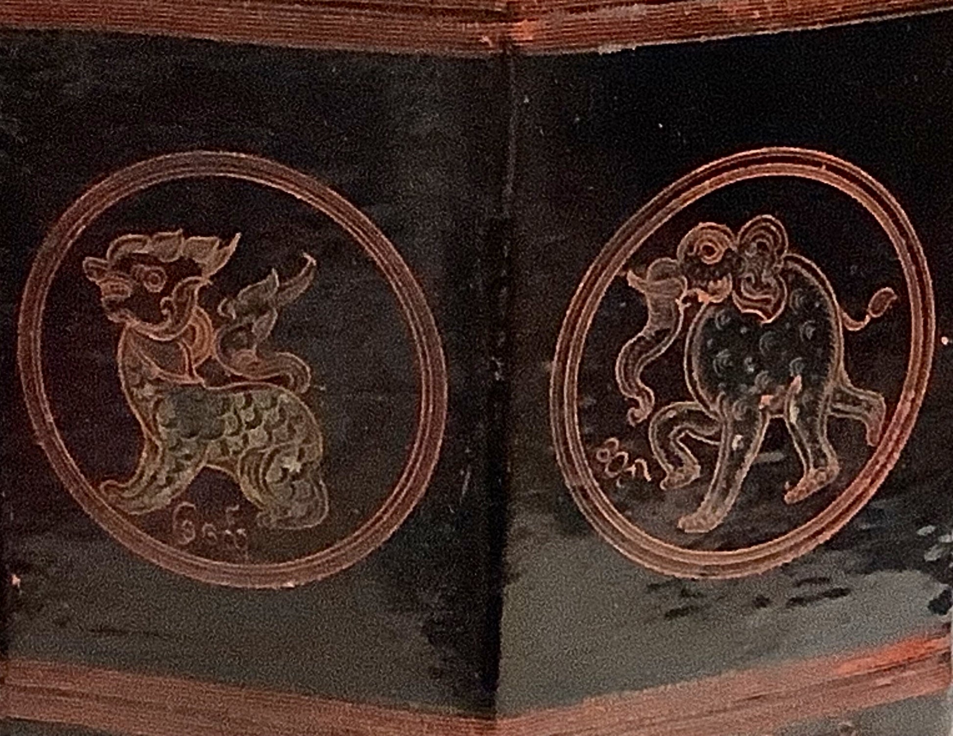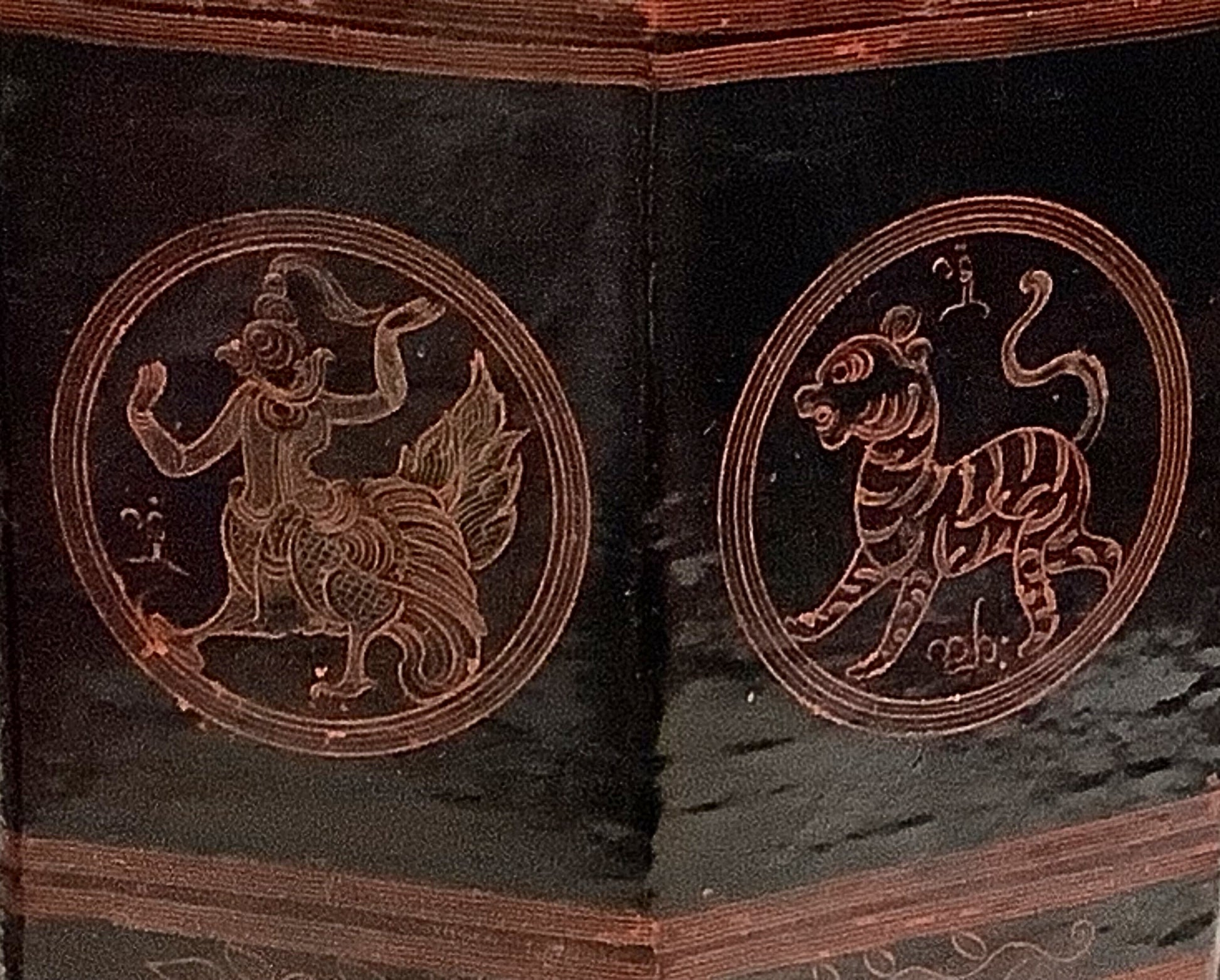 Southeast Asian octagonal box made of lacquered bamboo, and decorated with mythological creatures. This box is both uniquely stylish and functional.