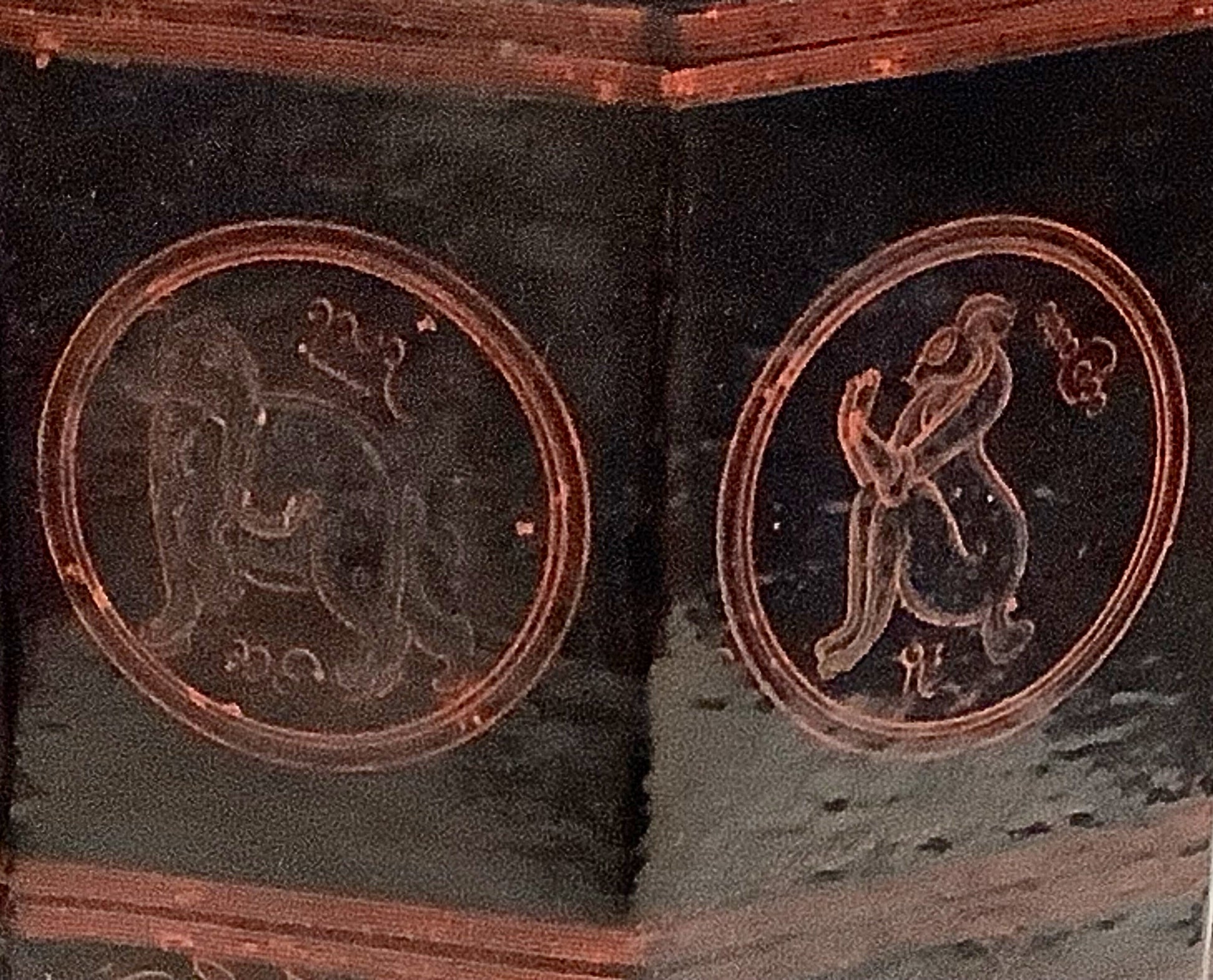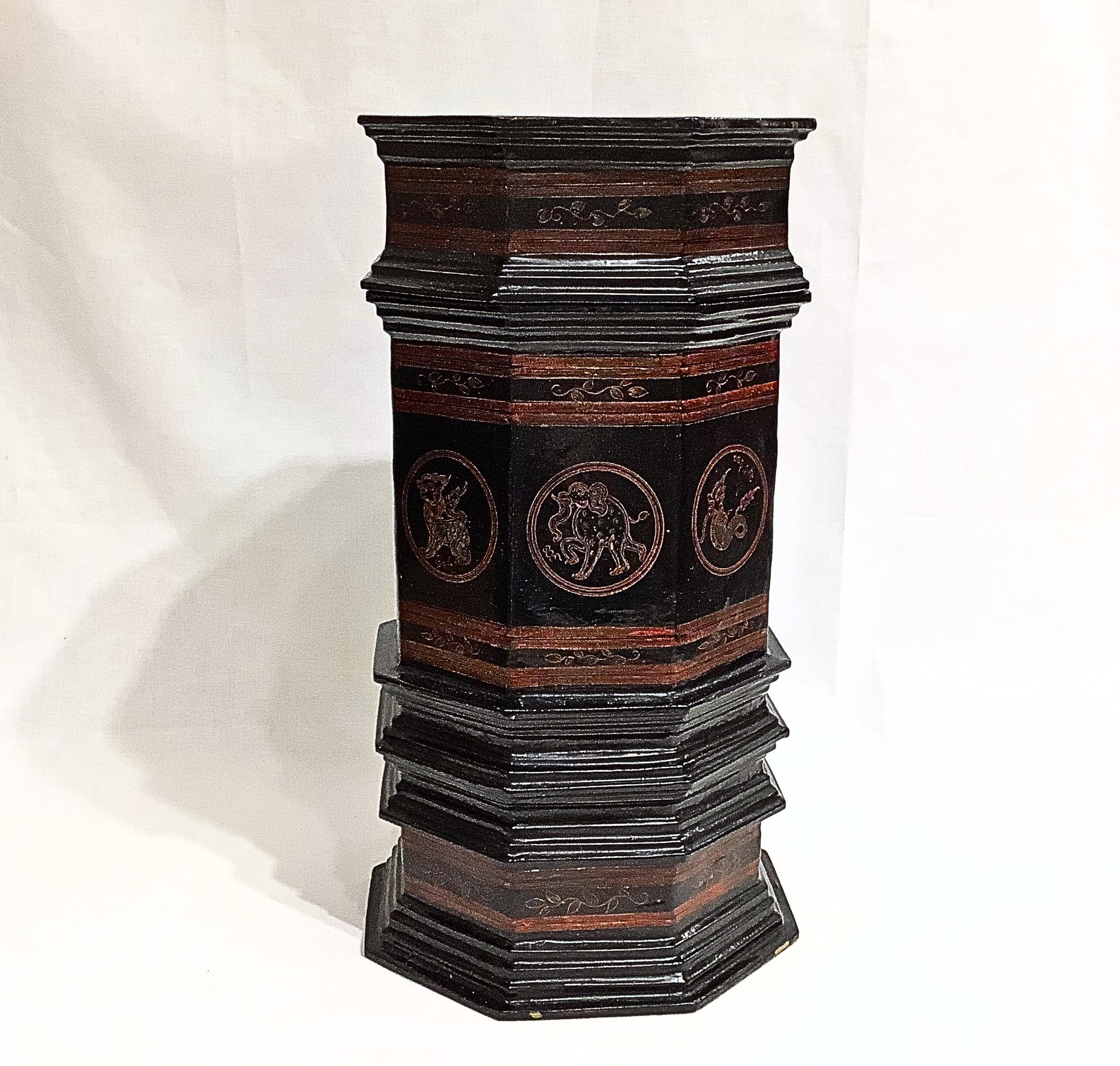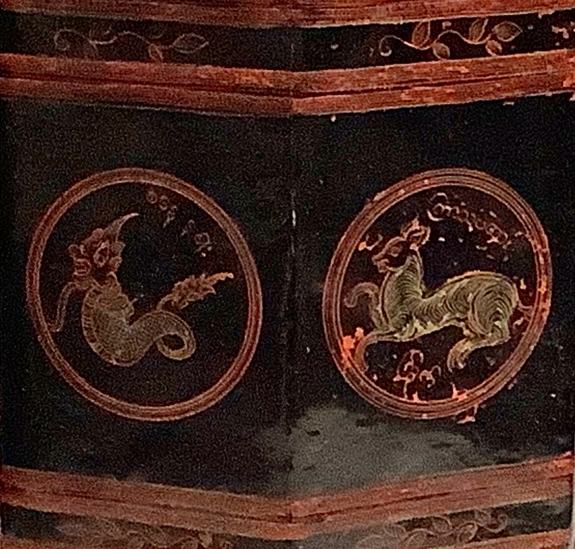 Southeast Asian octagonal box made of lacquered bamboo, and decorated with mythological creatures. This box is both uniquely stylish and functional.