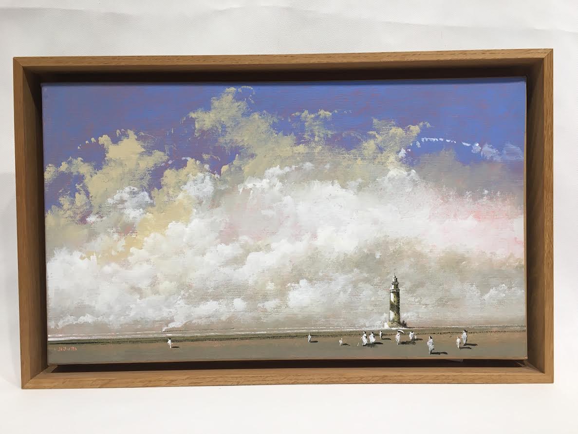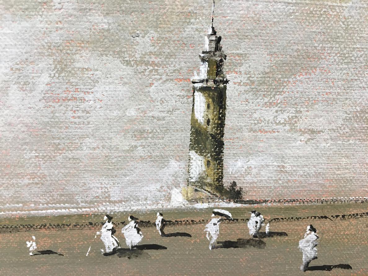Painting by Laurent Hours from his Lighthouse Series, circa 2007. Paint & varnish on canvas; framed by the artist. Excellent condition. Dreamy beach scene that offers a unique perspective. Laurent Hours is a french painter affiliated with the National School of Beaux Arts in Paris. His style is lauded for blurring the lines between the sea, the sky, the land; between real & imagined.