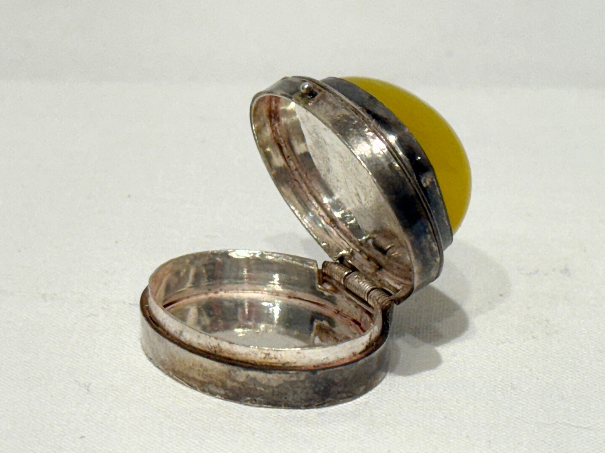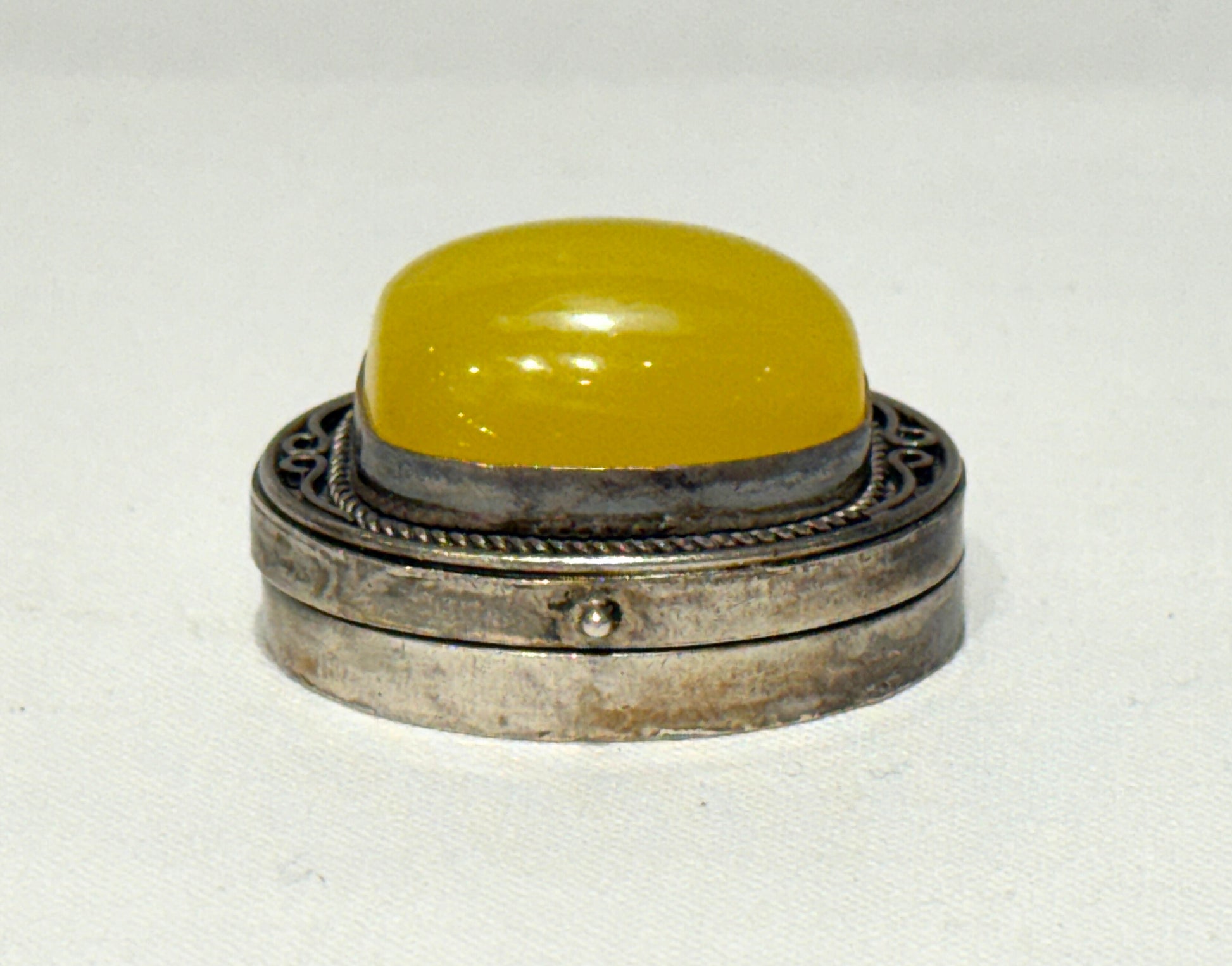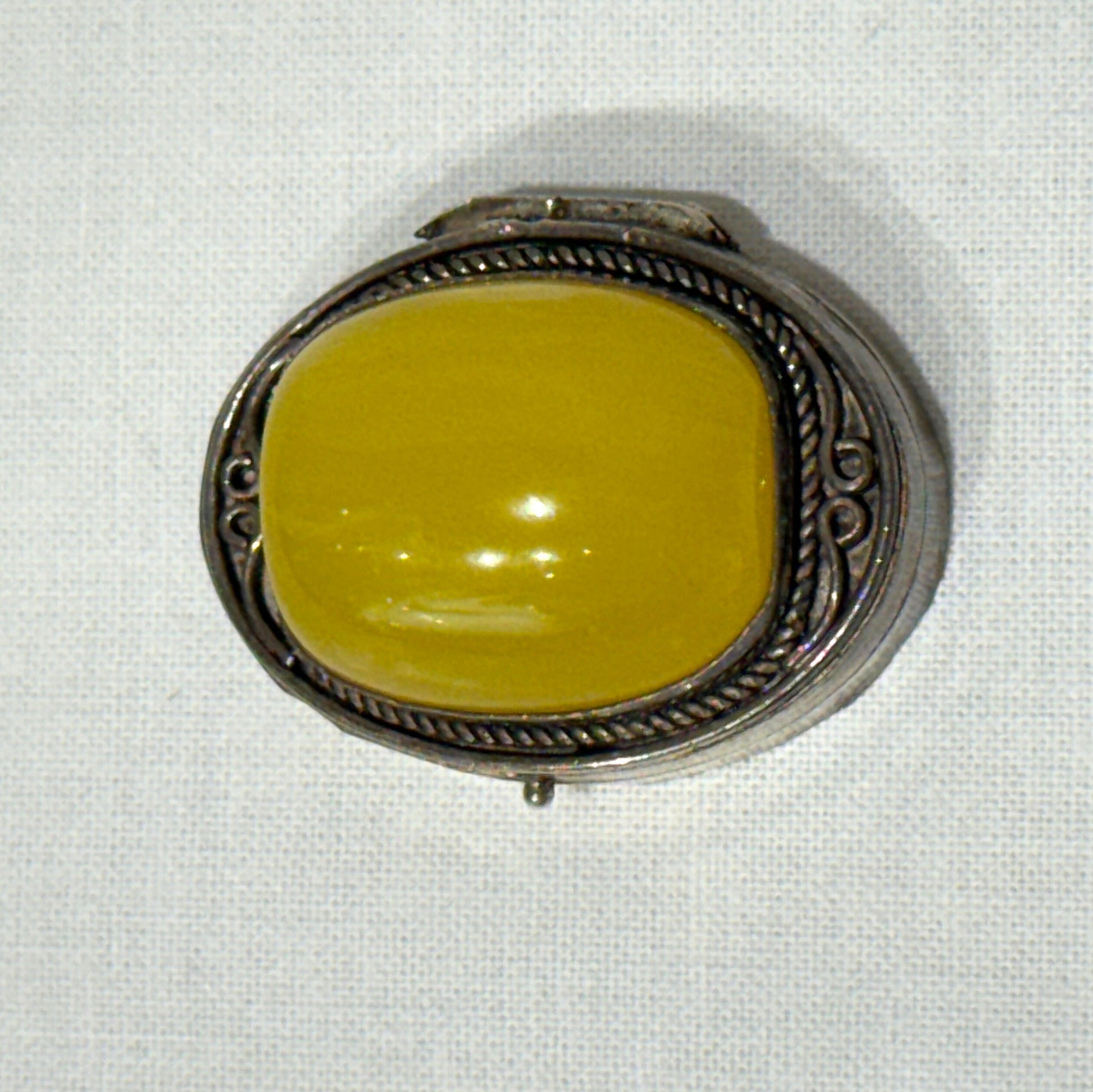 Sterling silver pill box, with cabochon yellow quartz on lid. Silver on lid is also etched, adding to it's overall elegance. 1 1/2" x '3/4.