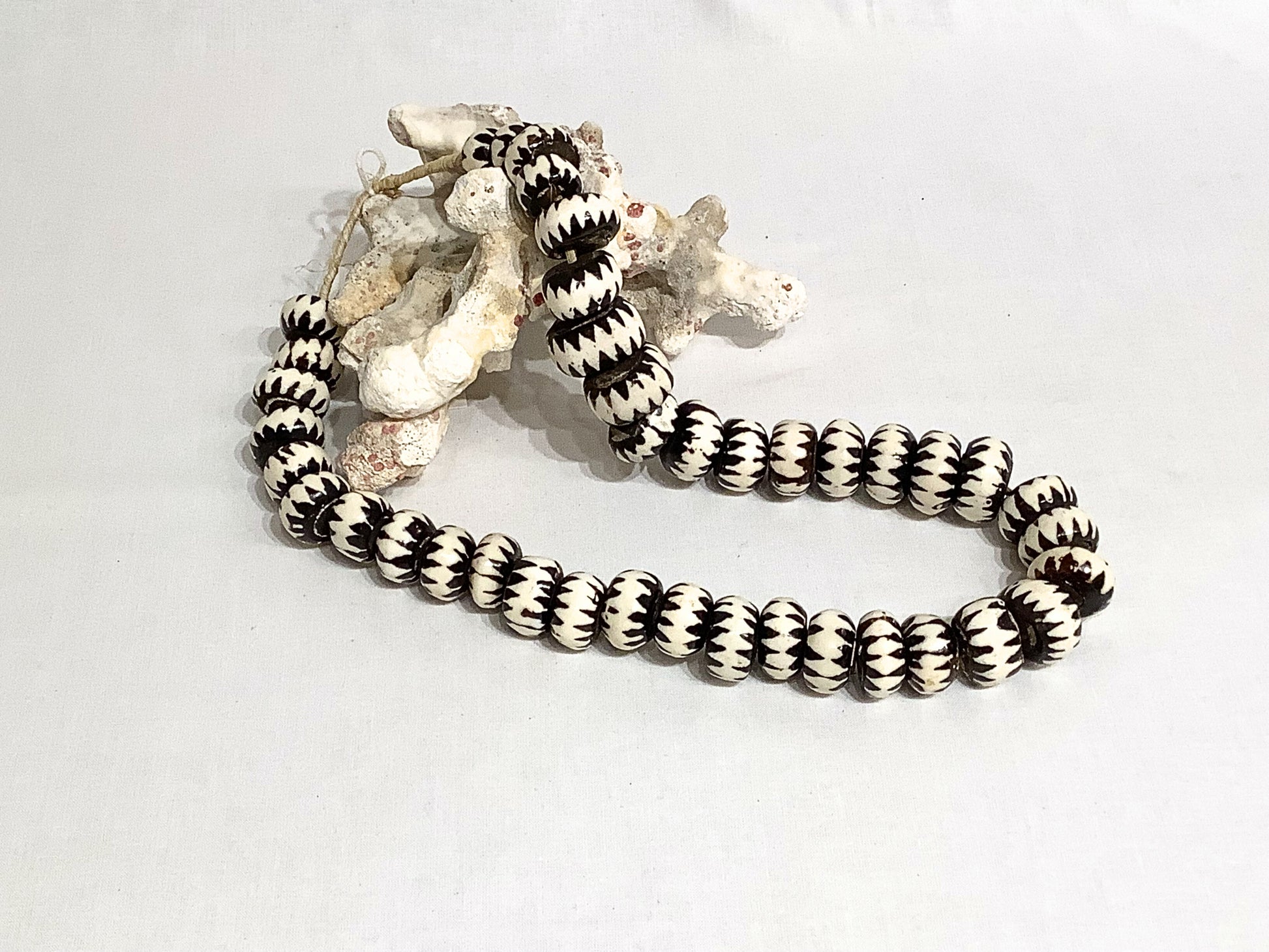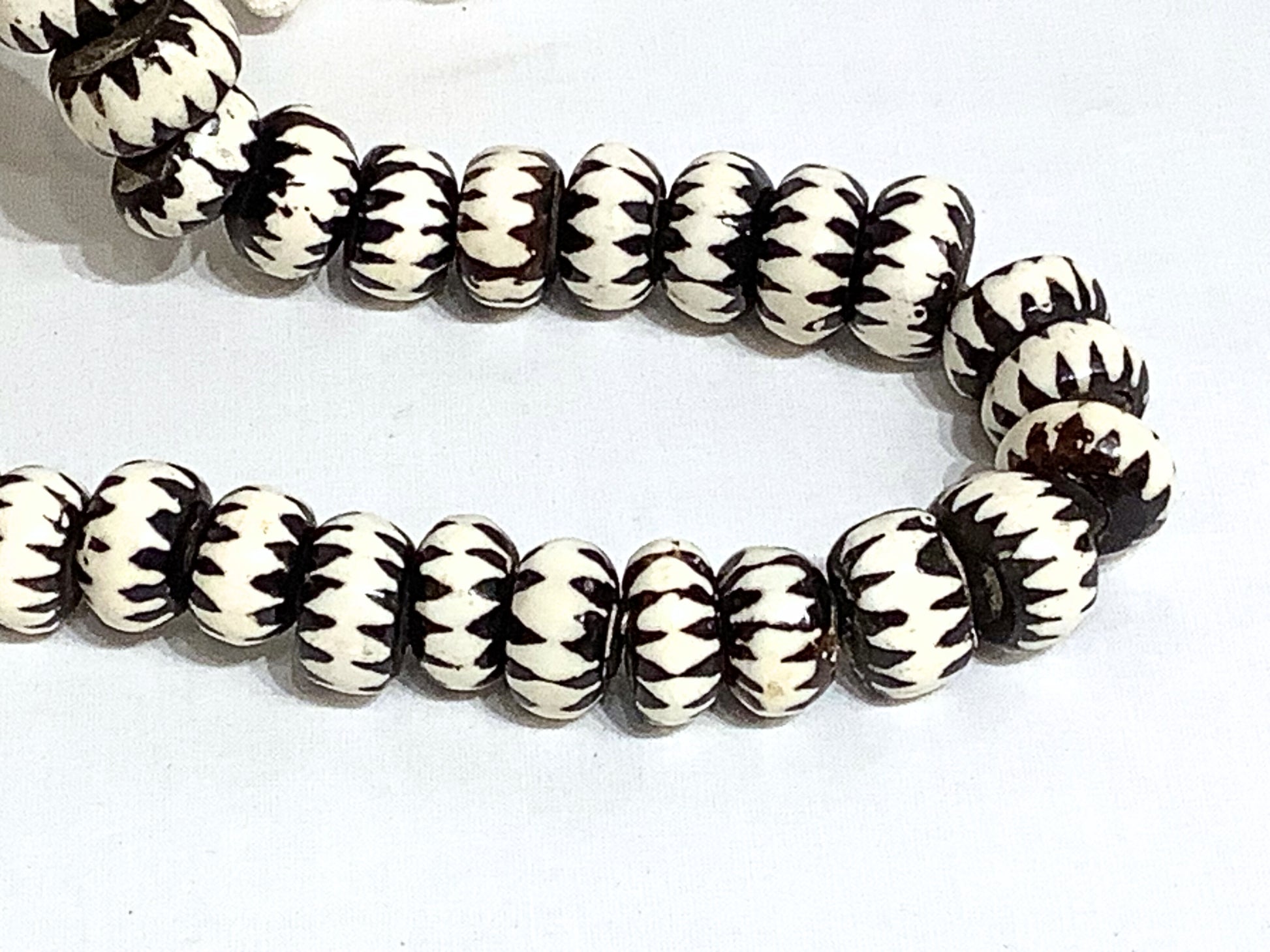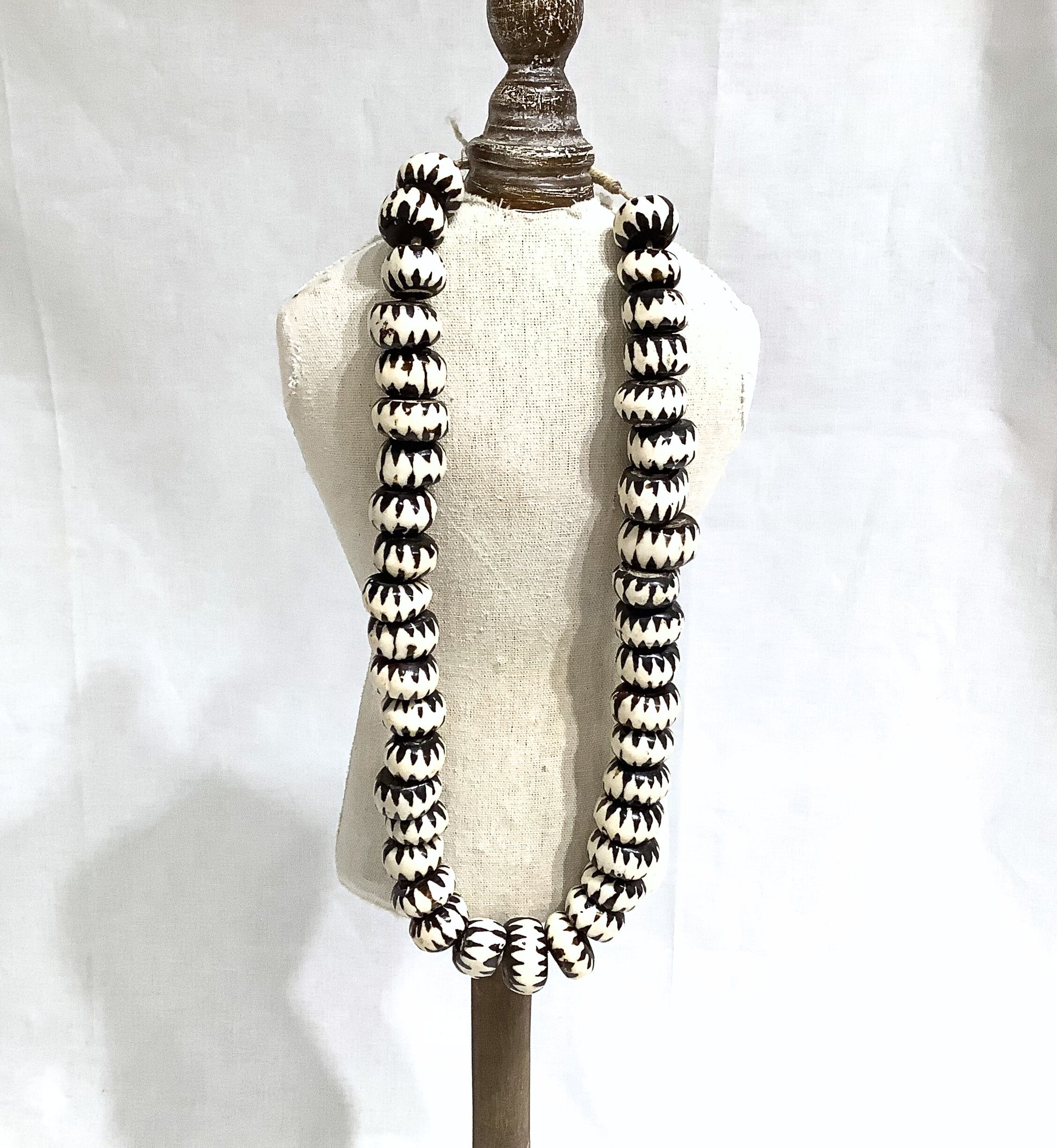 Beautiful carved beads from Kenya, made from cow bones. Each bead is roughly 1/2" in length. There are 40 beads on the stand, and they are strung together using think cotton cord. Worn as a necklace, they pair well with casual and evening attire. Beads make also be used individually as trim for decorative items. Sold as a strand.