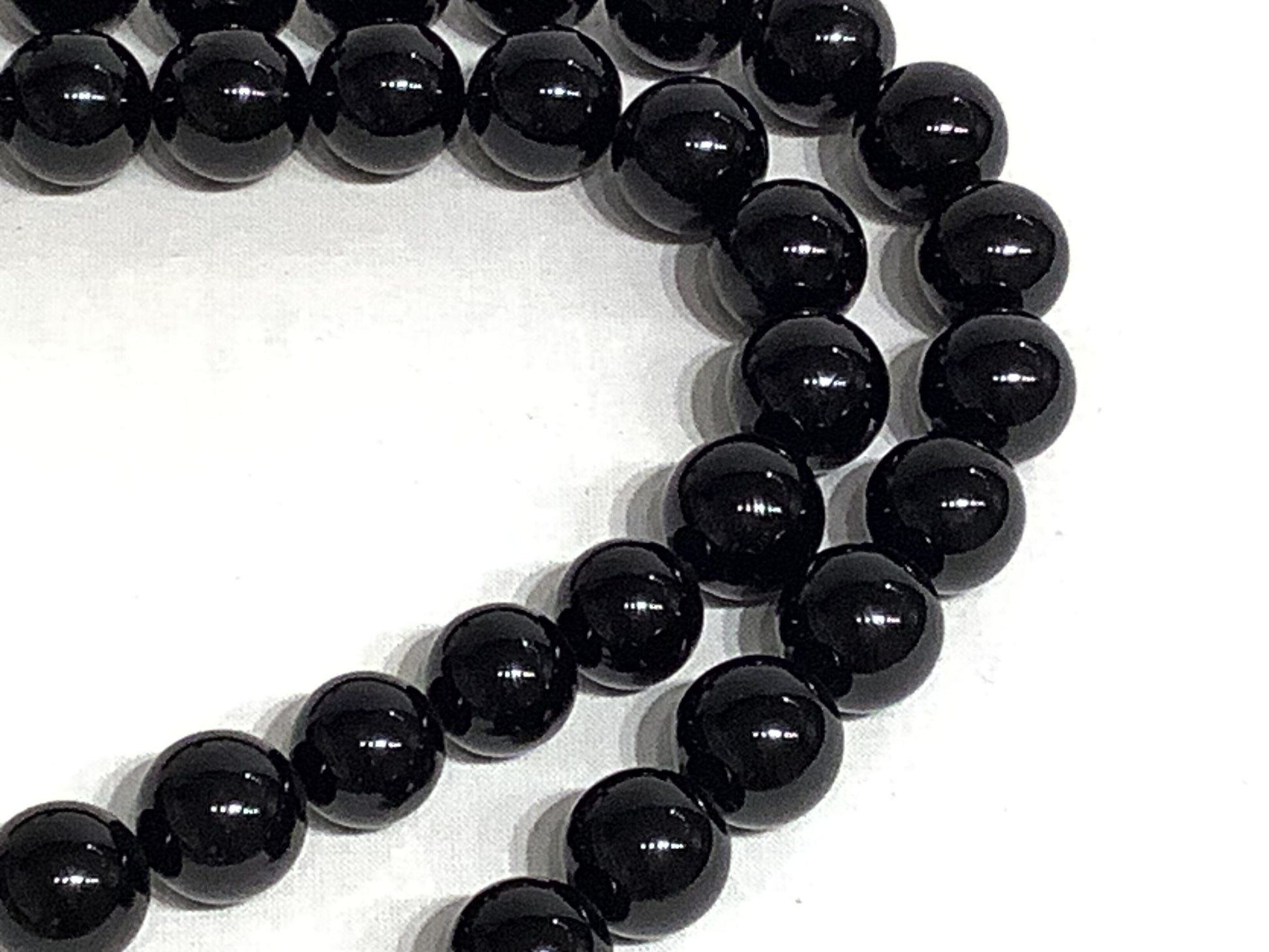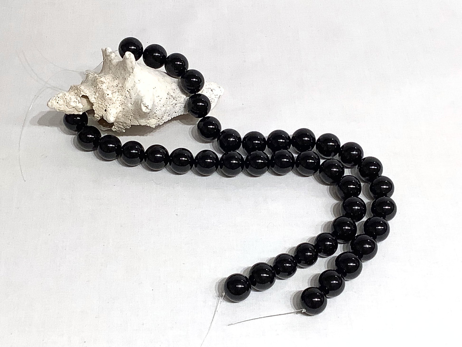Strands of highly polished, natural black onyx beads. There are 20 beads per strand, and each bead is approximately 3/4" long. Beads may be strung on cord and turn into a necklace or may be used individually as decorative trim.