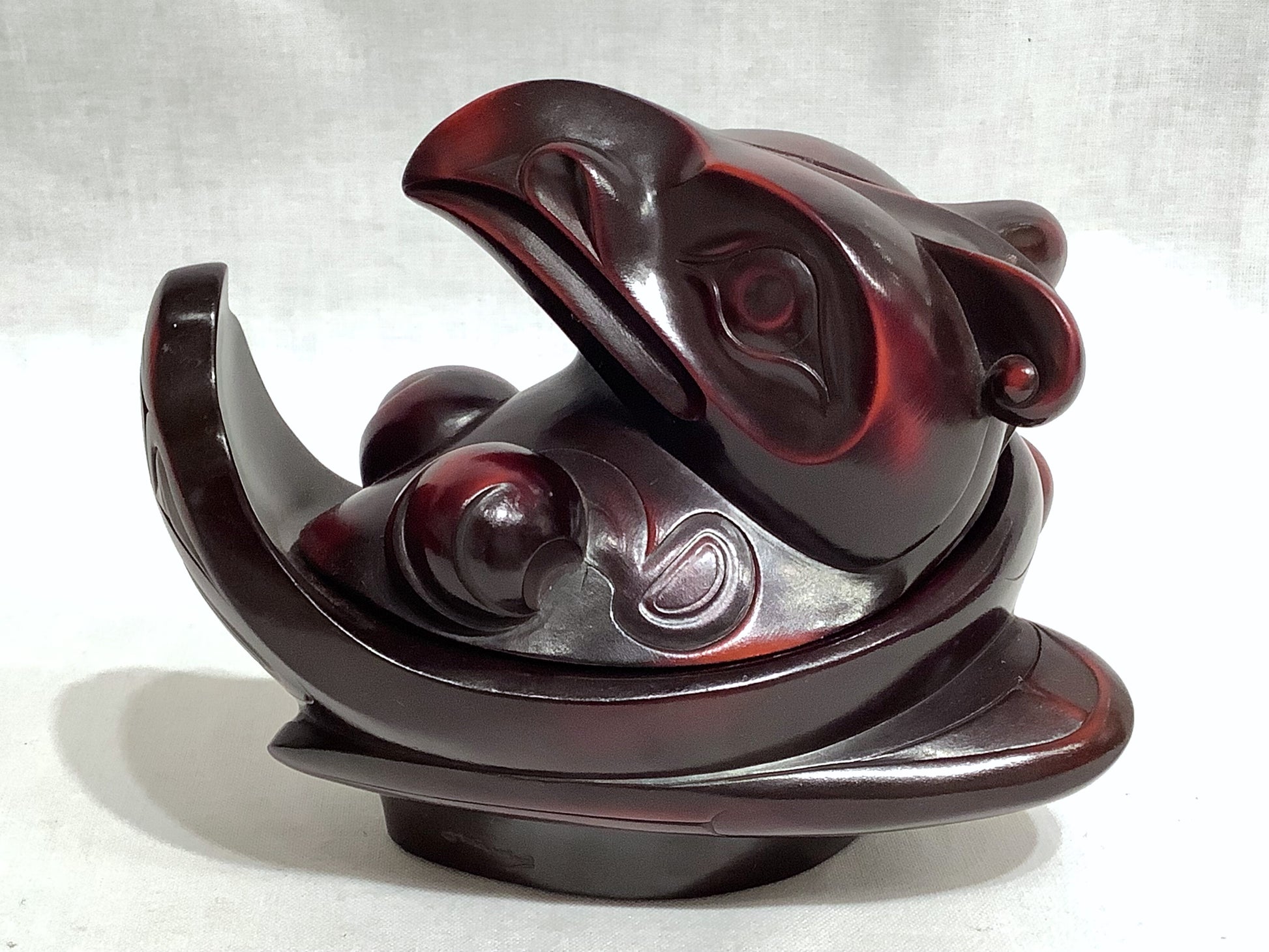 This box is a replica of classic Native First Nations artworks. It is made from resin, and is 5" x 4.5".