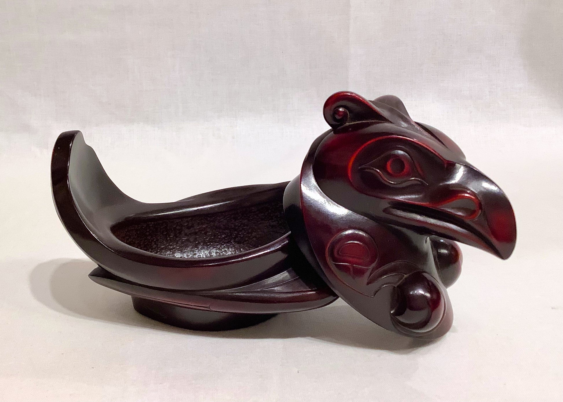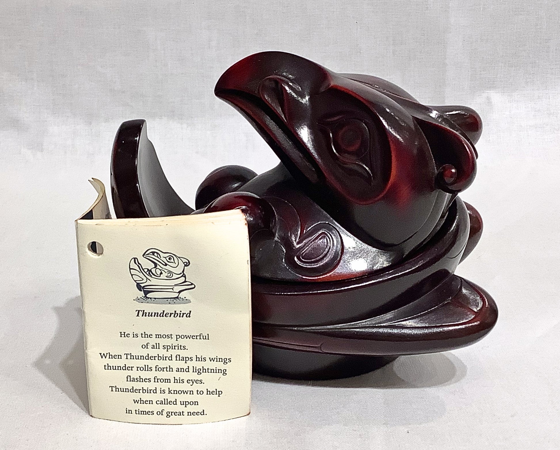 Thunderbird spirit box produced by Boma Canada Native Indian Art. For the North American indigenous peoples, the Thunderbird is the most powerful of the spirits. Thunder comes from the Thunderbird flapping its wings, while lightning flashes from its eyes.