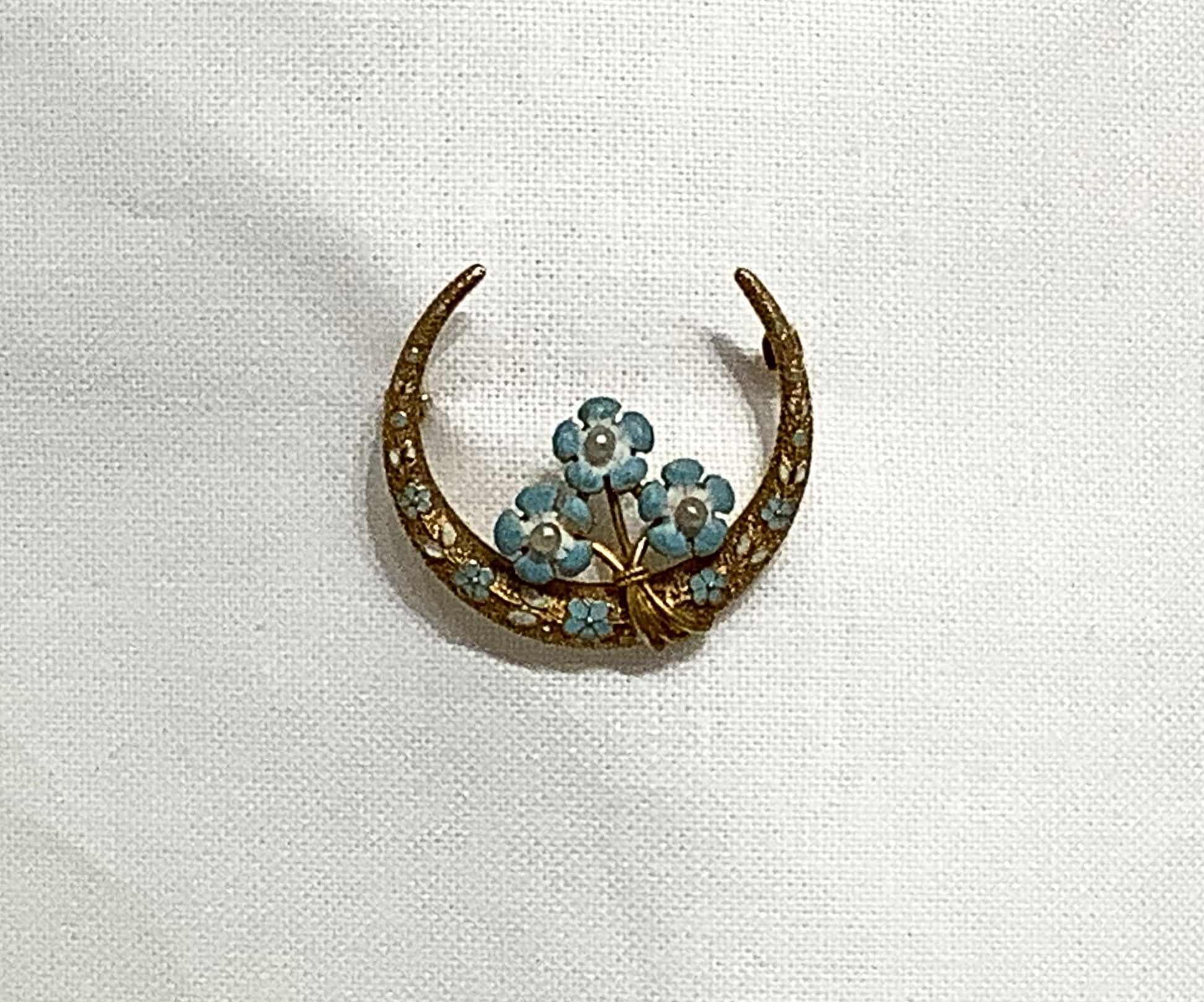 Victorian brooch in the shape of a gold crescent moon, with enamel and seed pearl forget-me-not flowers. Forget-me-nots are considered symbols of remembrance, true love, and loyalty. They were popular motifs for love tokens during the Victorian period.