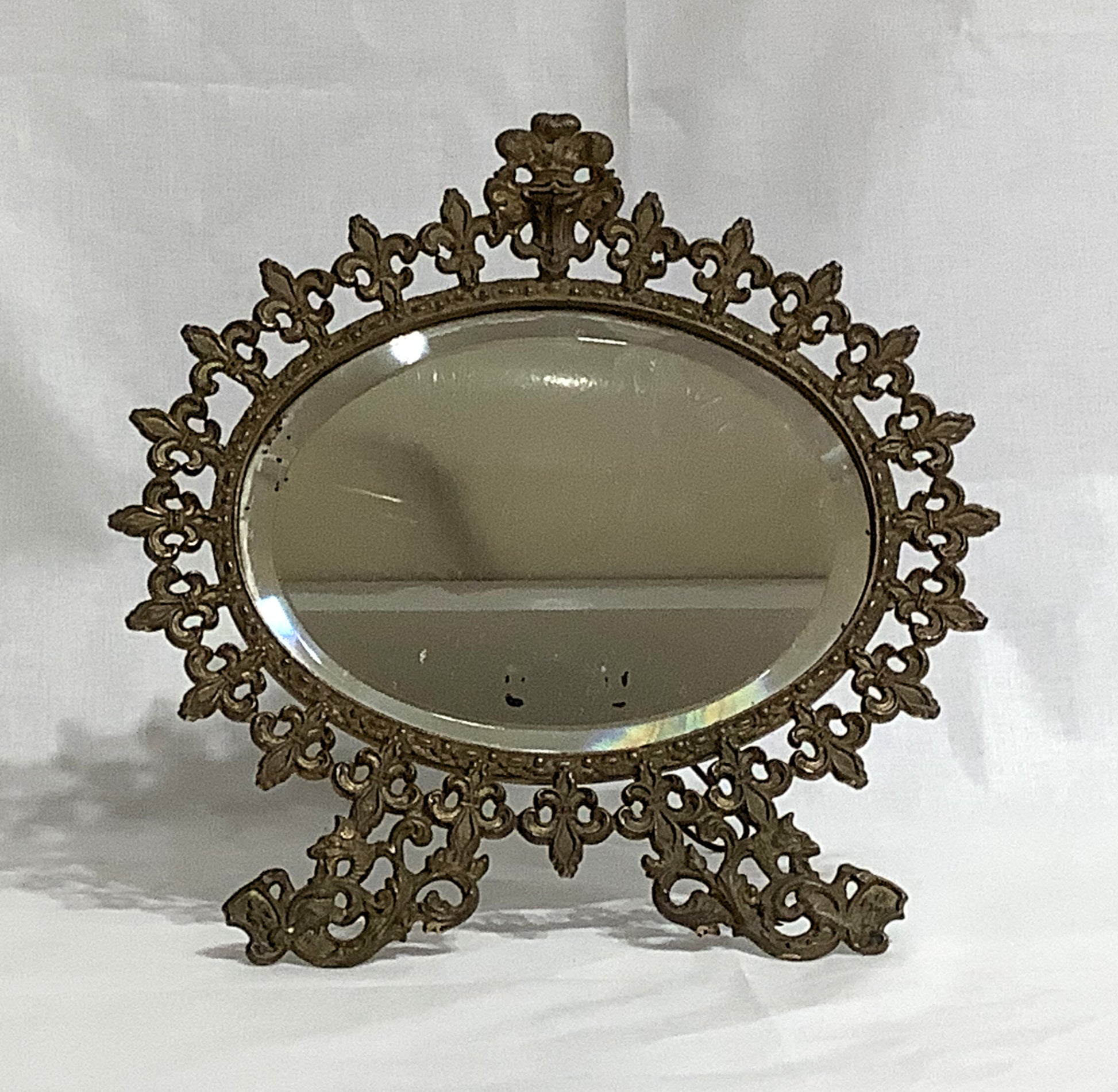 Beautiful antique mirror frame made of caste iron. Decorated with flour de lis, knight's helmet and dragons. Hinge to hold it upright in good working order. Can be kept as a mirror or turned into a picture frame, either way, this piece would enhance any room. Size 11" x 11".