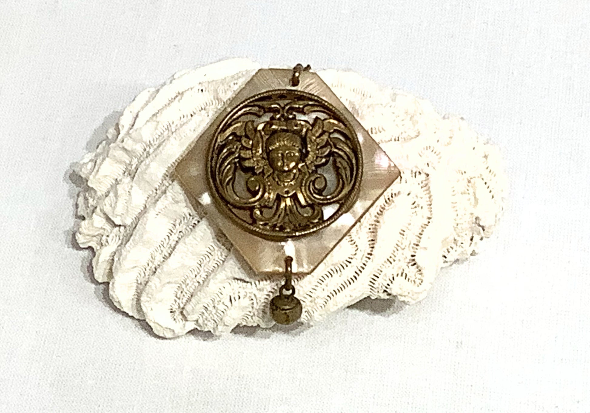 Antique pendant made from mother of pearl, covered by gold relief of a putto, with a small gold ball drop suspended below. Pendant comes with a dainty gold chain. Necklace can be dressed up or worn casually.
