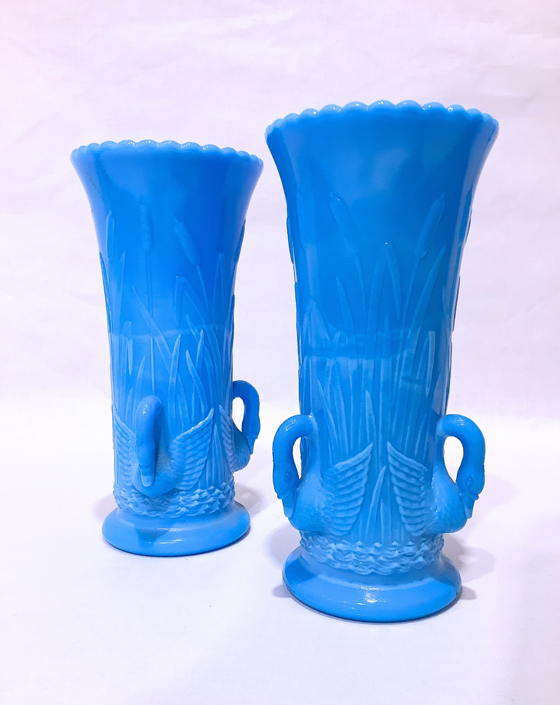 Antique, Victorian milk glass vases, with swan designs. Vases were part of the Cabot Lodge estate, 94 Main St, Nantucket, Mass. Sold as a pair.