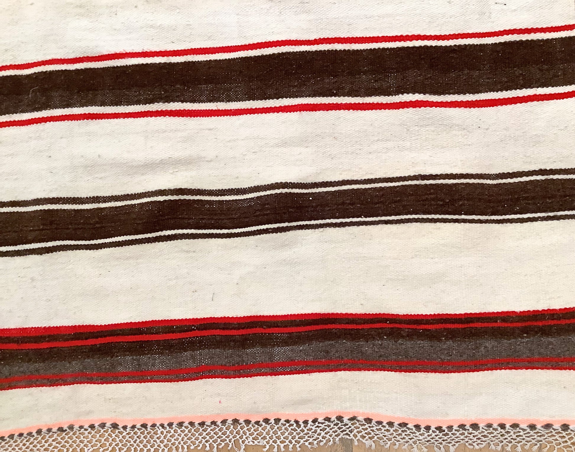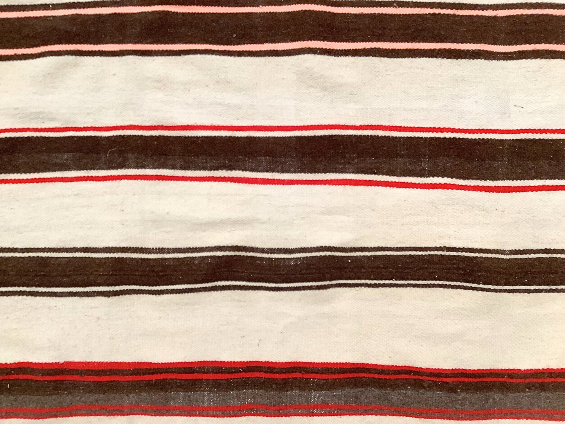Beautifully striped Berber kilim in warm tones of peach, tomato red and black coffee, on an ivory background. This carpet is 100% wool and has a durable flat weave.