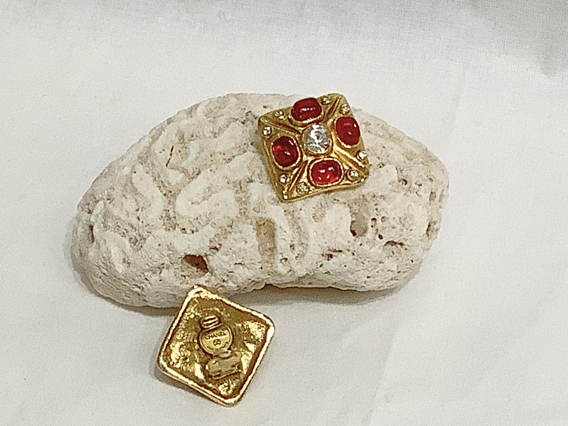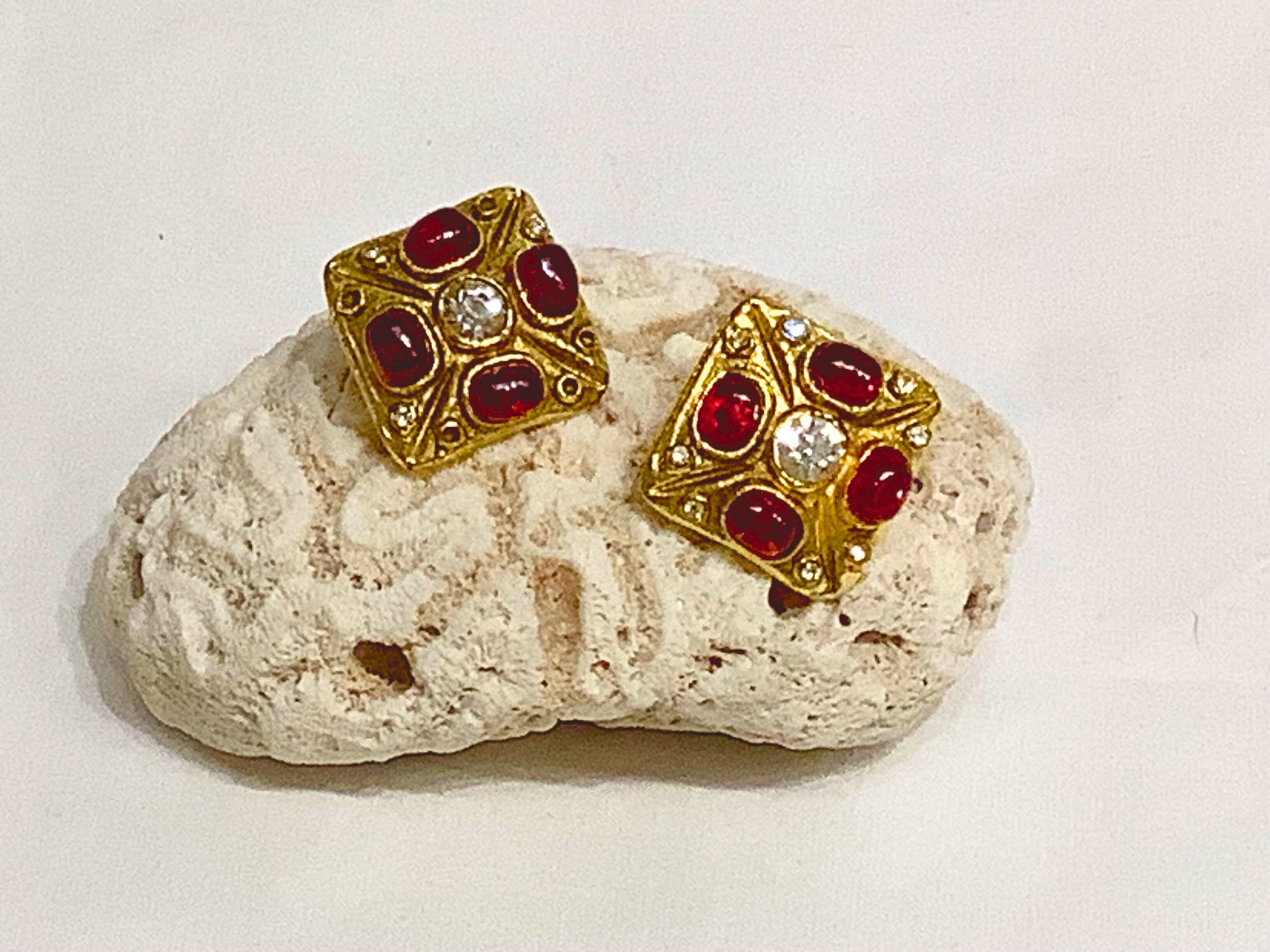 Authentic Chanel clip earrings, from the 1990's collections. Baroque style, with red glass stones, and Czech crystals. One clip is missing some small crystals, but otherwise in the pair is in good condition.