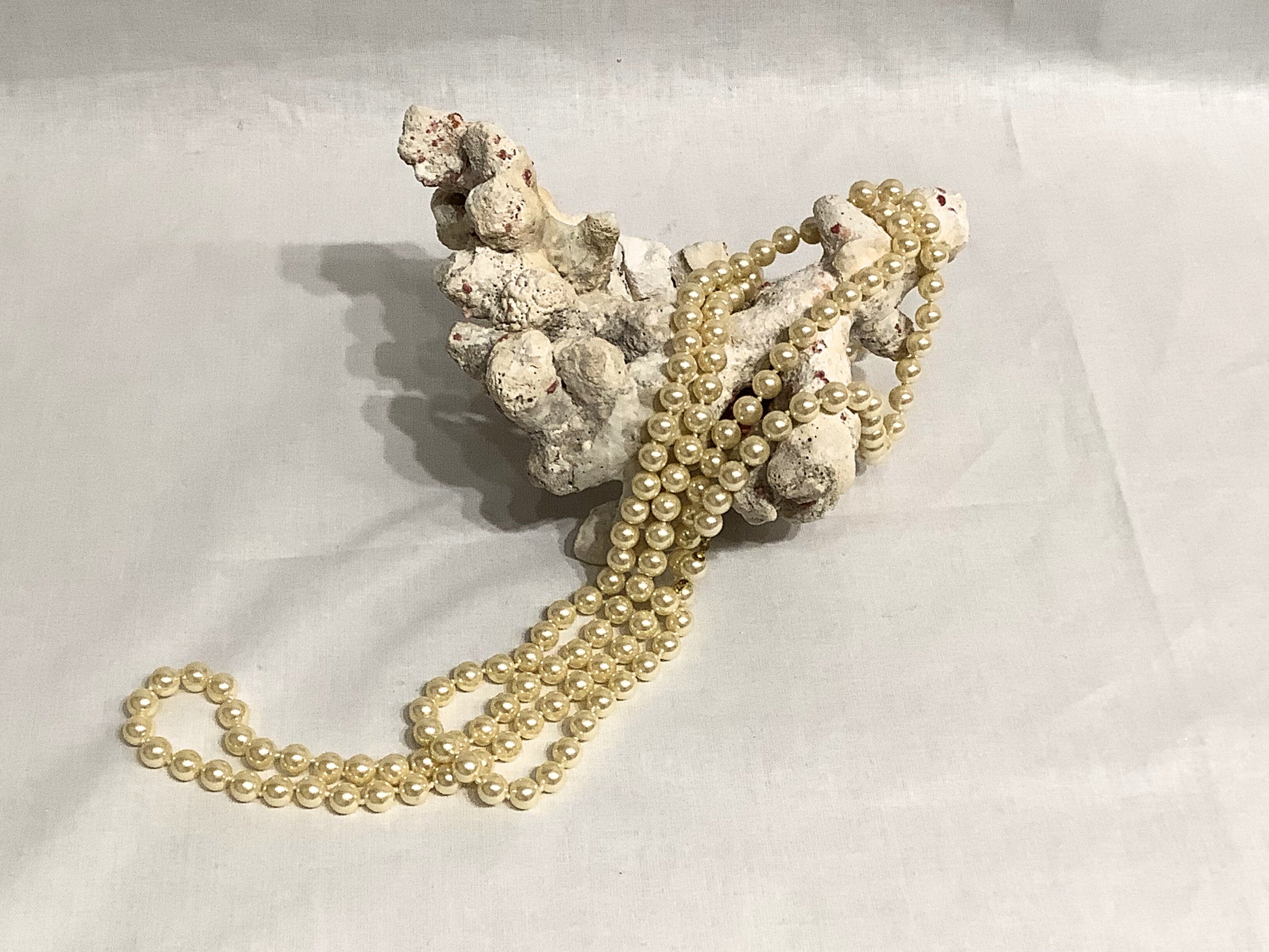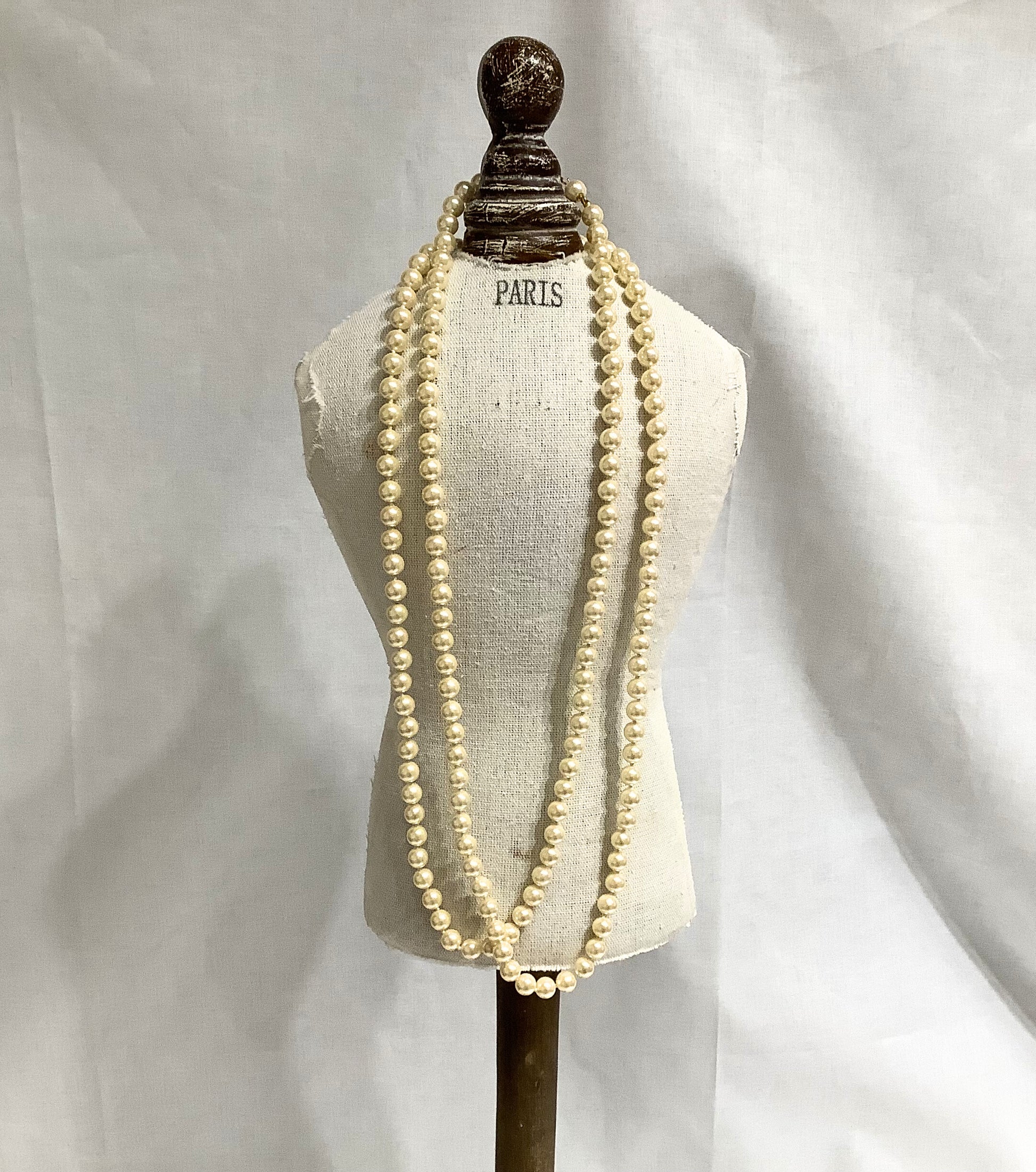 Long stand Chanel costume pearls. Unmarked but verified as runway sample by the previous owner, a top Chanel executive. Each pearl is individually knotted. The necklace is in great condition.