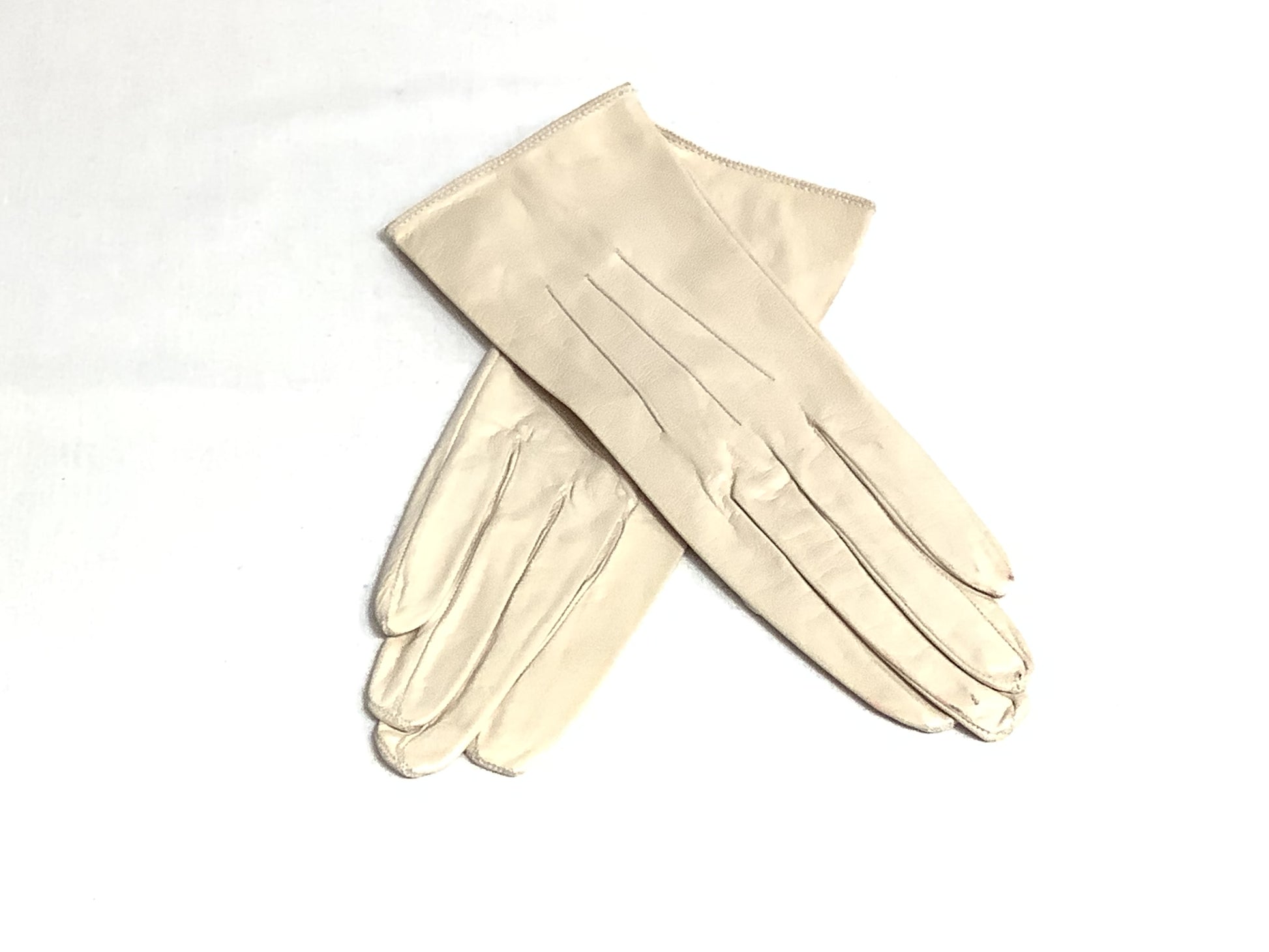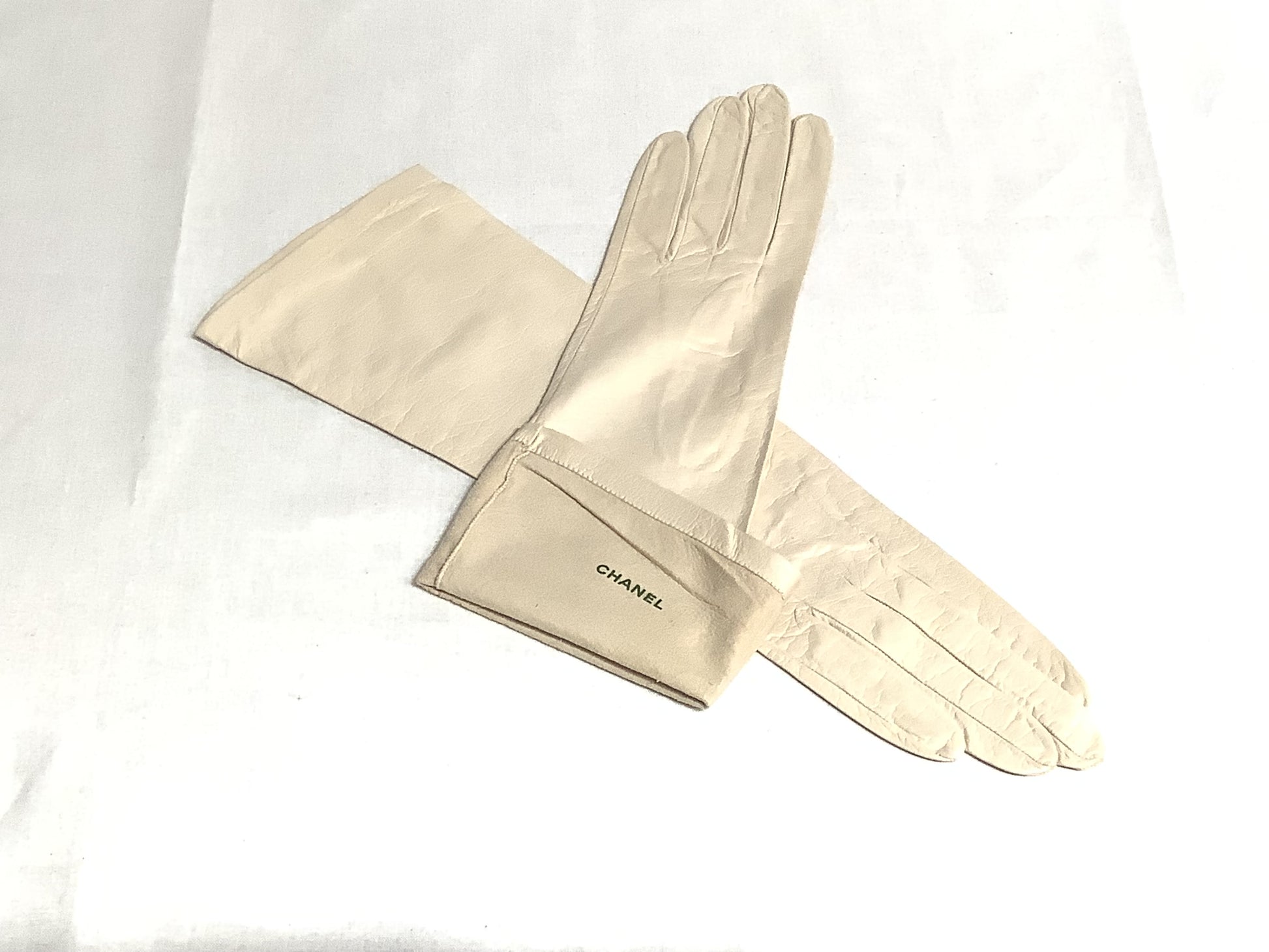 Lambskin Chanel gloves in cream. They have never been worn, but they do contain a barely visible stain on one glove, otherwise in excellent condition. The leather is smooth and soft.