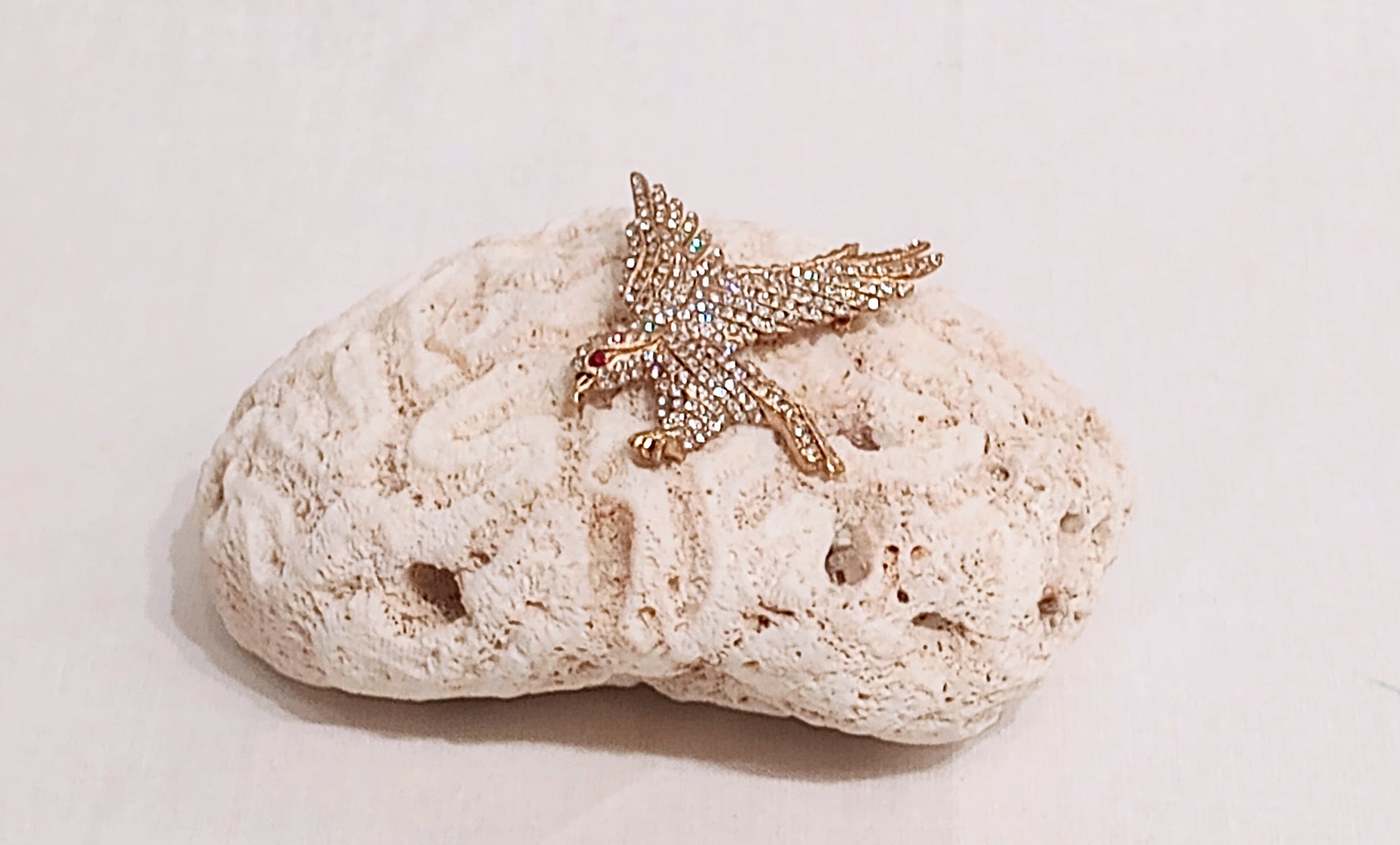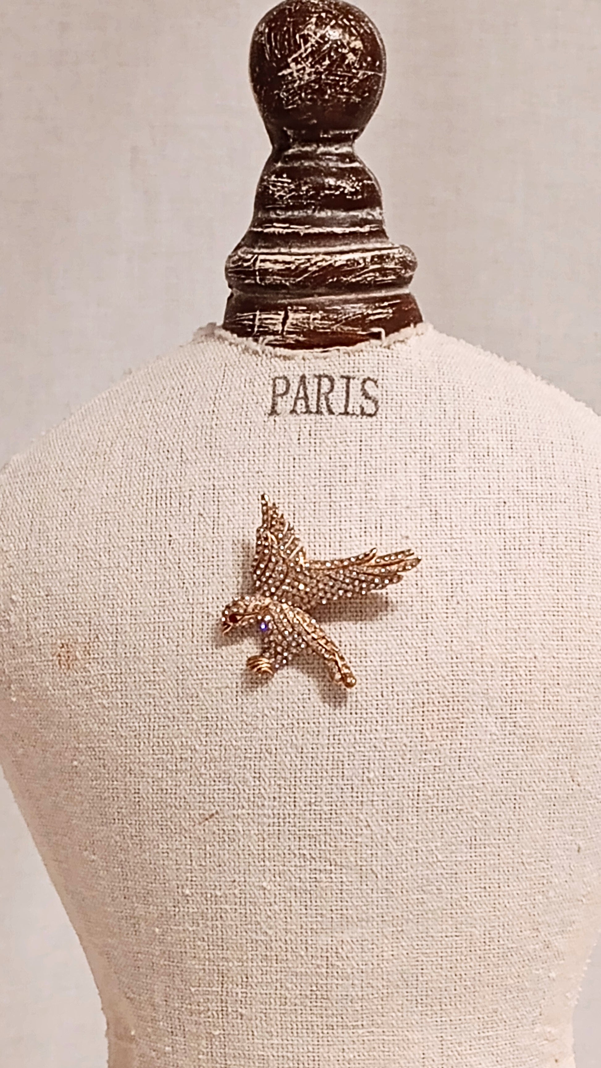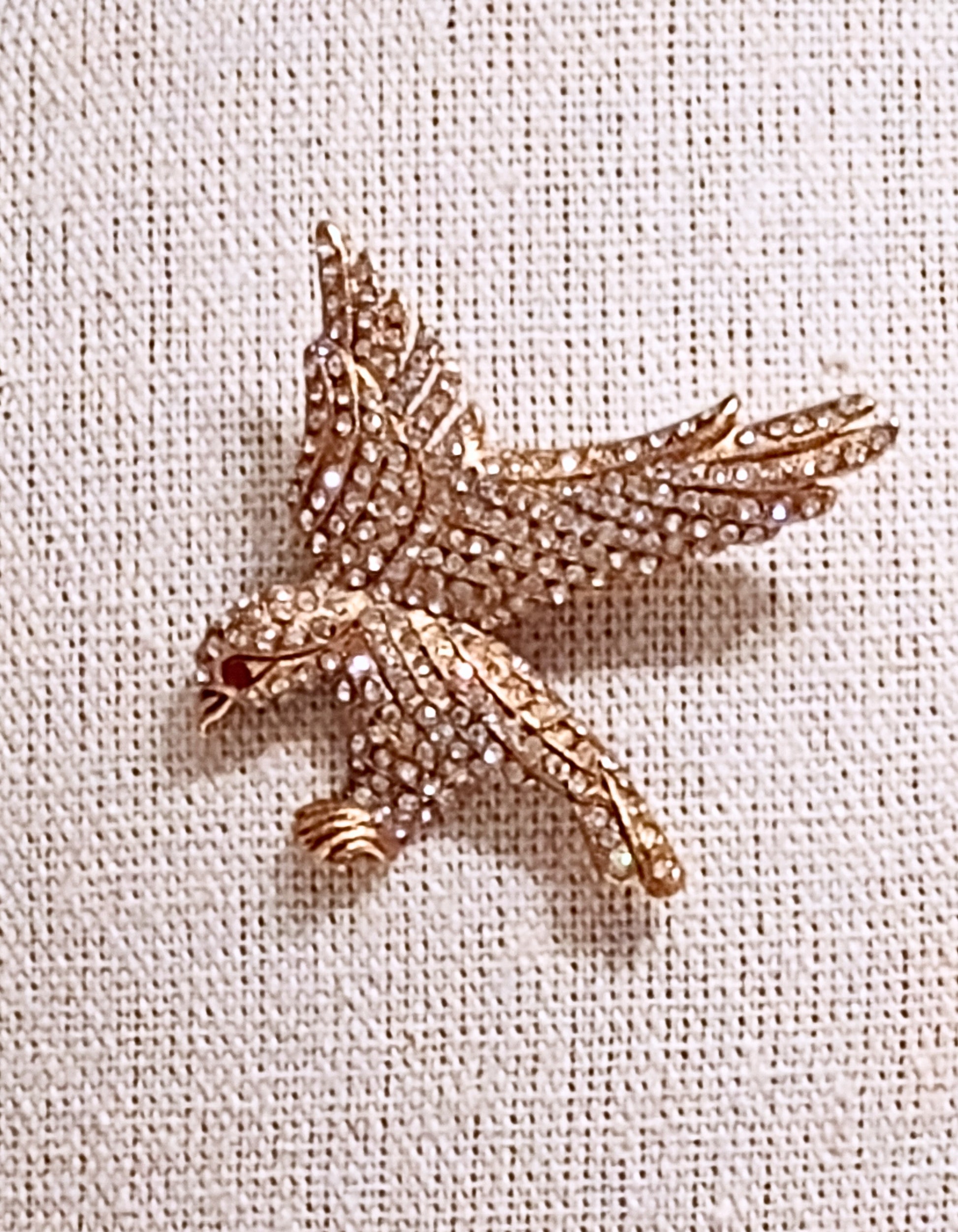 Vintage Chanel Eagle pin, in gold metal with rhinestone crystals. Authentic Chanel, previous owner was a top exec of the company, verified pin was used as a runway sample, in the Spring/Summer 2001 collection. Pin size is 1.73" x 1.85".
