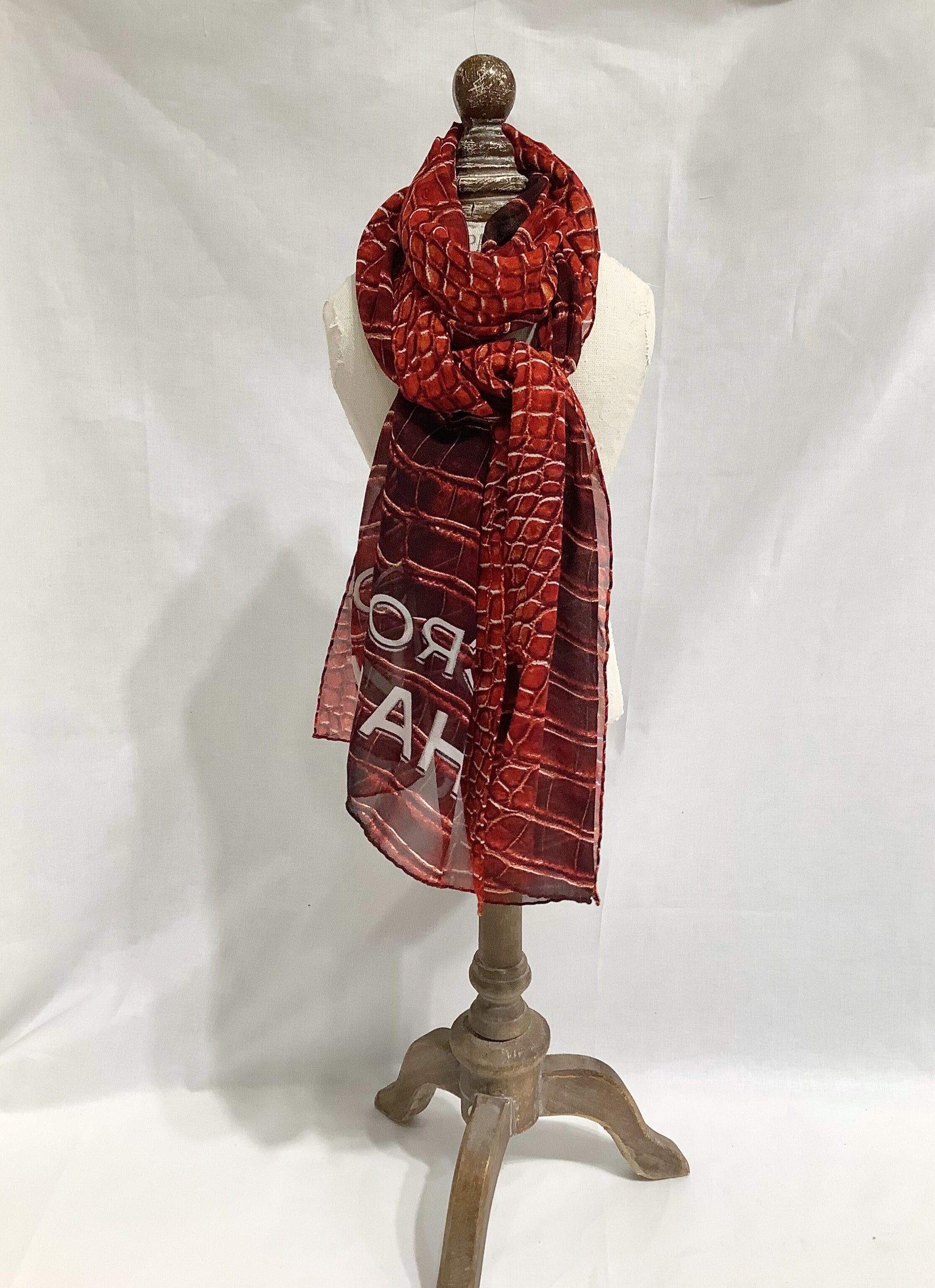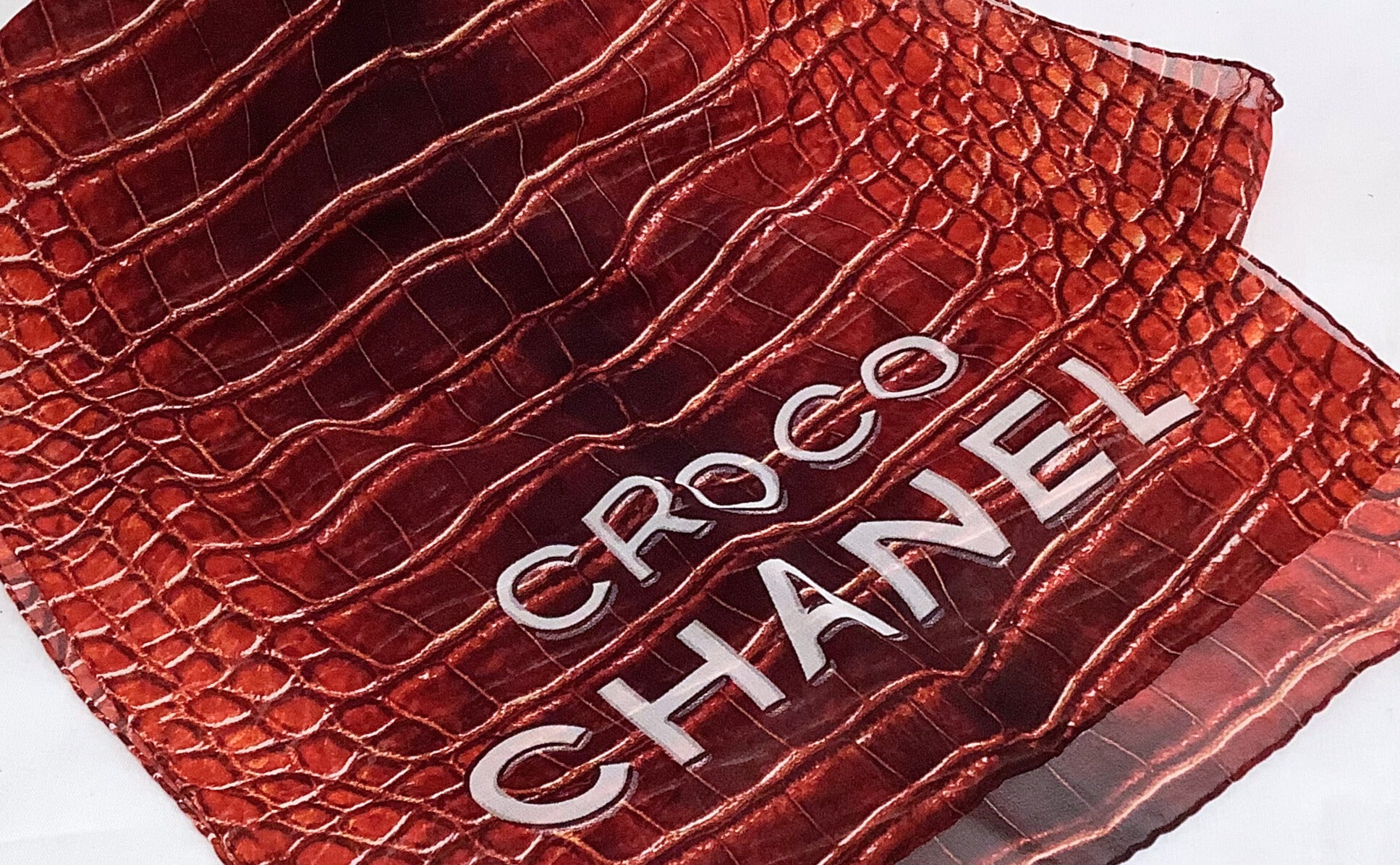 Authentic "Croco Chanel" scarf in red and black crocodile print. 100% silk. Size 52" x 12.5".