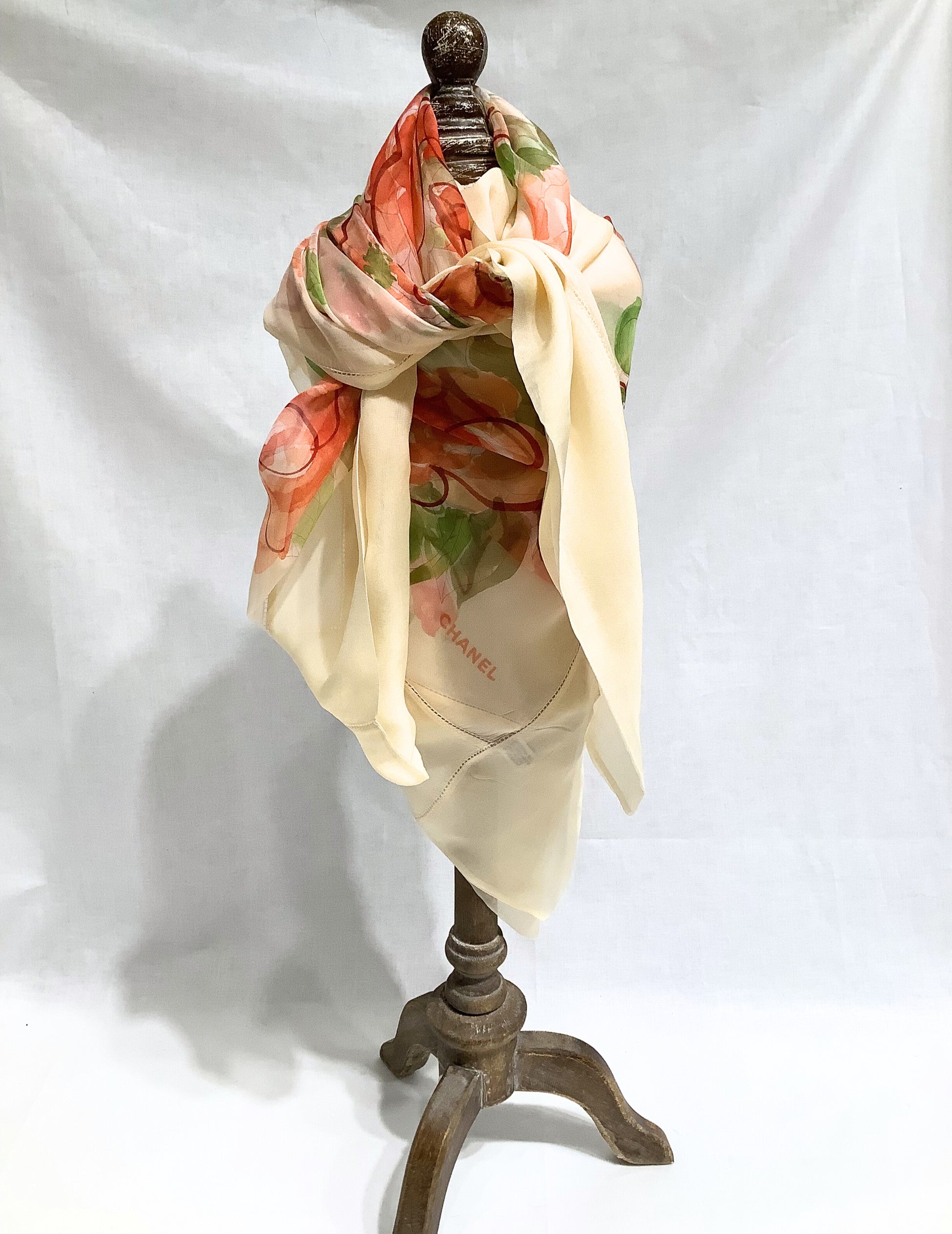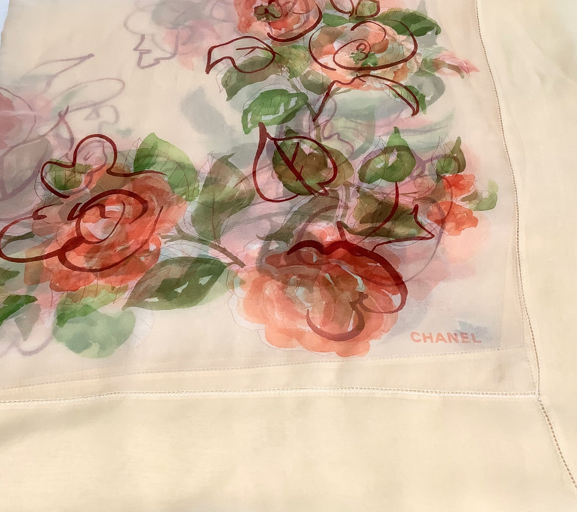 Lovely ivory and peach camellia flower pattern. Authentic Chanel and 100% silk. Contains delicate stitch work connecting the boarder to the floral panel. Size 38" x 38".