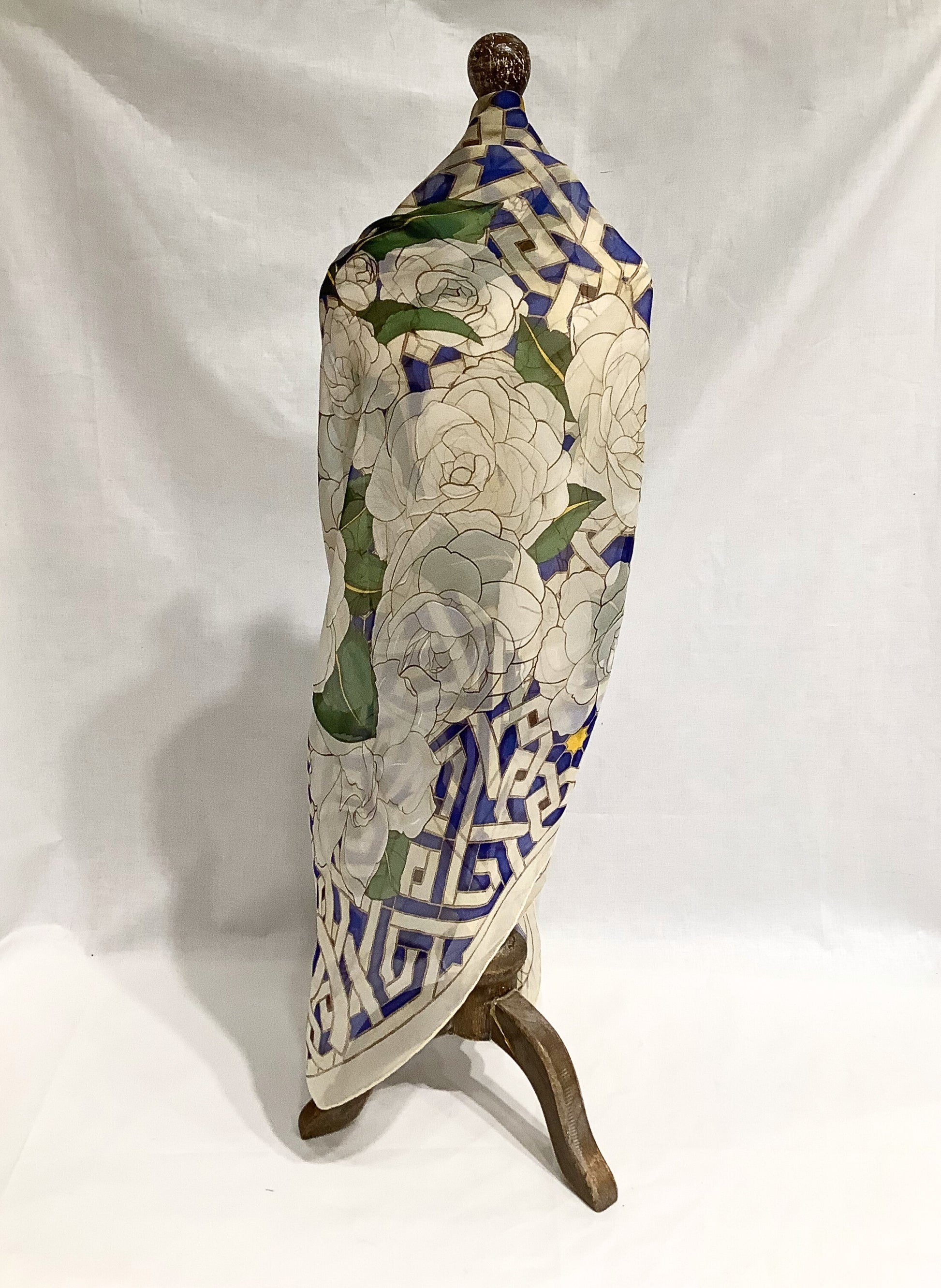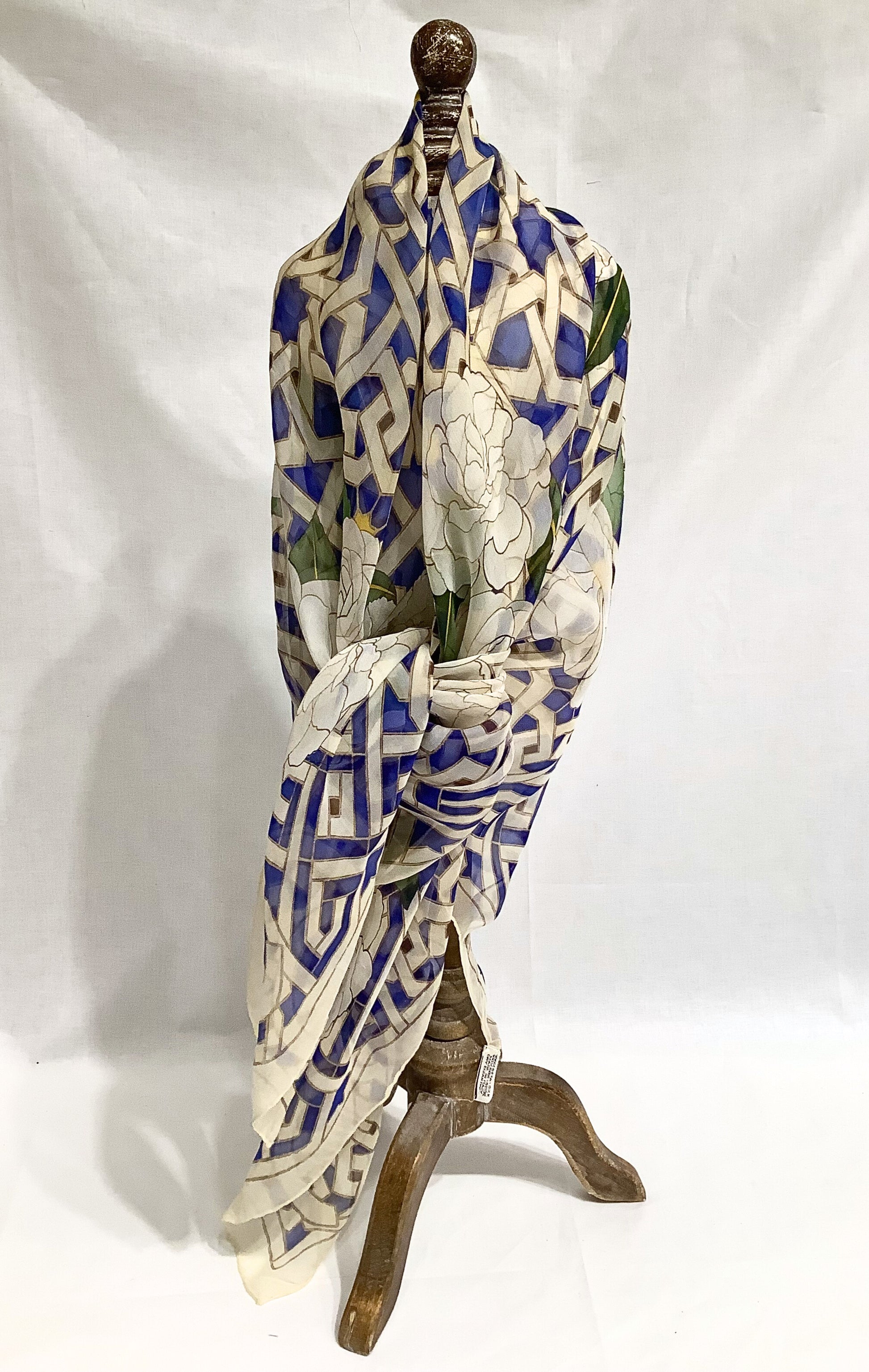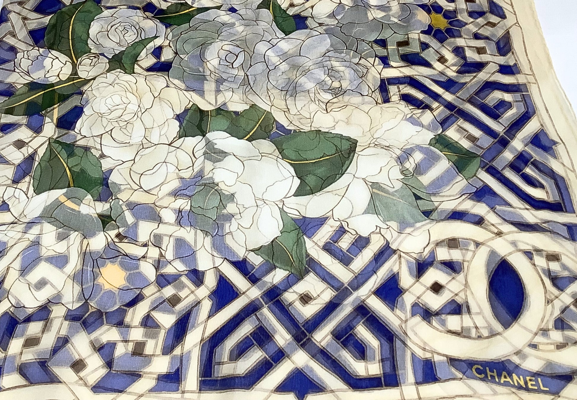 Beautiful 100% silk, authentic Chanel scarf in sheer camellia and trellis pattern. Size 38" x 38".