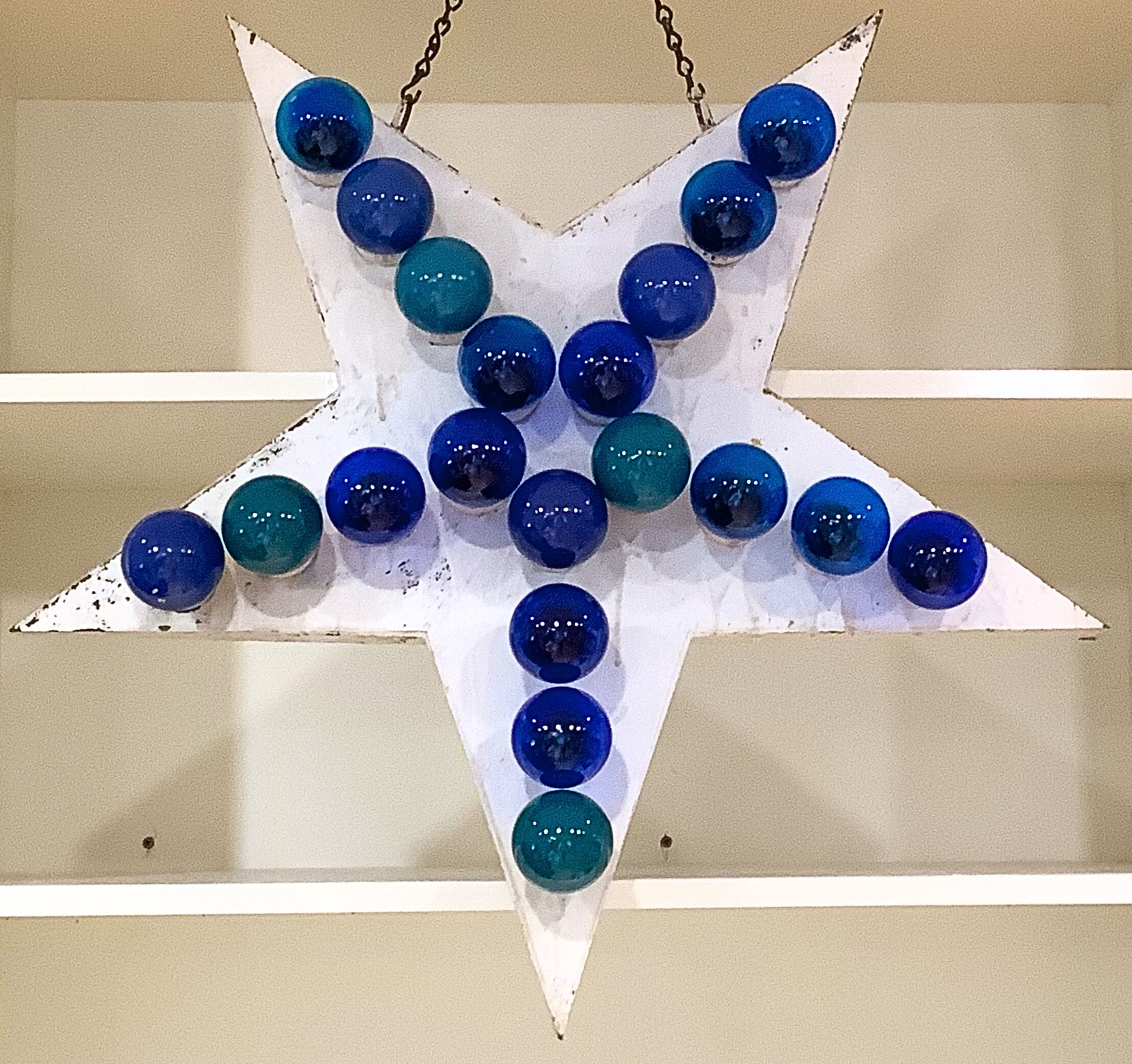 What a great piece of folk art, and a bright one at that. This vintage circus light has a sturdy chain, and comes with blue and green bulbs. The light can fit standard lightbulbs, so you can choose your colors, or switch them out throughout the year. The lamp works, but the wiring is old, so it should be rewired.