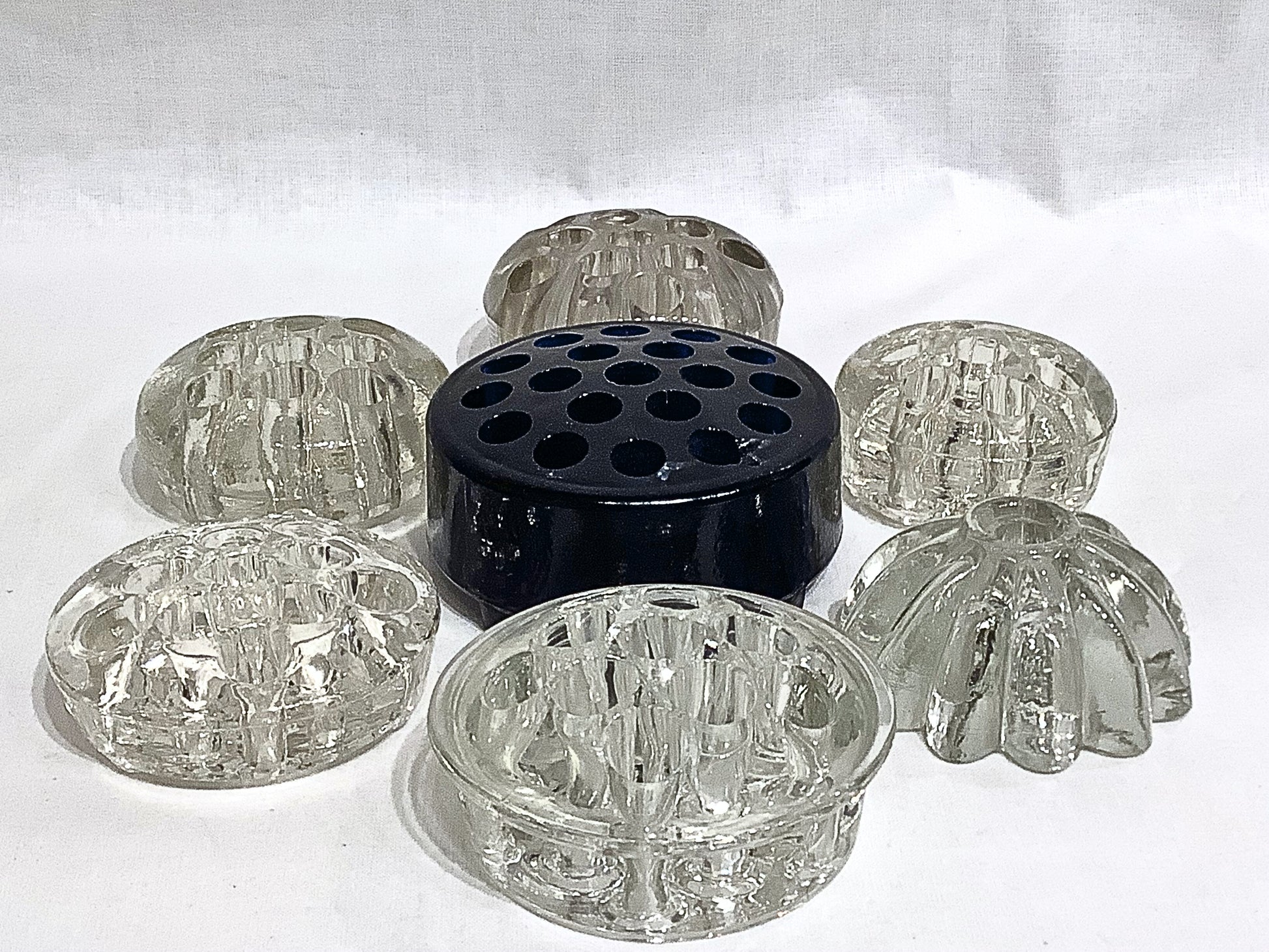 7 glass flower frogs. Six clear glass and one in blue glass. Sold as a set. May be used in its intended function, as paperweights, or as decorative items. All made of good quality glass.