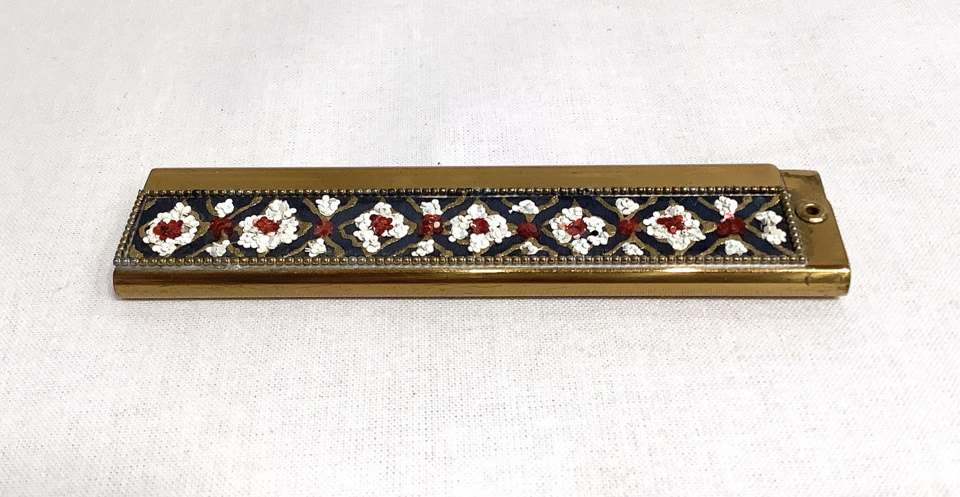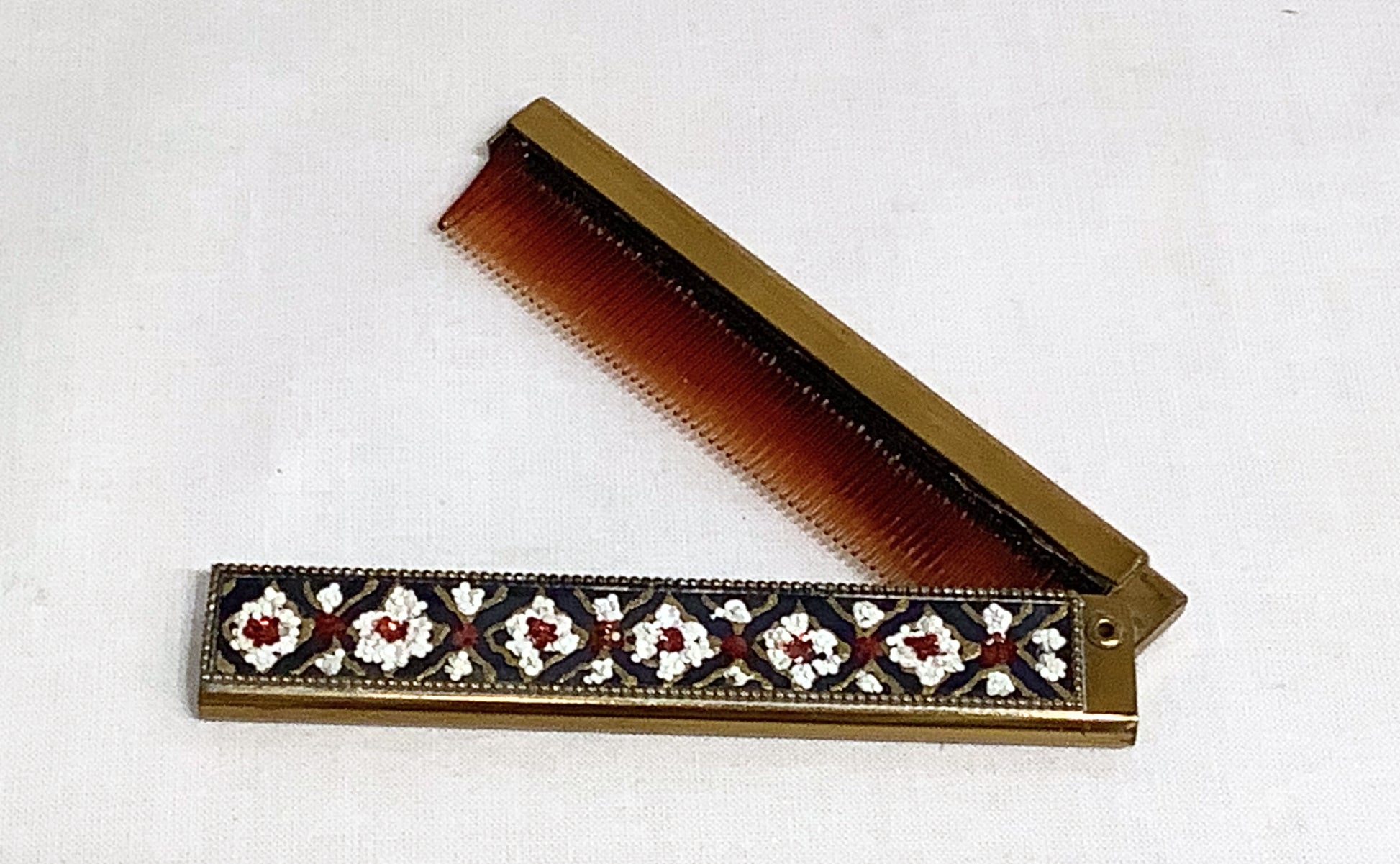 This vintage compact comb from the 1950's is in excellent condition, with no damage to the comb's teeth or the compact's beaded pattern. This stylish compact comb is sure to up the elegance of an evening out. Item is 4" x 3/4" x 1/3".