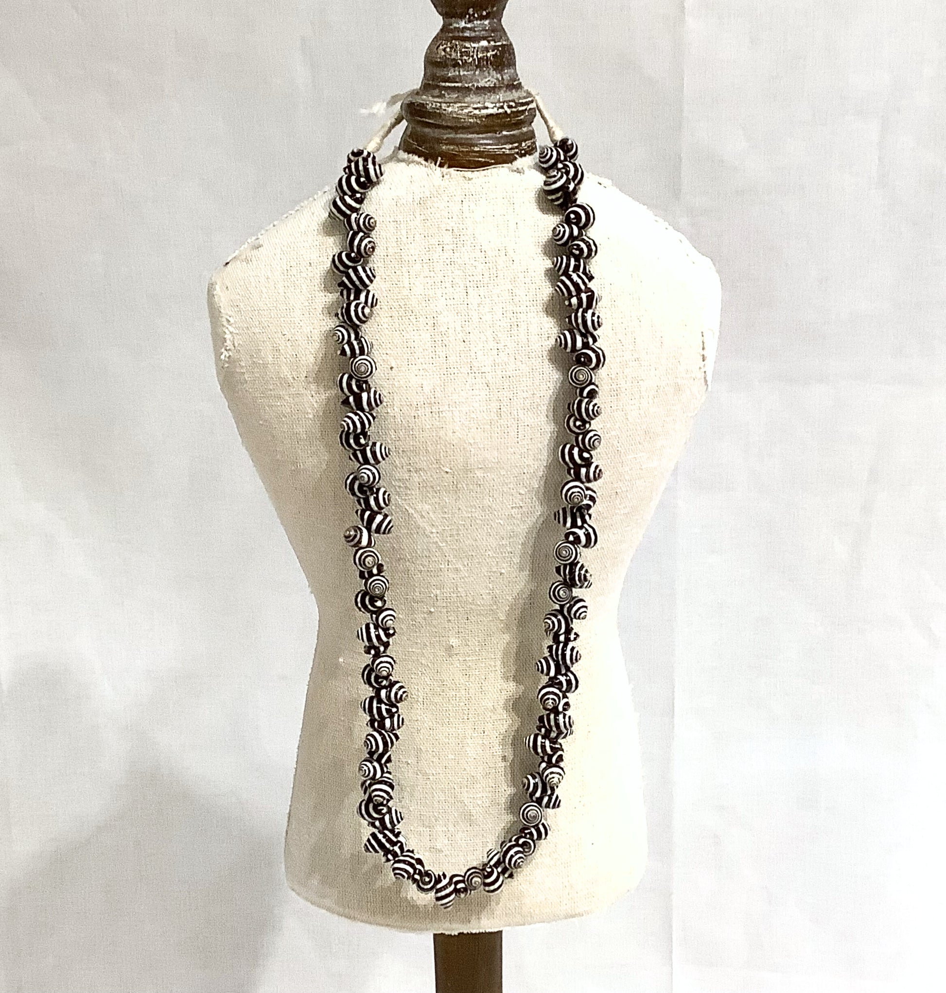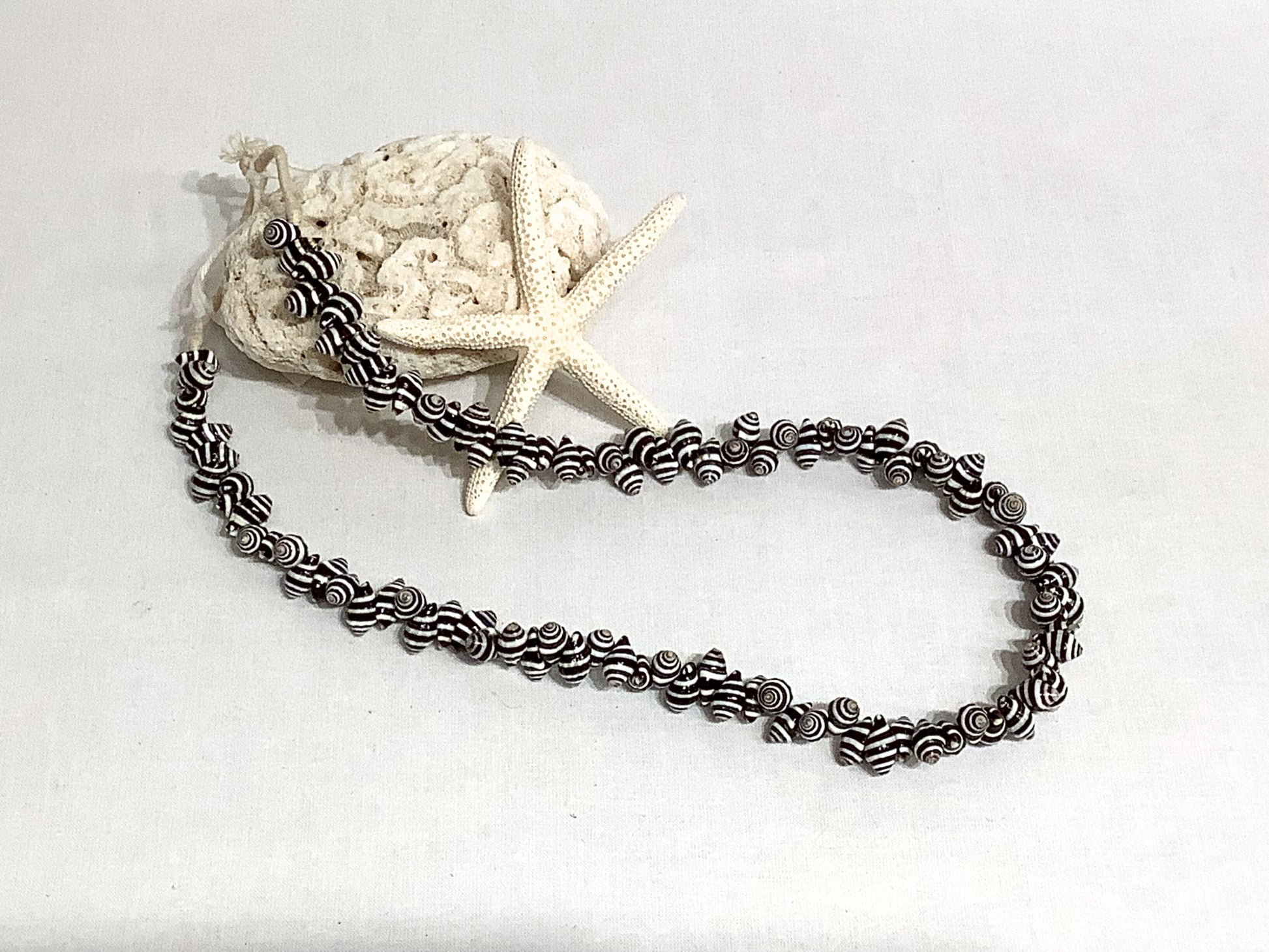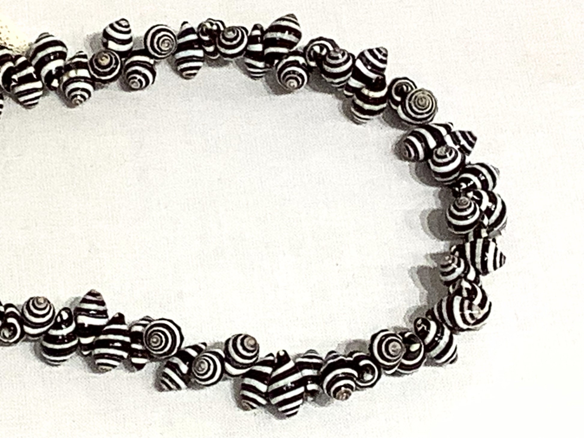 Vintage stand of zebra whelk shells, which naturally form beautiful black and white stripes. There are 100 individual shells strung together on think cotton cord. Used as a necklace, they pair with both casual and evening attire, or separate them and use individual shells for trim on decorative items.